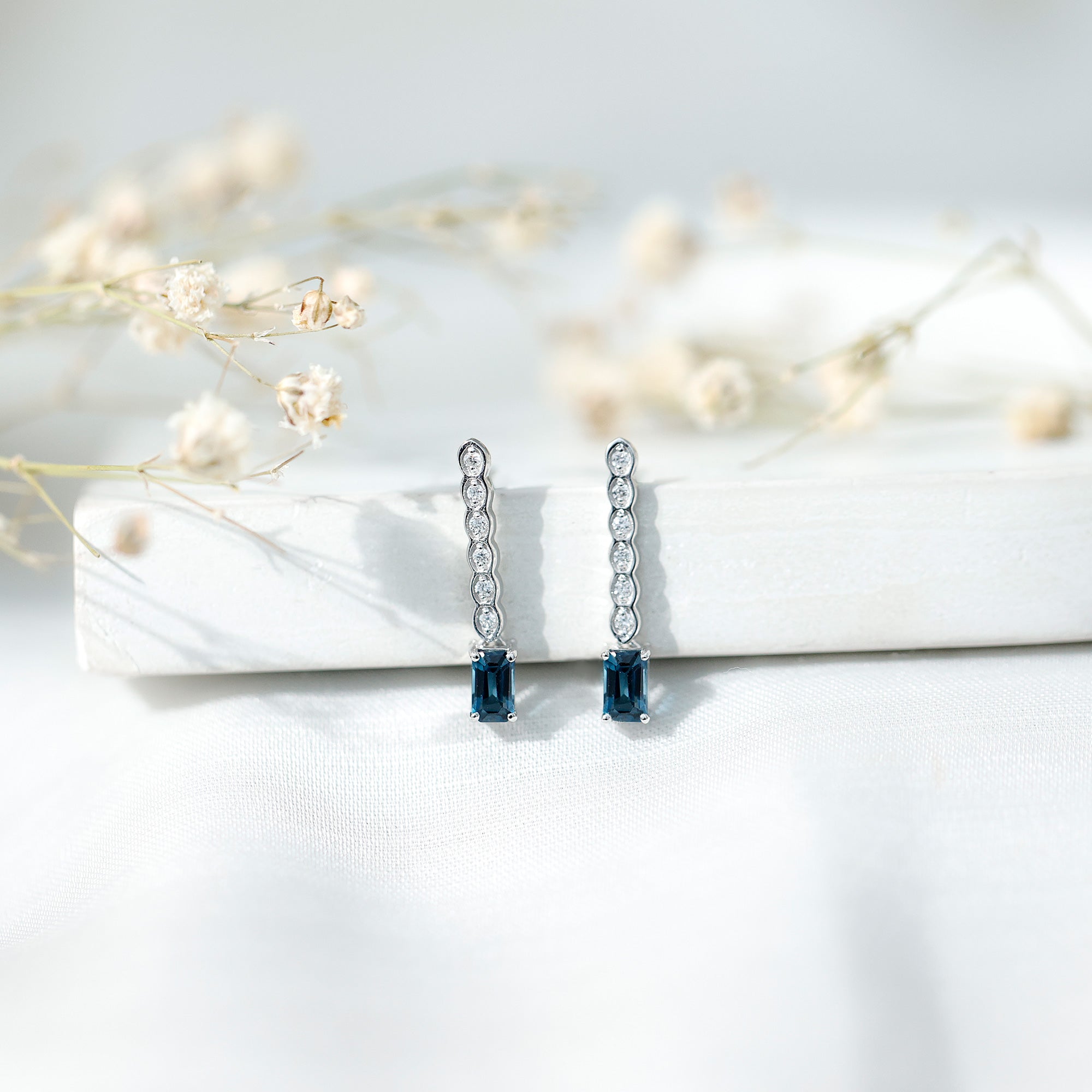 Let your look flow effortlessly with every step in these stunning London Blue Topaz Dangle Earrings. Designed with just the right balance of elegance and simplicity, this pair adds a graceful charm that works for both everyday wear and special moments. Handcrafted in 14k white gold plated silver, each earring begins with a sleek, polished vertical bar that features a delicate line of round brilliant cut lab grown diamond stones. These sparkling accents add a subtle shimmer, perfectly complementing the elegant drop that follows. Hanging gently from the base of the bar is a beautifully cut 3X5 MM emerald cut London Blue Topaz, held securely in prong setting that lets the stone move with you, catching light from every angle. Whether you are stepping into a meeting or out for a special night, these Dangle Drop Earrings offer the kind of polish that feels effortless. Screw back closures ensure a snug and secure fit, giving you peace of mind so you can wear them all day without worry. Lightweight yet full of presence, these Topaz Drop Earrings are easy on the ears while being high on style.