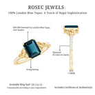 Honor enduring and profound love with this elegant London Blue Topaz Engagement Ring, crafted with significant meaning and timeless elegance. At its heart lies an emerald cut London Blue Topaz, measuring 6X8 MM, securely held in a prong setting. Flanking the central stone, intricate Celtic knot designs impart a unique significance. These infinite loops symbolize love, loyalty, and an unyielding connection that endures. They embody the unbreakable bond between two individuals. To enhance its brilliance, the band features small round diamonds of HI-SI quality. These diamonds provide a striking contrast to the rich blue topaz, resulting in a harmonious design. This Celtic Engagement Ring is meticulously crafted from high-quality metal and AAA quality london blue topaz. It transcends mere jewelry, serving as a representation of strength, unity, and everlasting love. Simply suits all types of occasions and detailed enough to feel exceptionally special, this Blue Topaz and Diamond Ring perfectly blends beauty and affection. An exquisite choice for anyone who appreciates tradition, symbolism, and refined design.