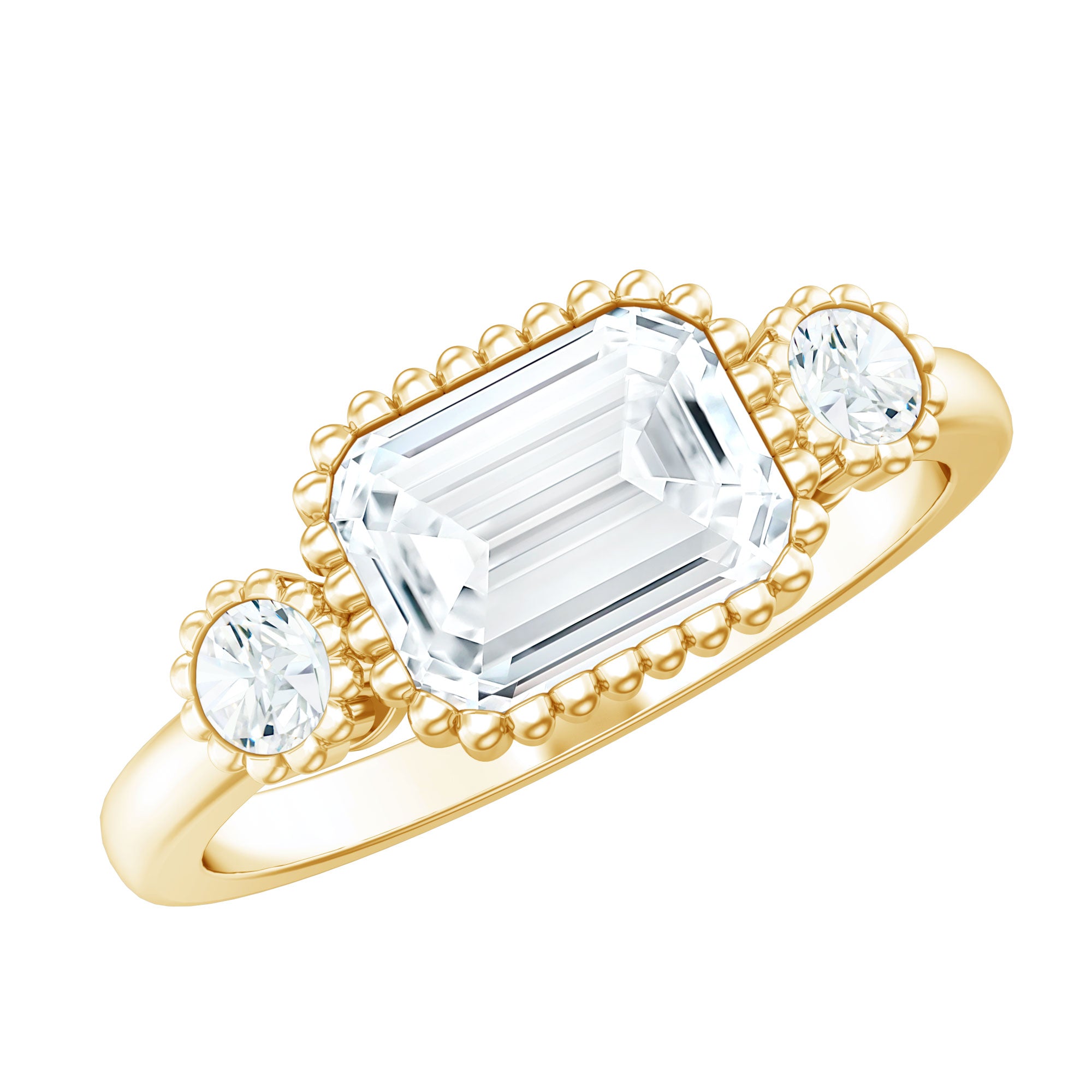 This elegant 3 Stone Engagement Ring is a perfect choice for someone who loves a classic look with a modern touch. At the center of the 3 Stone Ring is a 6X8 MM emerald cut moissanite, placed in an east-west style. On either side of the main stone sit 3 MM round moissanites, adding extra brilliance to the design. Each stone is D-VS1 quality, known for its bright white color and excellent clarity. Together, the three stones represent your past, present, and future, a meaningful symbol of your journey as a couple. The delicate beaded bezel setting around each stone gives a touch of vintage charm. The Emerald Cut Moissanite Engagement Ring is smooth and comfortable to wear, perfect for everyday use or to mark an important moment like an engagement or anniversary. This Emerald Cut East West Ring is simple, stylish, and filled with meaning. It is a thoughtful choice for someone who appreciates beauty in the little details. Whether you are proposing or simply showing your love, this Three Stone Moissanite Ring is a piece that will always remind them of your commitment and care.