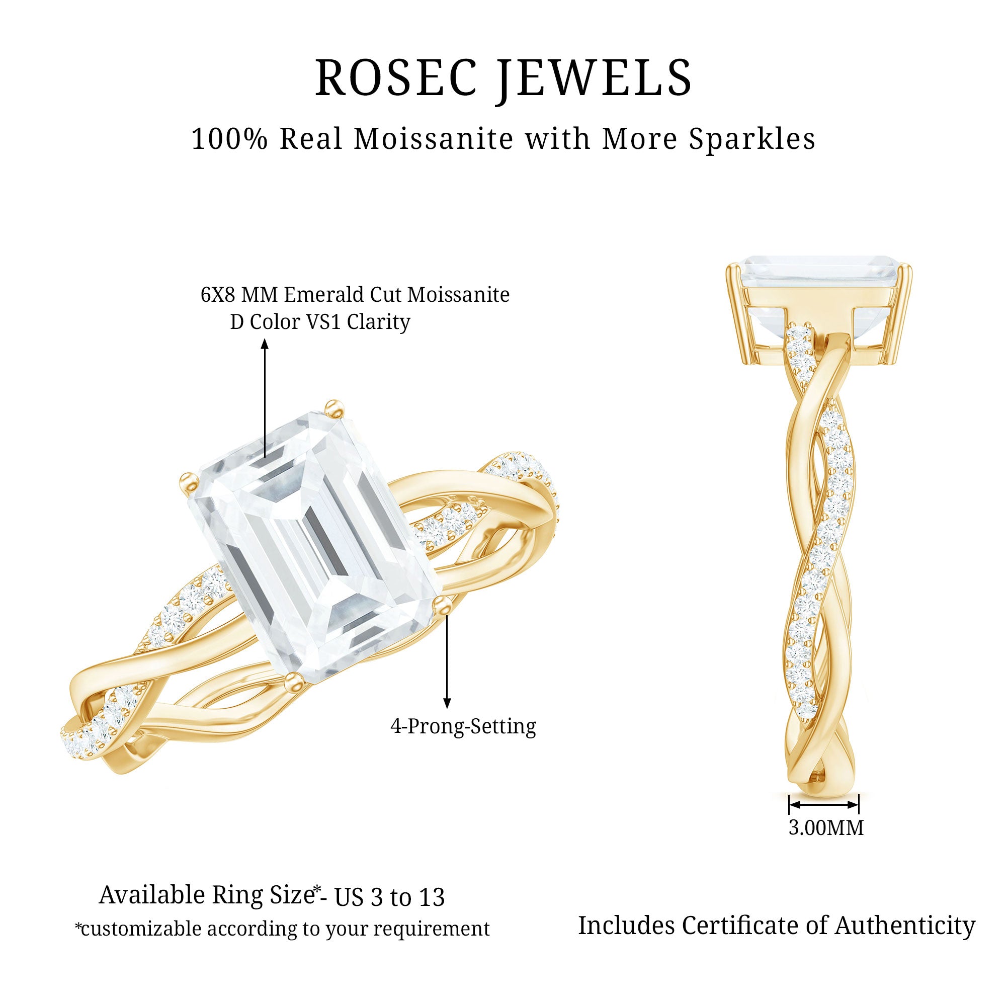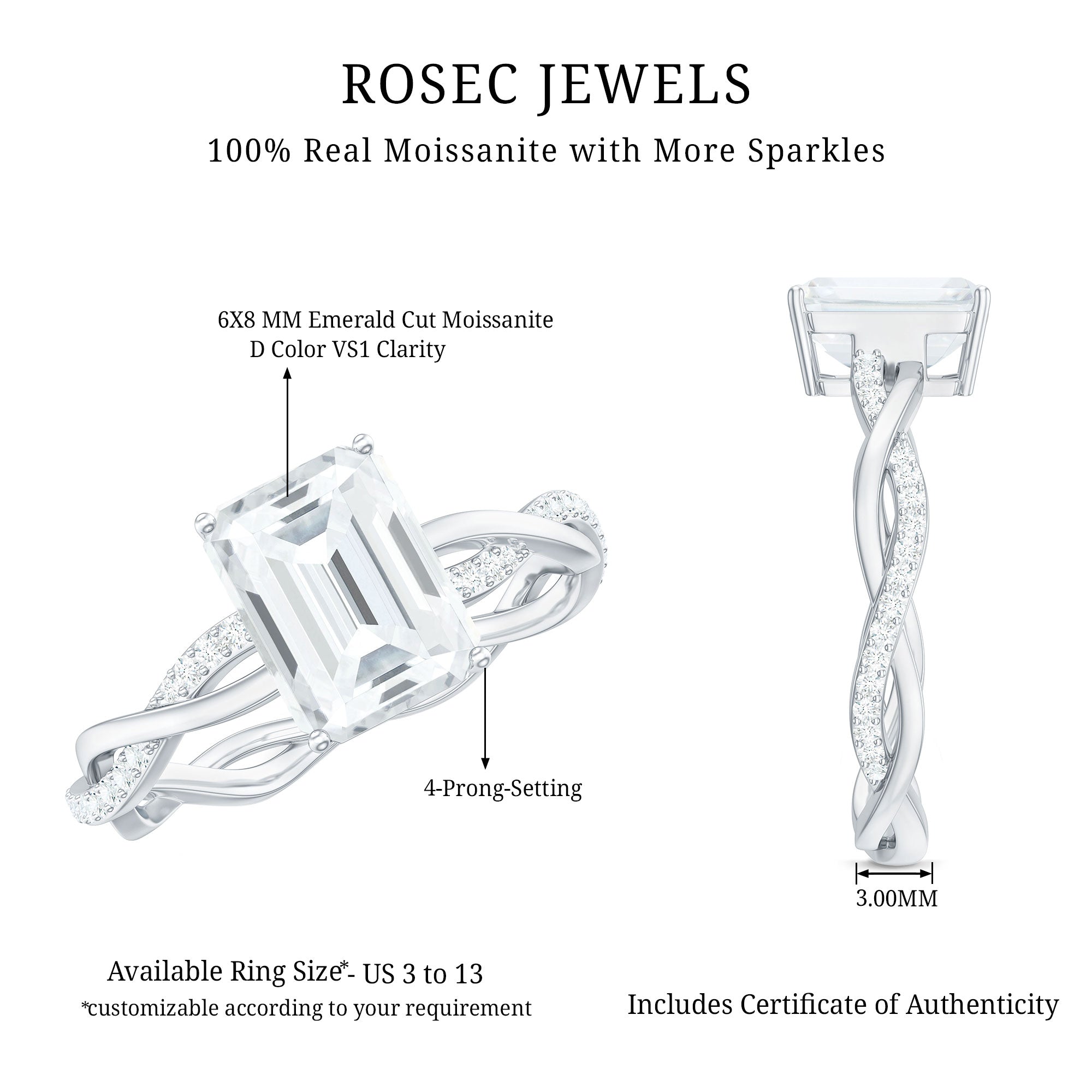 This Solitaire Moissanite Engagement Ring perfectly blends classic elegance, modern style, and romance. It features a stunning 6X8 MM emerald cut moissanite set on a beautifully braided band with secure prong setting. Crafted with D-VS1 Quality moissanite, this Emerald Cut Engagement Ring effortlessly captures attention without uttering a word. The braided shank, embellished with delicate round moissanite, gives it a handcrafted feel that is both contemporary and meaningful. Just like your love story, it is a unique mix of beauty and strength. Whether you are proposing or treating yourself to something special, this 1 Carat Moissanite Ring comes in a signature jewelry box and is available in US sizes 3 to 13, ensuring every hand sparkles just right. It is ideal for celebrating a new chapter or simply showing someone they mean the world. This Braided Engagement Ring strikes the perfect balance between tradition and a fresh outlook. Whether you are enhancing the yes moment or gifting it as a self-love token, you really can not go wrong with this gorgeous piece that is designed to shine for a lifetime.