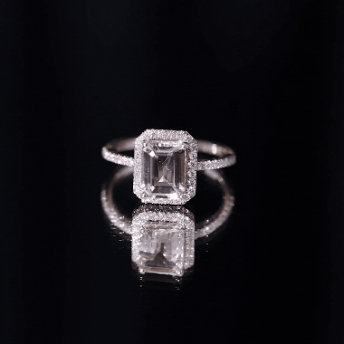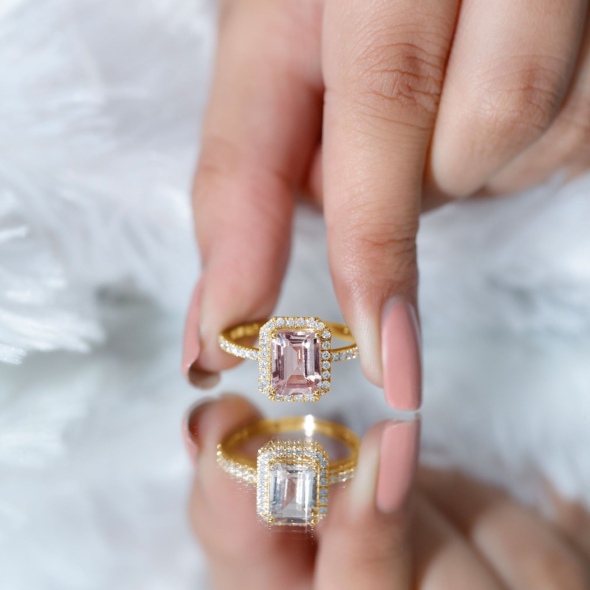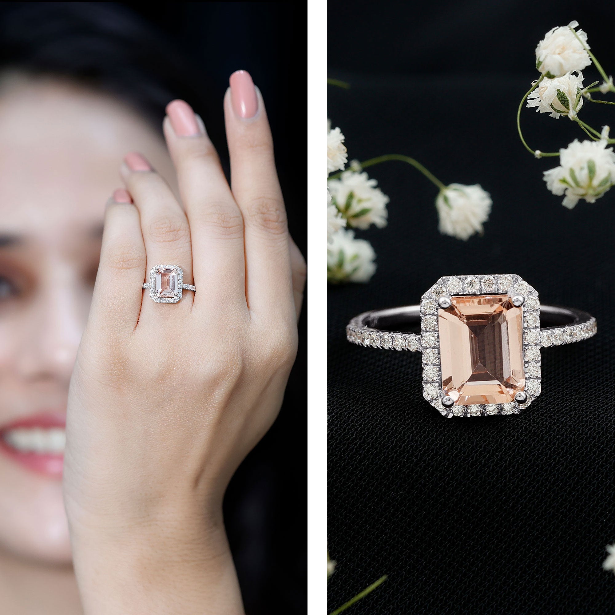 Elegantly adorn her finger with this Morganite Engagement Ring. It features a stunning 7X9 MM Emerald Cut Morganite gemstone set as a center stone and is surrounded by a halo of Diamond. A simple yet elegant choice for your special day.