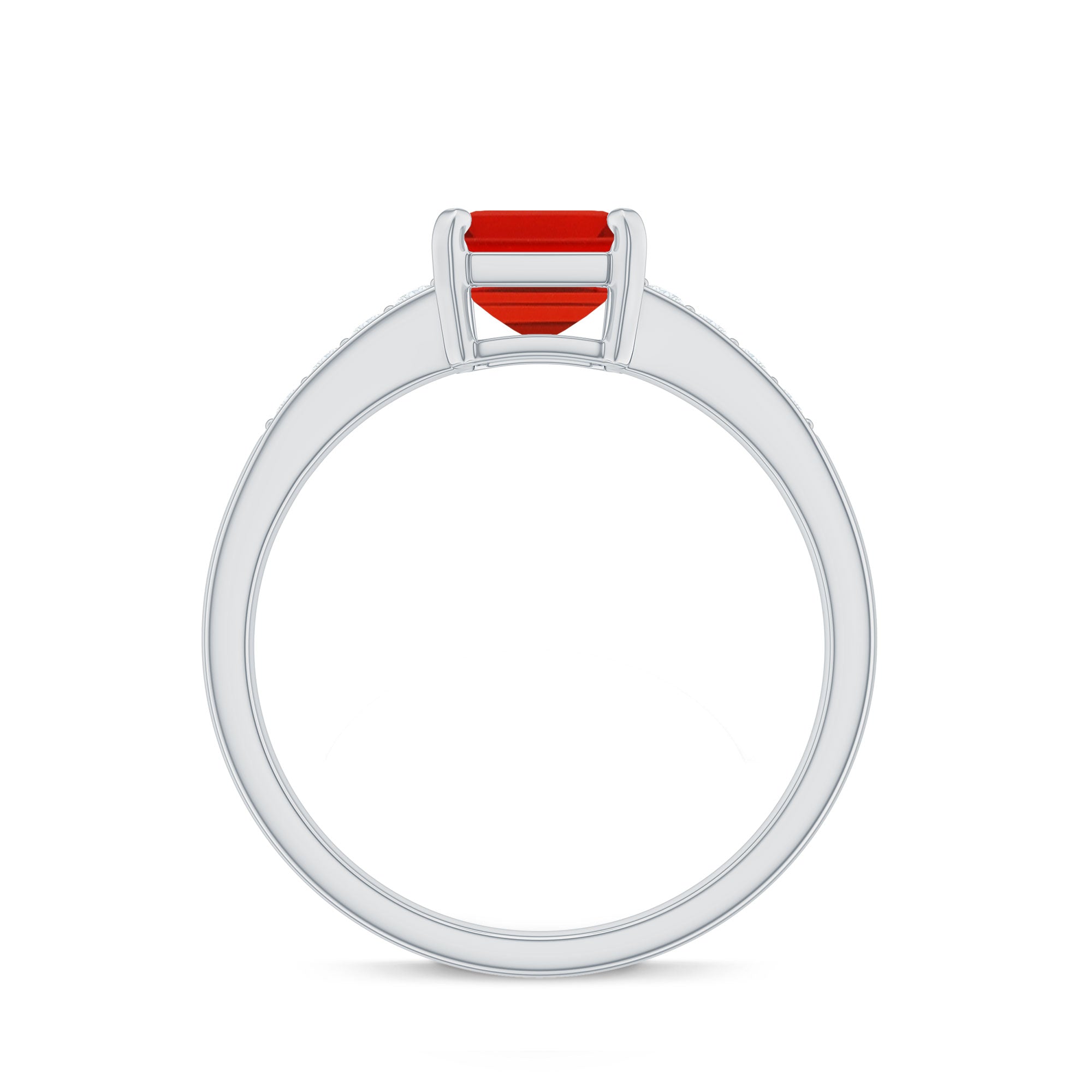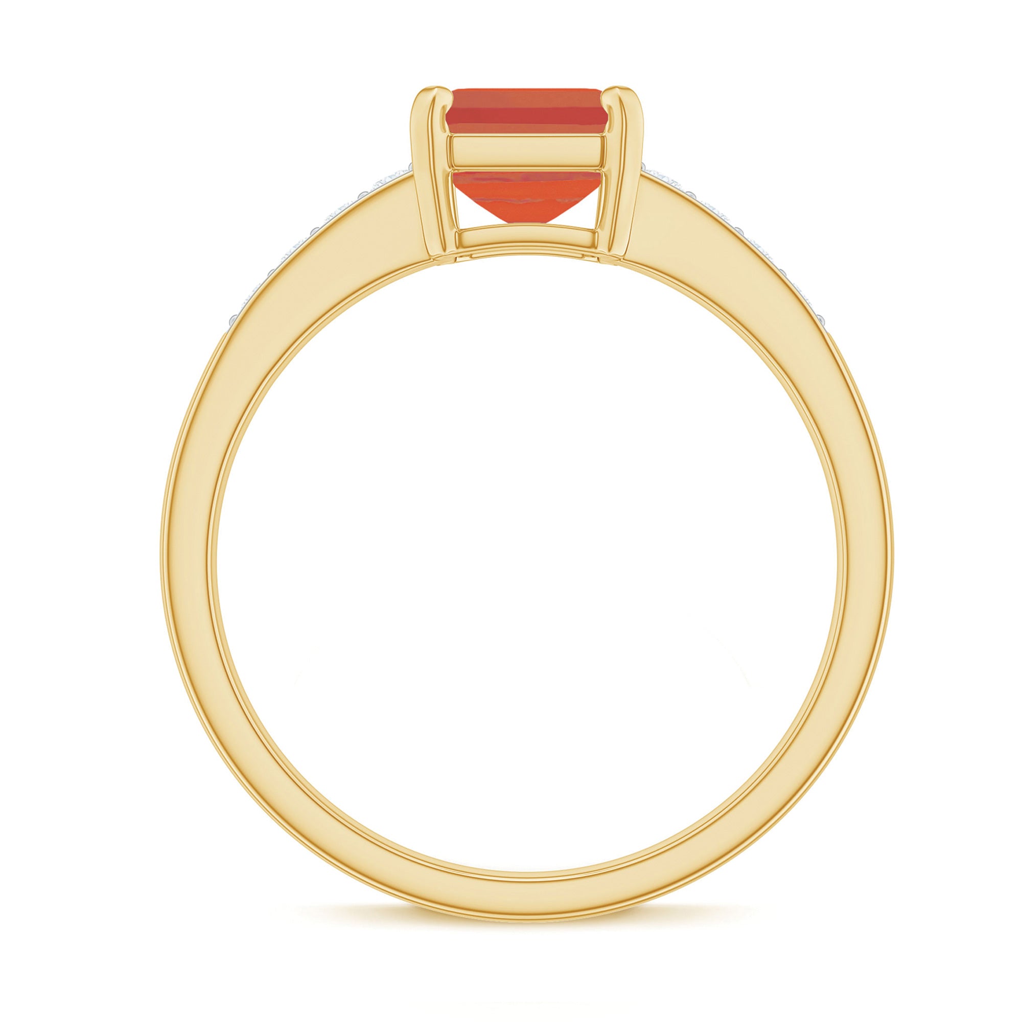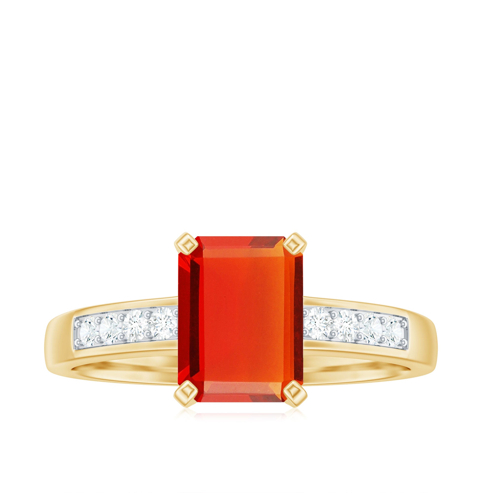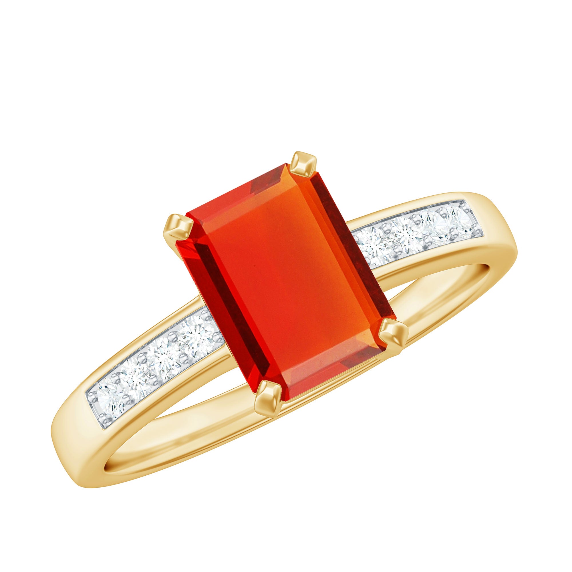The emerald cut features step-cut facets and a rectangular silhouette that accentuates the gemstone’s clarity and depth of color. Fire opal is admired for its vibrant hues that range from golden orange to fiery red tones. Diamond accents within the design introduce subtle brilliance that complements the opal’s vivid character.