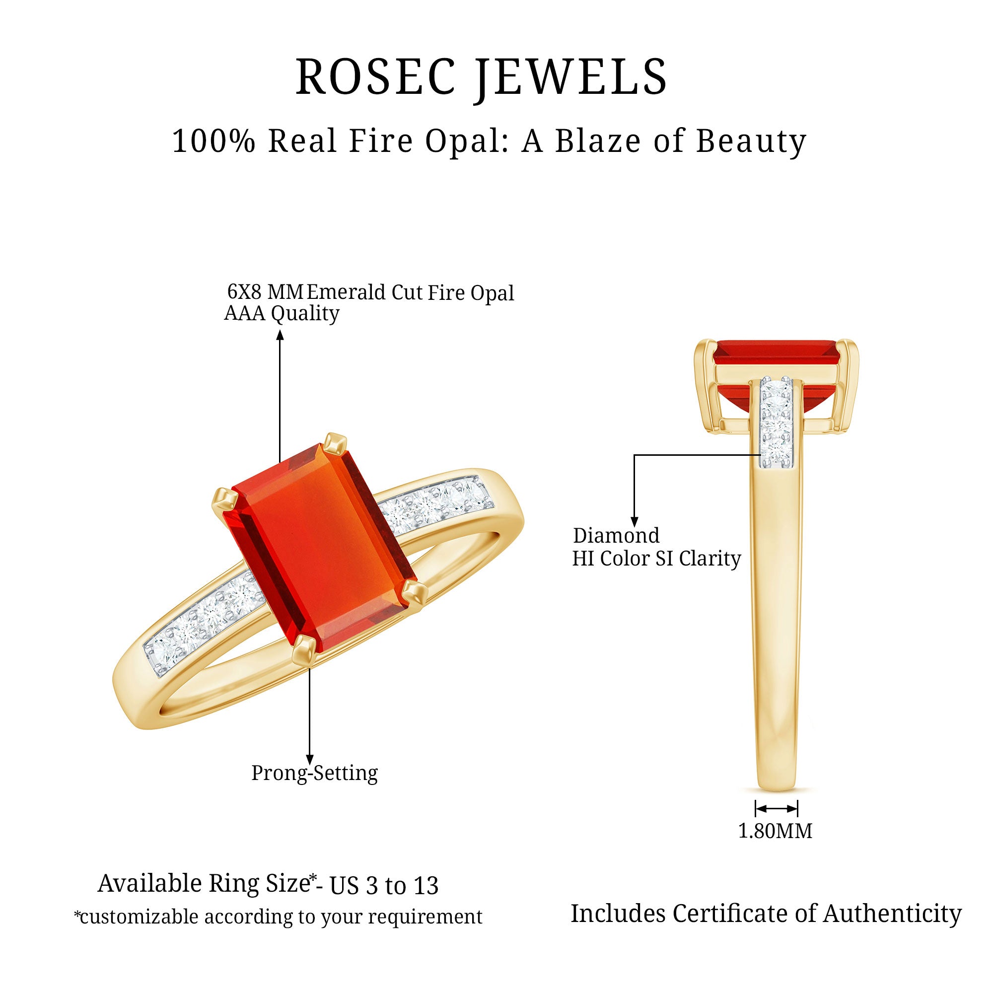 The Emerald Cut Real Fire Opal Solitaire Engagement Ring with Diamond centers its design around the vivid character of fire opal. Known for its warm tones and luminous appearance, the fire opal gemstone creates a striking focal point within a refined solitaire setting. The elongated emerald cut enhances the stone’s natural color while presenting a clean and elegant profile.