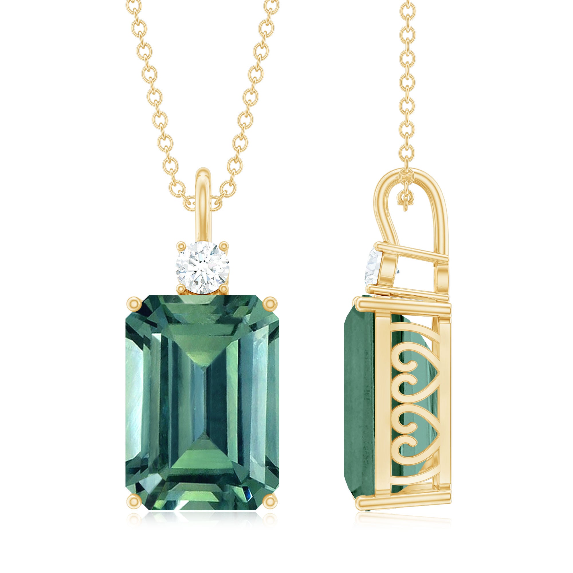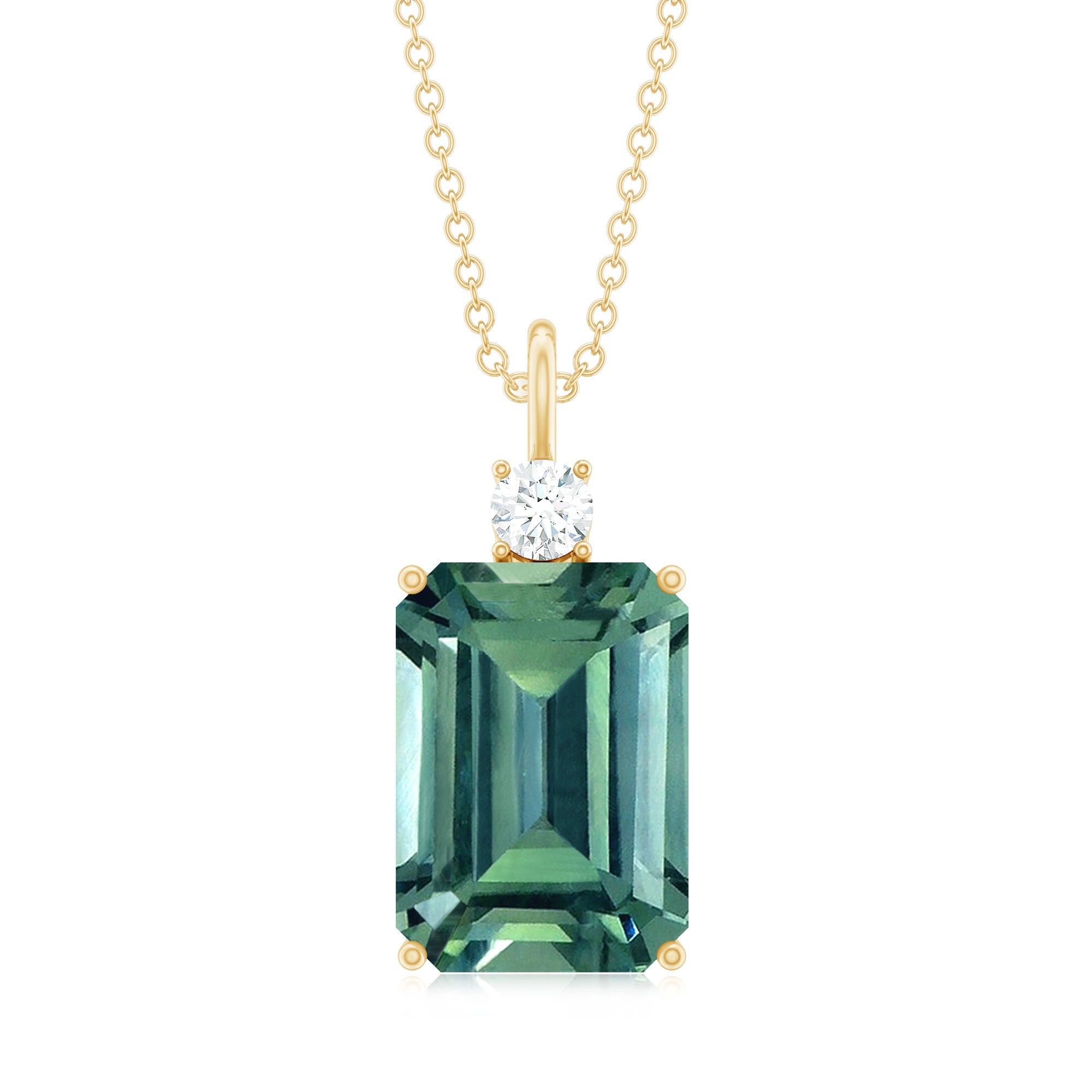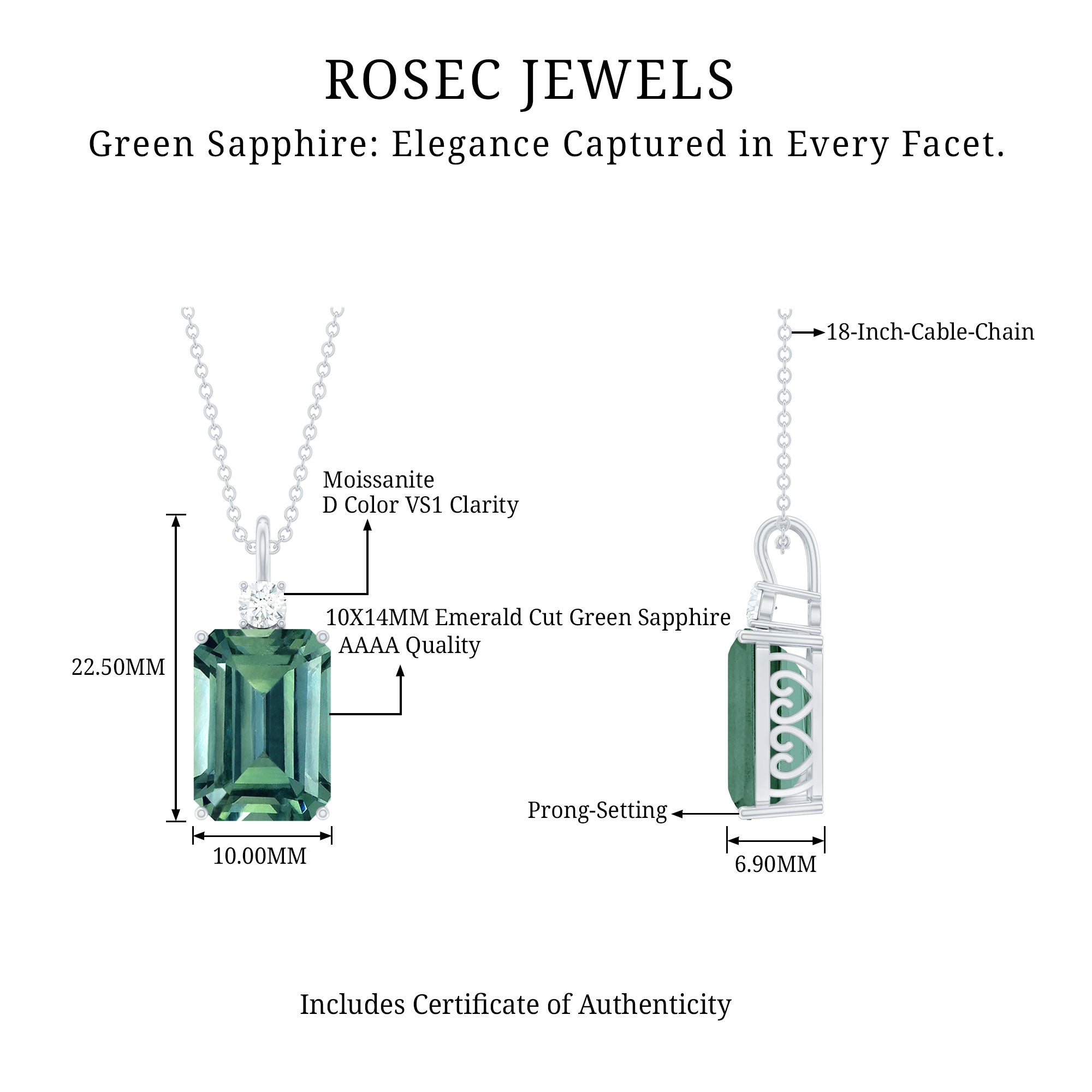 Enhance your elegance with the Solitaire Pendant, boasting a striking Emerald Cut Created Green Sapphire Gemstone in a Prong Setting. Small Brilliant Round Cut Moissanite adorns the pendant, accentuating the meticulous craftsmanship and captivating color combination. The necklace exudes sophistication and timeless allure, perfect for complementing any ensemble with grace.