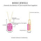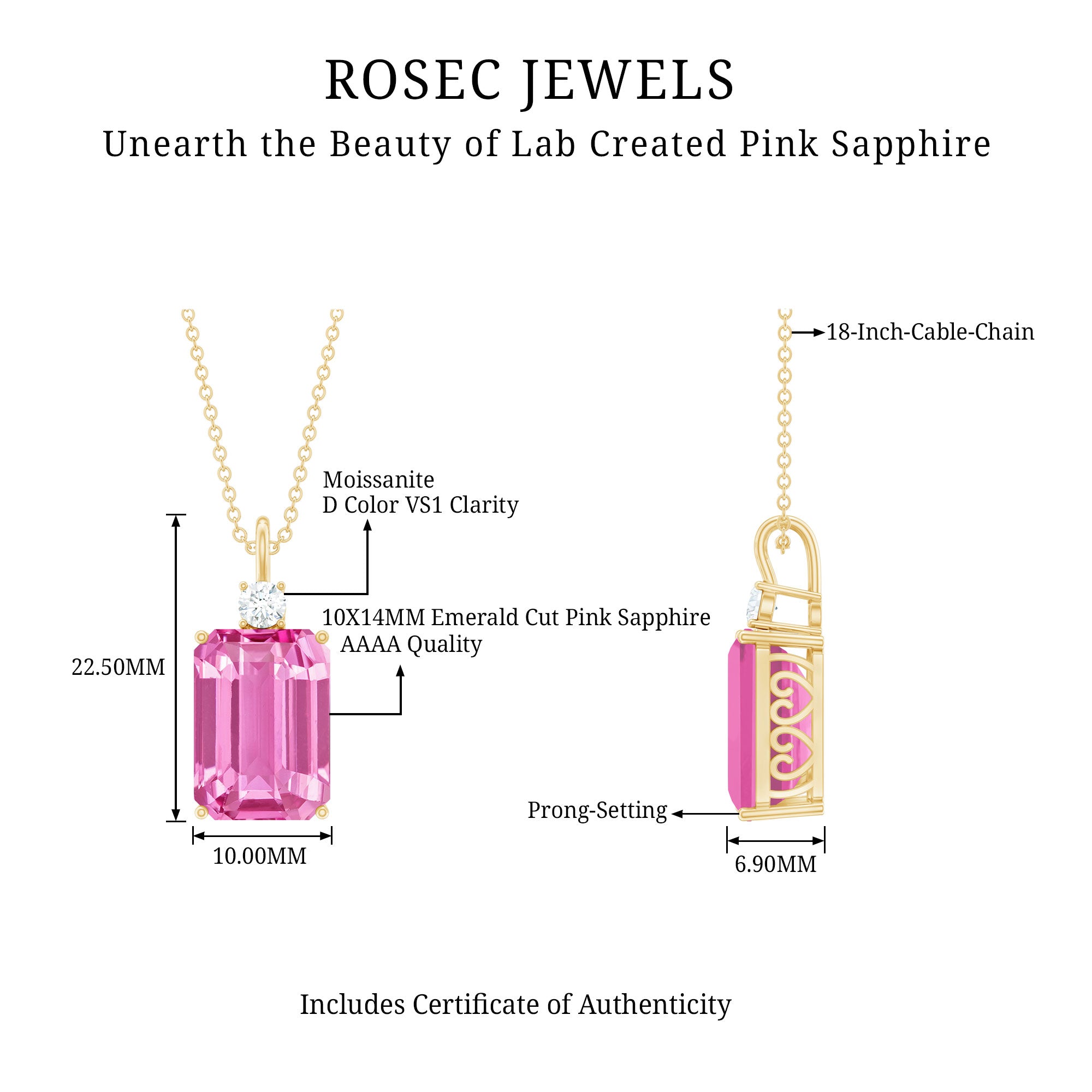 Indulge in elegance with the Solitaire Pendant, featuring a striking Emerald Cut Created Pink Sapphire Gemstone in a Prong Setting. Adorned with small Brilliant Round Cut Moissanite, the meticulous craftsmanship and captivating color combination exude sophistication and timeless allure. Its the perfect accessory to complement any ensemble with grace and style.