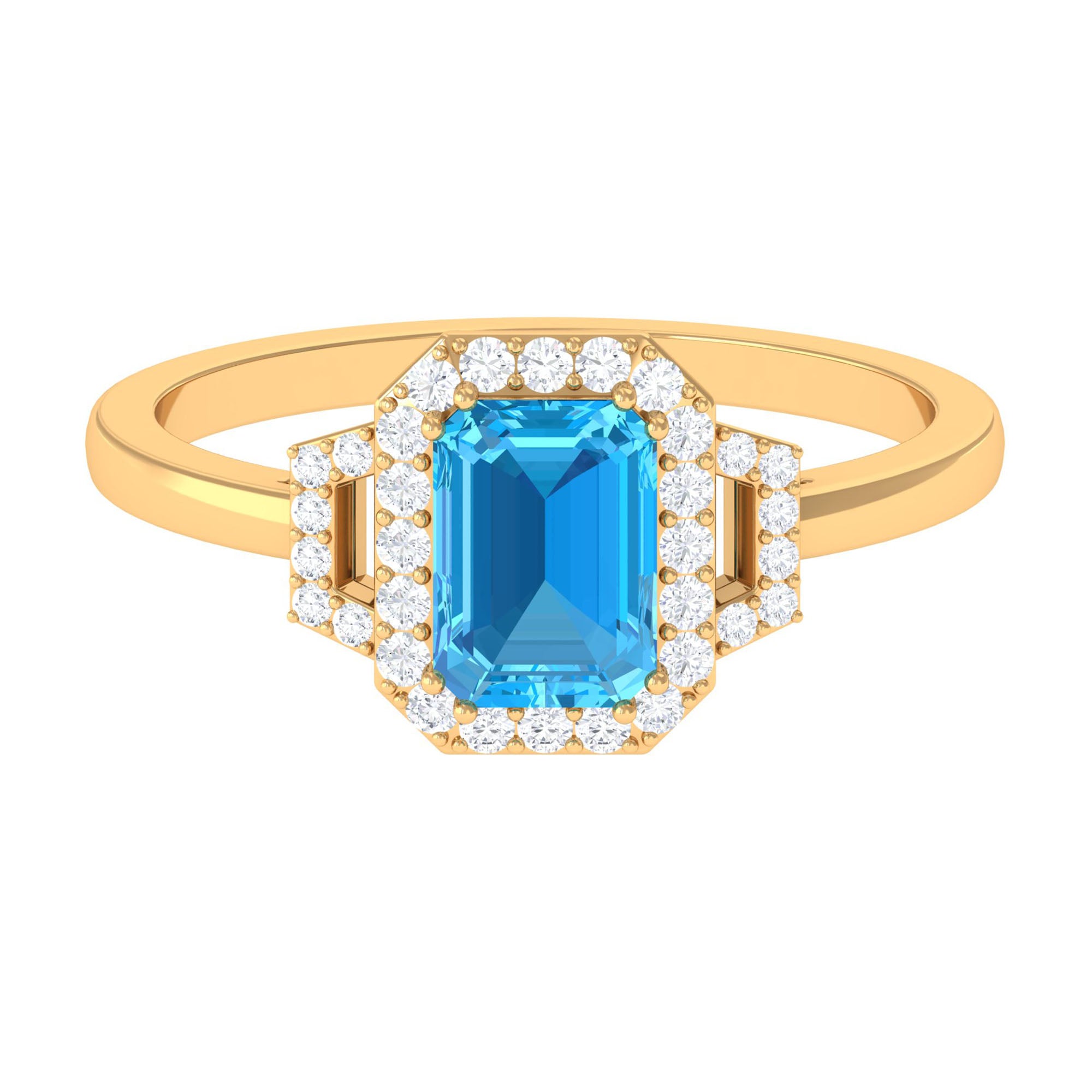 Make a bold statement with this magnificent engagement ring, featuring a stunning Emerald Cut-cut Swiss Blue Topaz centerpiece, encircled by a sparkling halo of round Diamond stones. Crafted with high-quality gold, this Swiss Blue Topaz ring is designed to last a lifetime. The striking Blue of the Swiss Blue Topaz is beautifully complemented by the brilliance of the Diamond stones. With its unique and eye-catching design, this ring is the perfect symbol of your love and commitment to your significant other. Its a truly exceptional piece that will leave your loved one speechless.