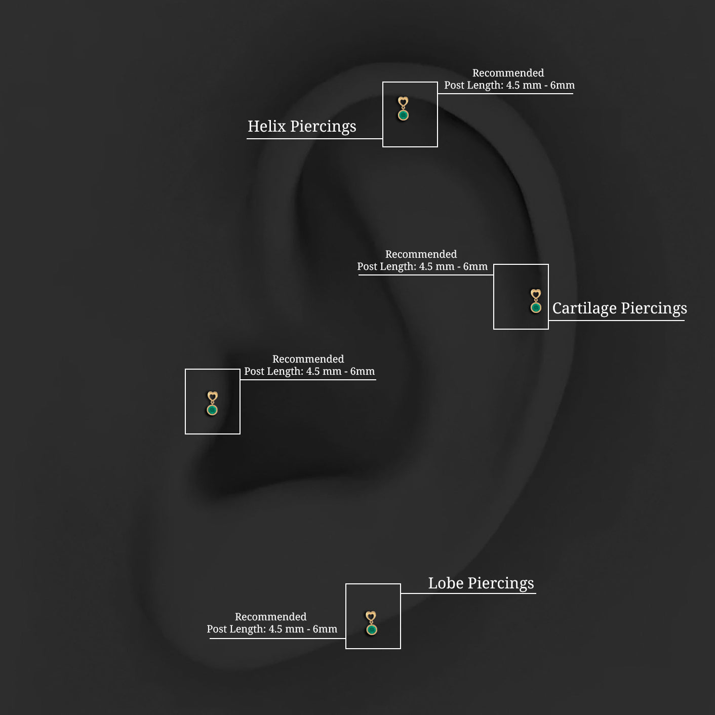 Charming! Get this Emerald Heart Drop Earring embellished with a Round Emerald set in Bezel Setting and a heart design on the top, crafted with Solid Metal.The Flat Back Closure ensures a secure fit, making this Heart Earring suitable for Tragus, Helix, Cartilage, or Upper Lobe Piercings.Take your fashion to new heights by pairing this Cute Earring with other ear jewelry, curating a dazzling ensemble thats bound to steal the spotlight at any gathering.Make your special ones day extra-lit with this stunning Green Emerald Earring. Its the ultimate gift for birthdays or anniversaries.