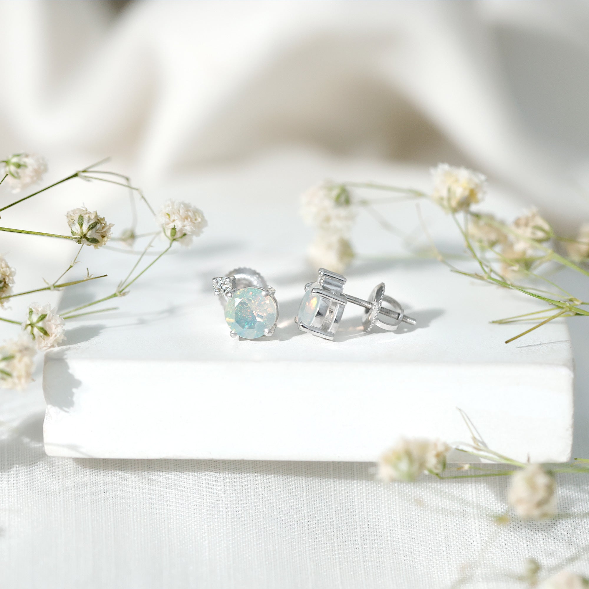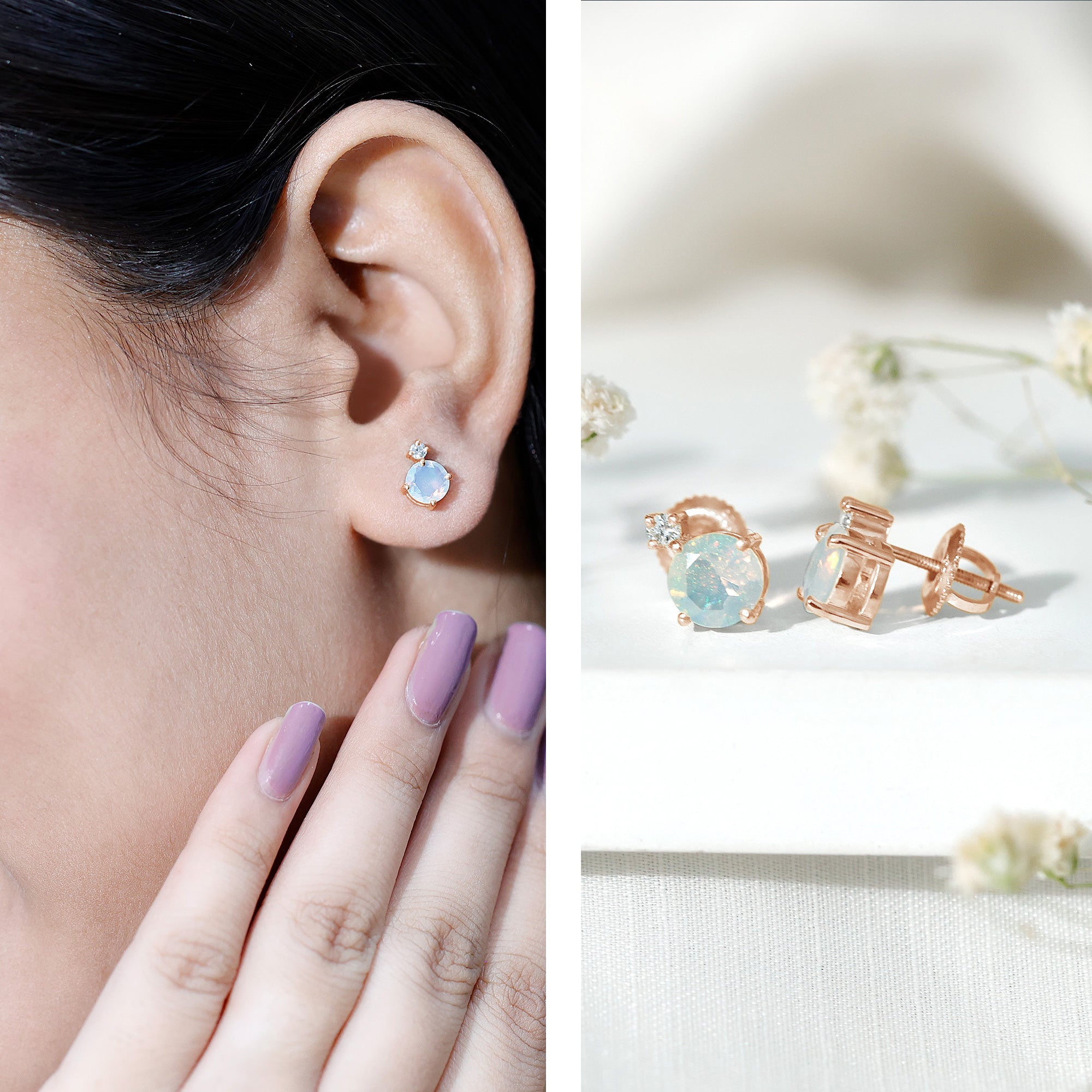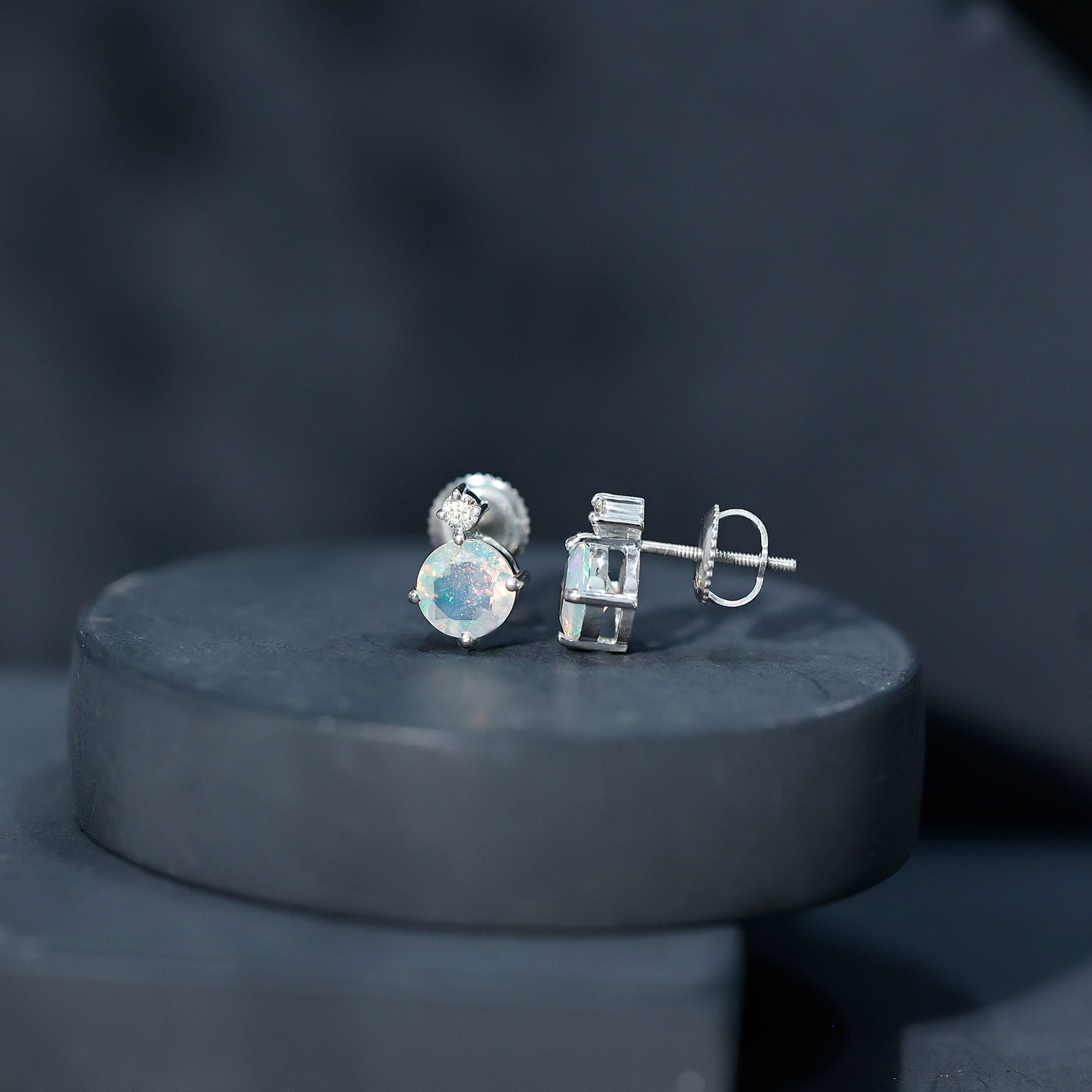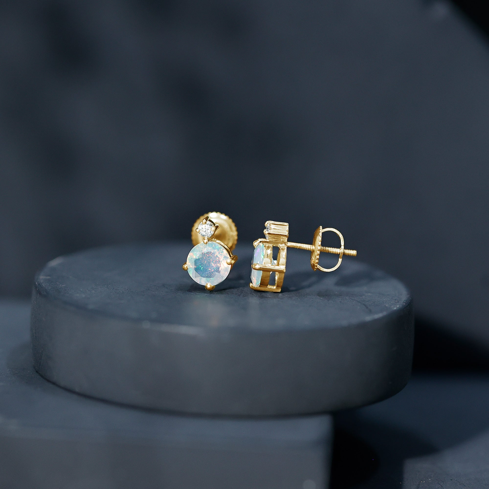 Had your eyes got stuck on such beautiful Opal Stud Earrings that truly reflect like a rainbow? Having a lustrous shine these Solitaire Stud Earrings are subtle and gives a sophisticated look to your outfits. Adorned with Round Shape Ethiopian Opal in Prong Setting with a Diamond on the top of these Stud Earrings. Being classic and effortlessly stylish these Screw Back Stud Earrings are perfect for the day or the evening date. These Opal Studs makes stunning October birthstone jewelry and are the jewelry box staple.