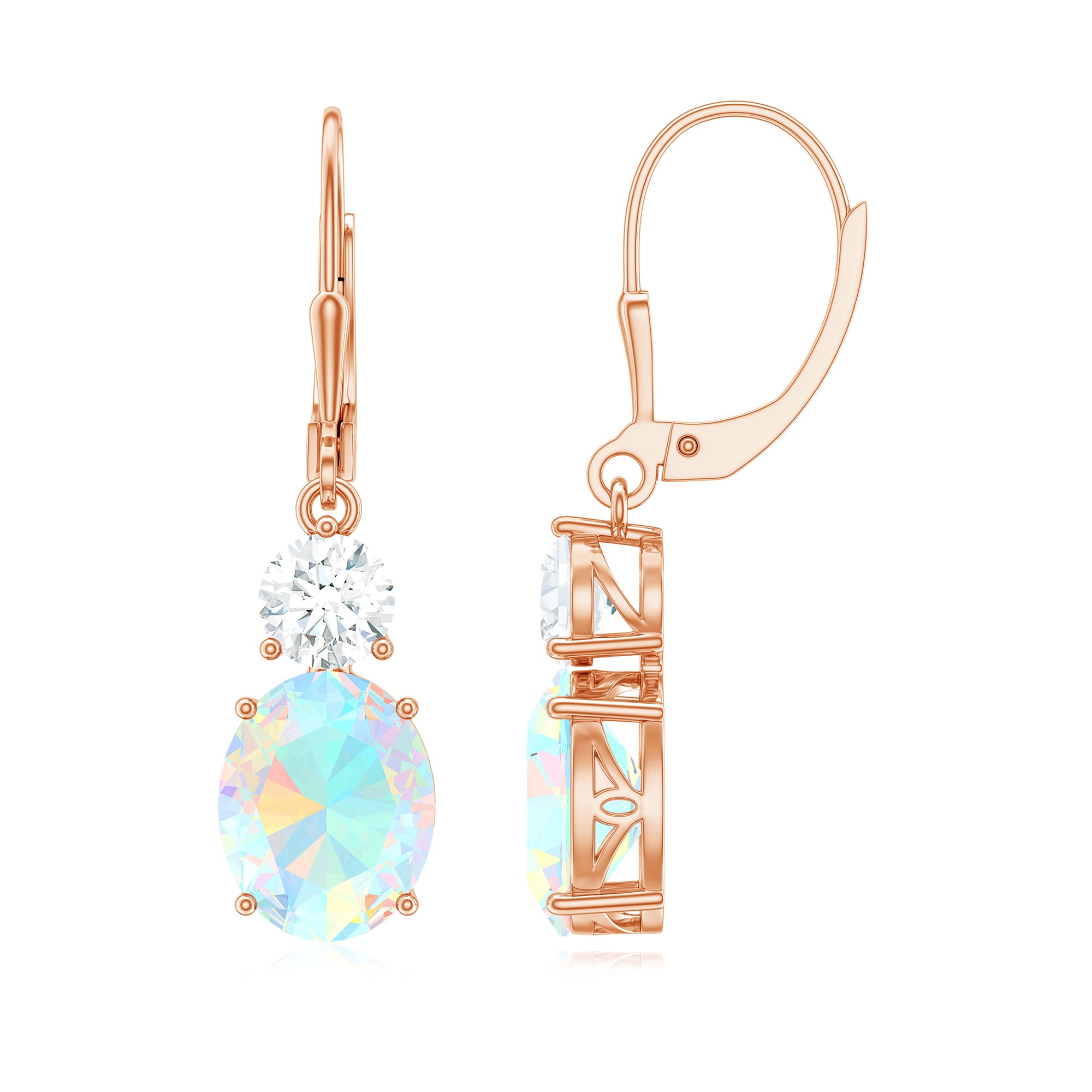 Bring the spotlight on you when you wear these Ethiopian Opal Earrings and add a touch of mystique to your look. Showcasing 8X10 MM Oval Ethiopian Opal elegantly set in prong setting complimented by Round Moissanite shimmers from the top. To make you feel comfortable all the time, these opal earrings come with lever back closures that keep each earring safe in the right place. Sparkle up your look and capture the essence of timeless elegance with these drop earrings, a pair that is best suited for every occasion.