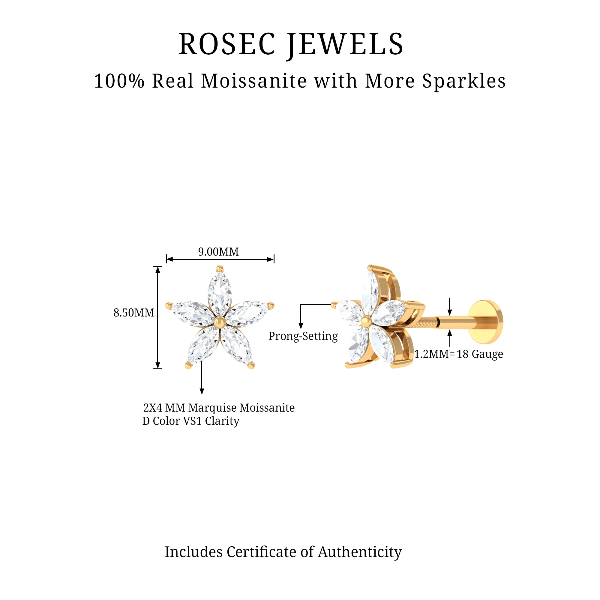 The Moissanite Flower Earring is a dazzling and elegant piece of jewelry that features five sparkling Marquise Cut Moissanite arranged in the shape of a beautiful flower design. Style this Floral Earring on your Helix, Cartilage, or Upper Lobe Piercing and pair it with your favorite outfits. The Flat Back Closure will keep it comfortably secured in place.
