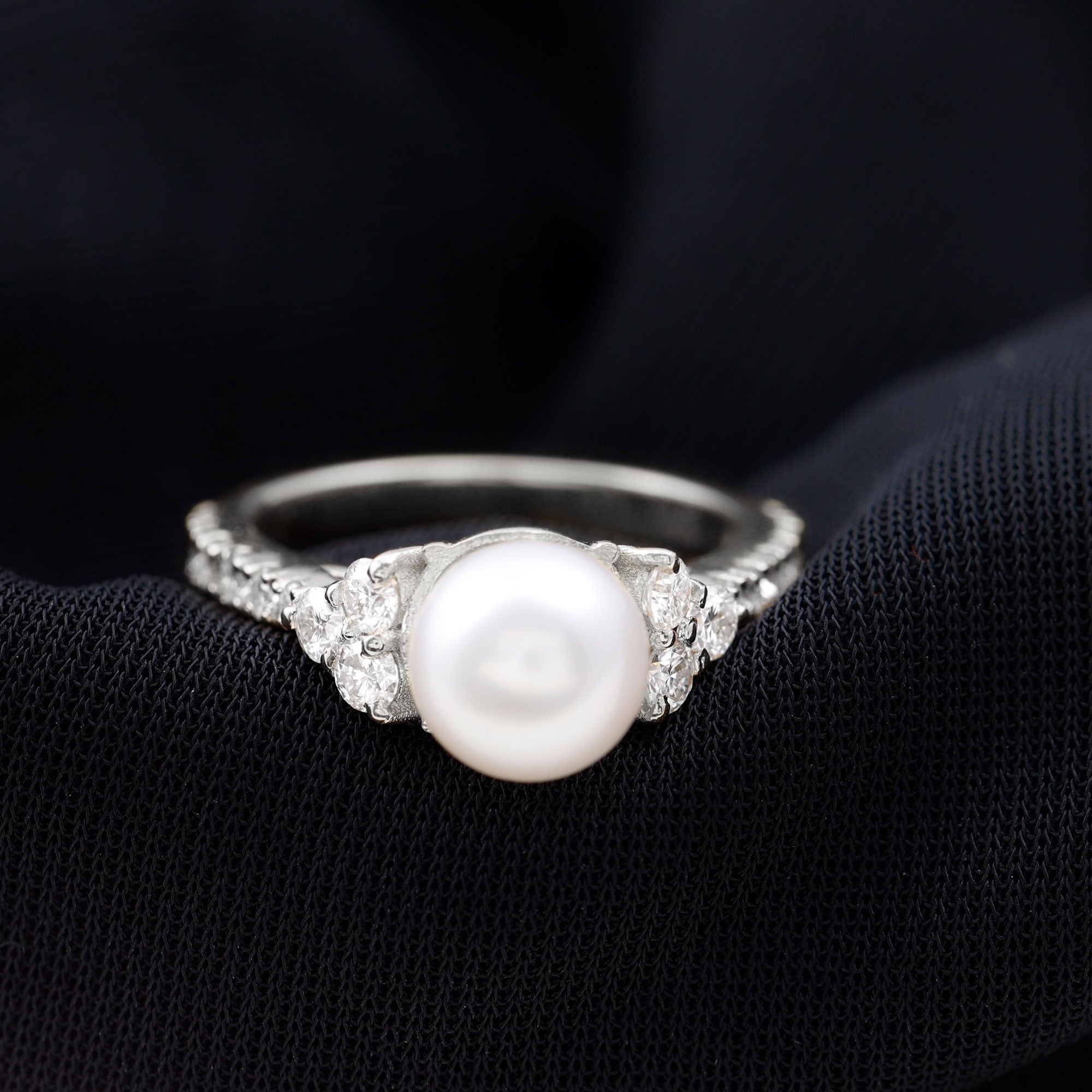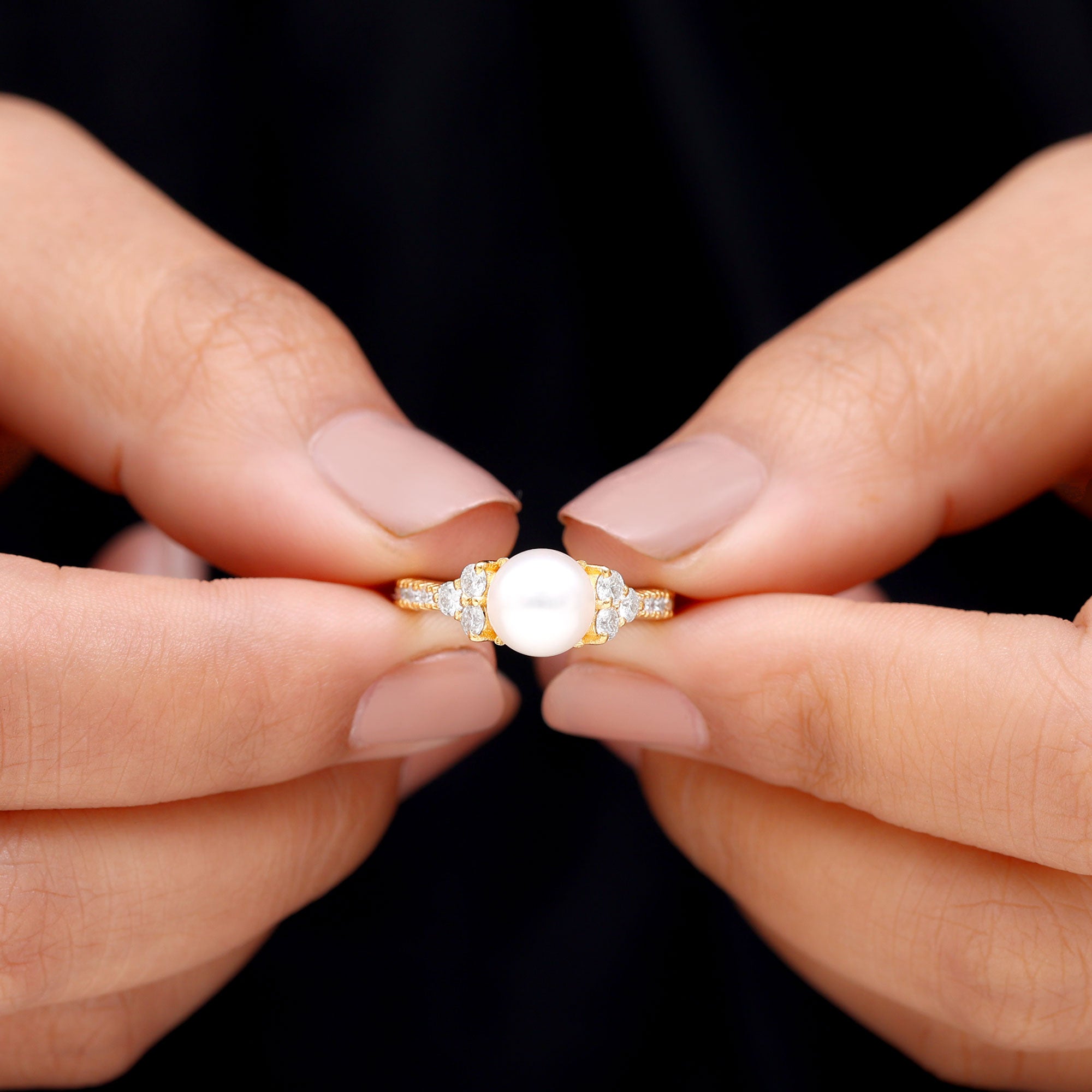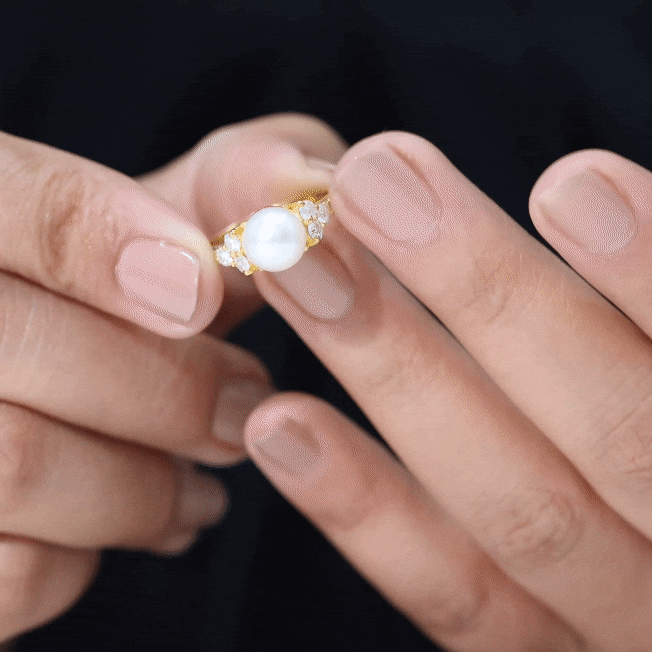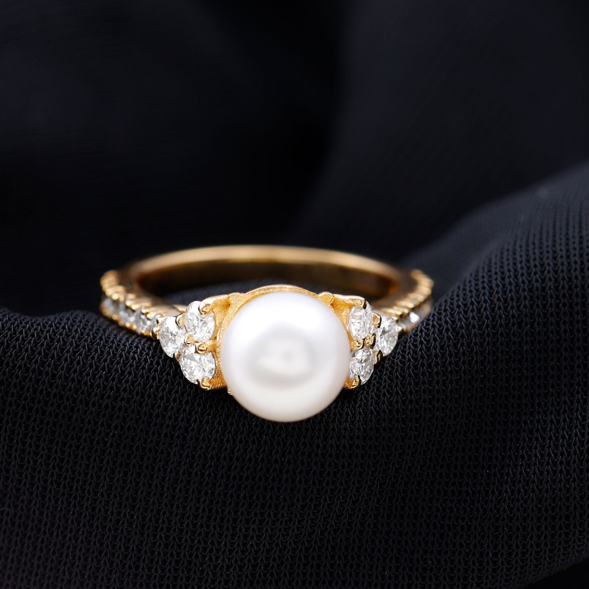Art Deco Engagement Ring is adorned with 8.00 MM Round Shape Freshwater Pearl as Solitaire and small Brilliant Round Shape Diamonds are set in a cluster form as a Side Stones. This Unique Ring is crafted in shining Solid Gold.
