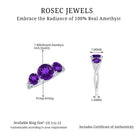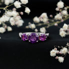 Celebrate the special occasion of your life by gifting your beloved this lovely Three Stone Ring adorned with round shape Amethyst in Prong Setting. This Anniversary Ring for Women is crafted with a Crossover Shank to make her fall in love with you all over again.