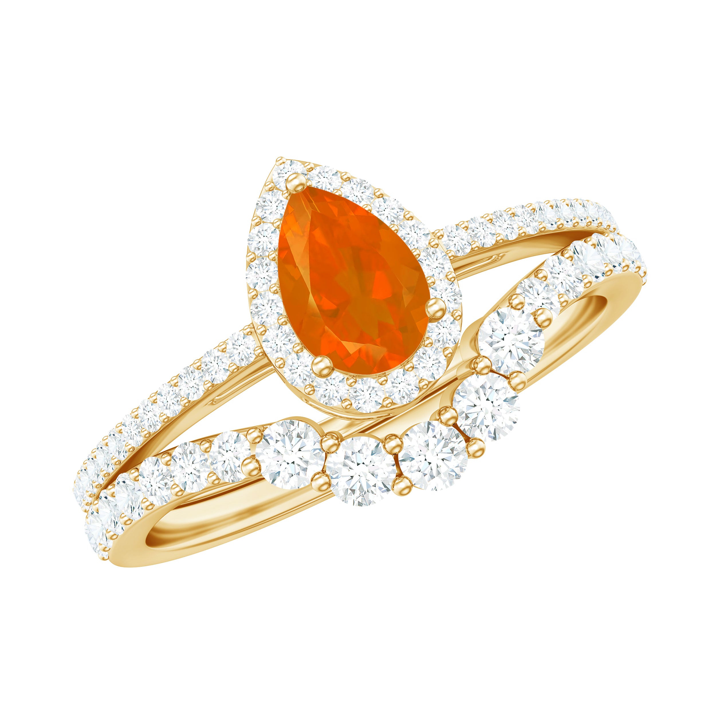 Fire Opal Designer Teardrop Ring Set with Moissanite Halo