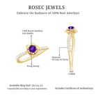 The Perfect Combination of Amethyst and Diamond in this Rose Flower Ring is mesmerizing. The Round Natural Amethyst is set in Centre of a Gold Petals of Rose Flower in the curved shank. Get this Floral Inspired Engagement Ring for your Blooming Lady Love, this Amethyst and Diamond Engagement Ring is a stunning jewelry, which she will cherish her whole life.