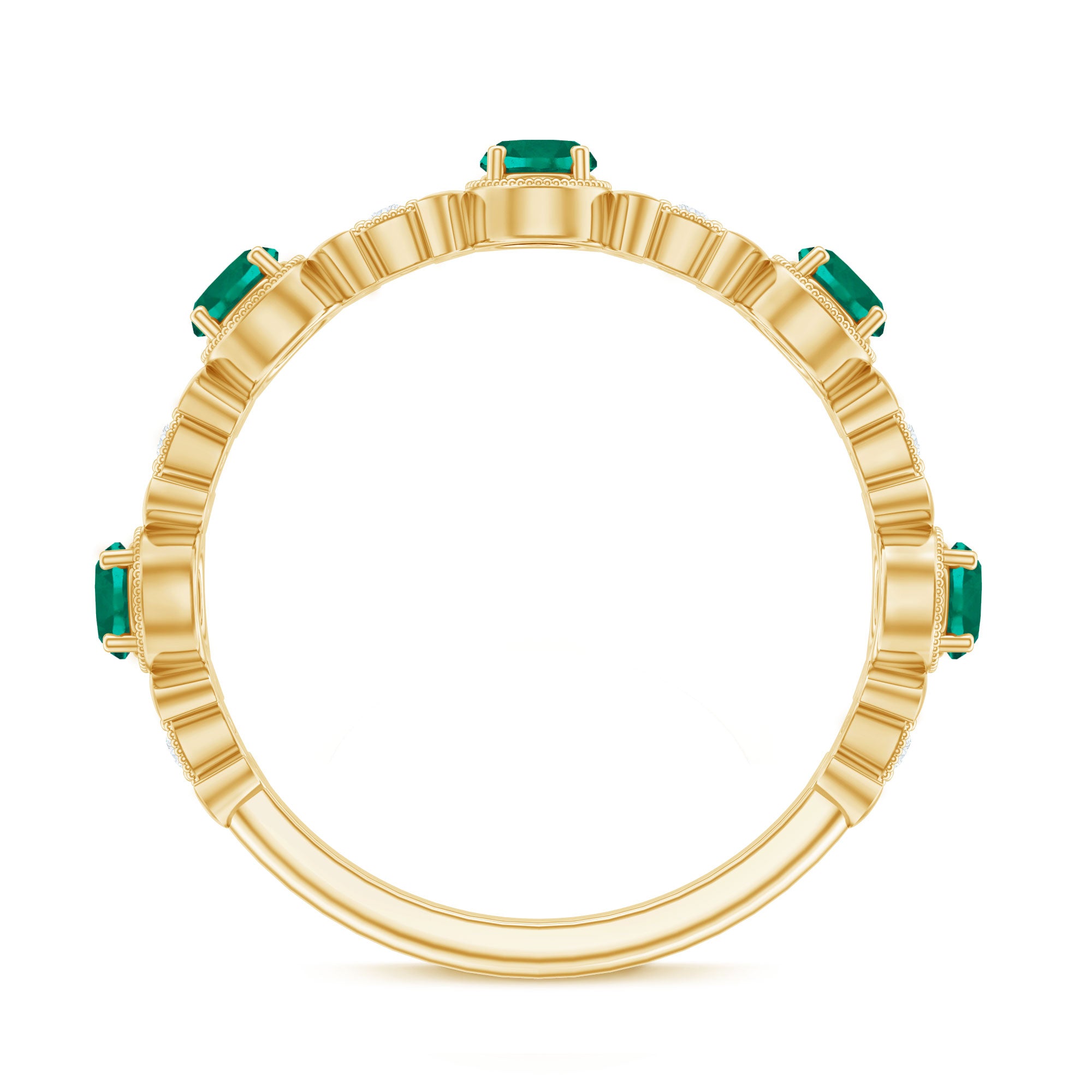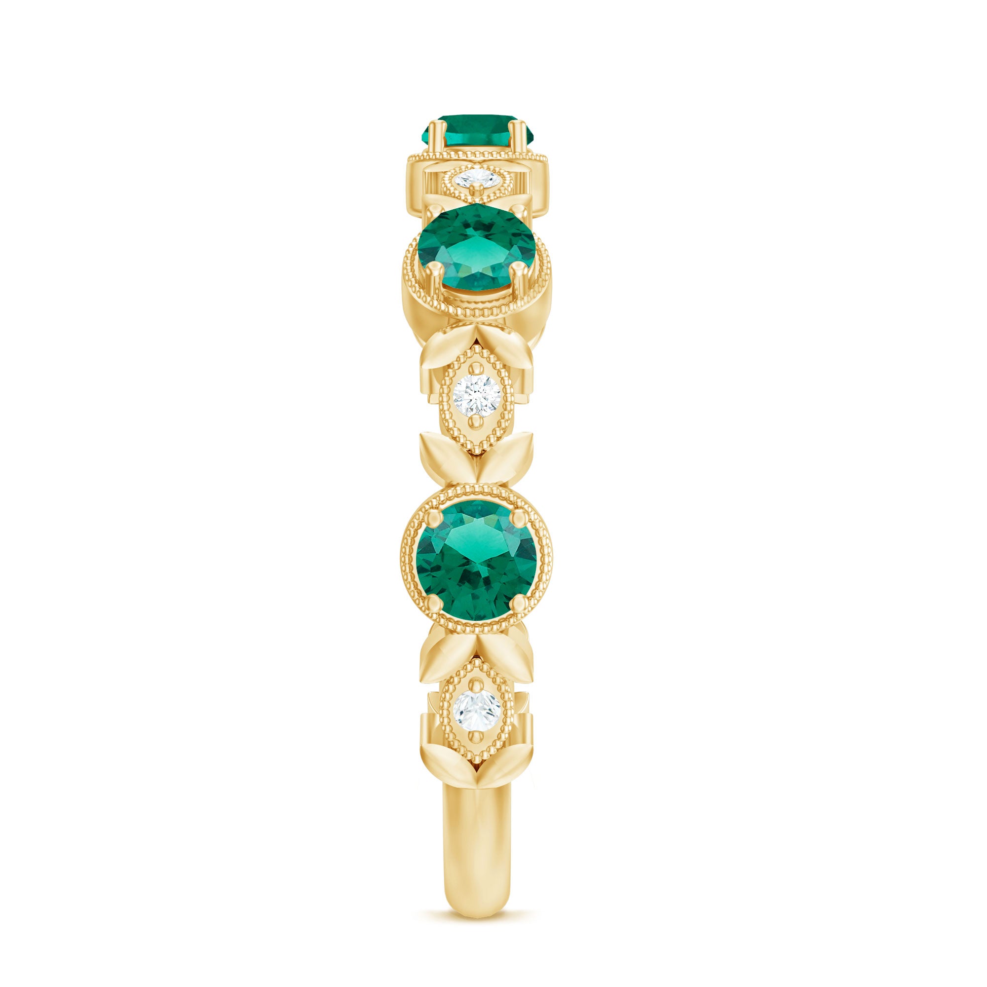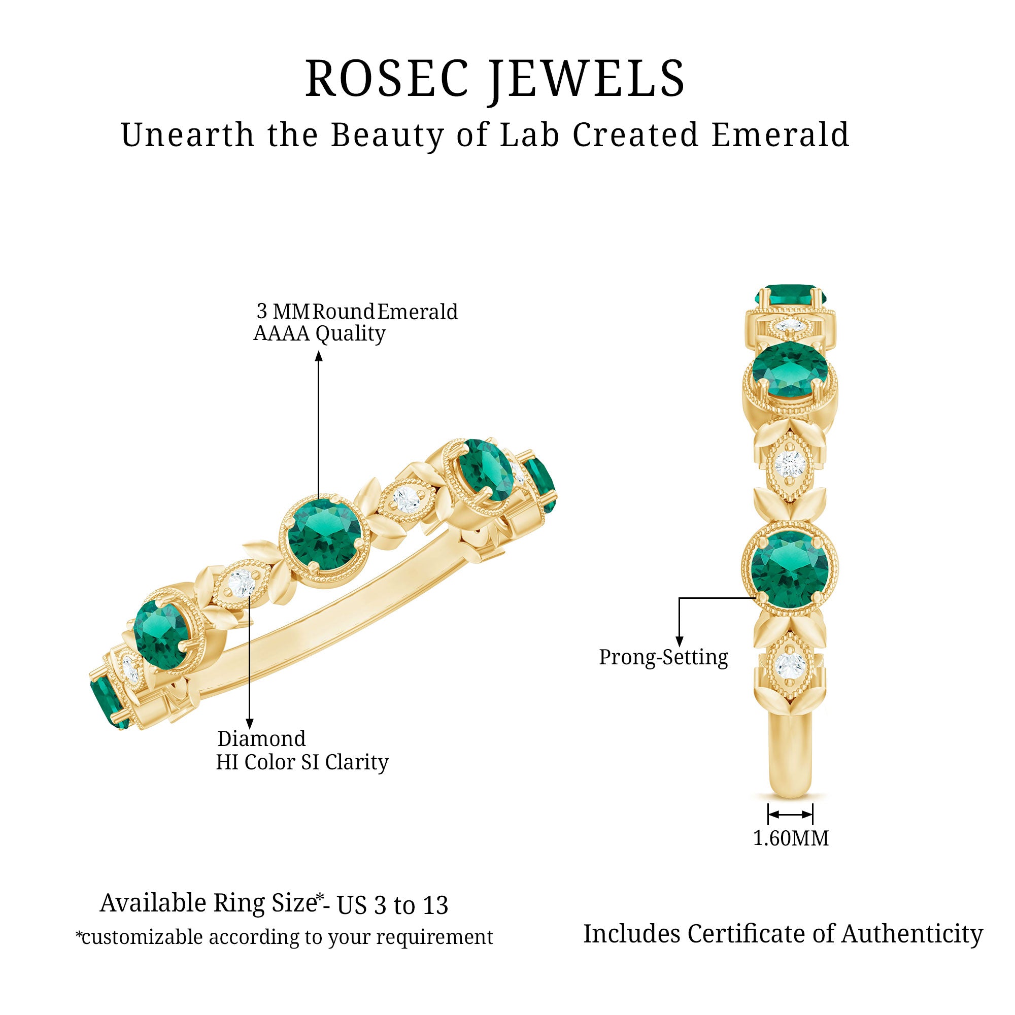 Present her this glamorous and sparkling Half Eternity Ring, designed to reflect the beauty and elegance of nature. This stunning ring is adorned with 3 mm Round Shape Lab Created Emerald stones set in Prong Setting and placed alternately with sparkling, dainty Diamond stones. The combination of vibrant green AAAA Quality Lab Emerald and dazzling HI-SI Diamond creates a perfect balance of color and brilliance. Surrounding the stones is delicate Beaded Detailing, adding old-world charm to the design. The elegant Band of the ring features intricate leaf motifs, inspired by the beauty of nature, symbolizing growth, harmony and the flourishing of love. This thoughtful design makes this Lab Emerald Diamond Ring a beautiful accessory and also a meaningful piece that celebrates the natural beauty of life and enduring connections. Perfect for special occasions, celebrations or simply as an everyday expression of style, the Lab Grown Emerald Ring enhances any look by adding a touch of sophistication and sparkle. Whether gifted as an anniversary ring, promise ring or simply to show appreciation, this Leaf Ring is ideal for women who appreciate classic designs with a unique and elegant twist.