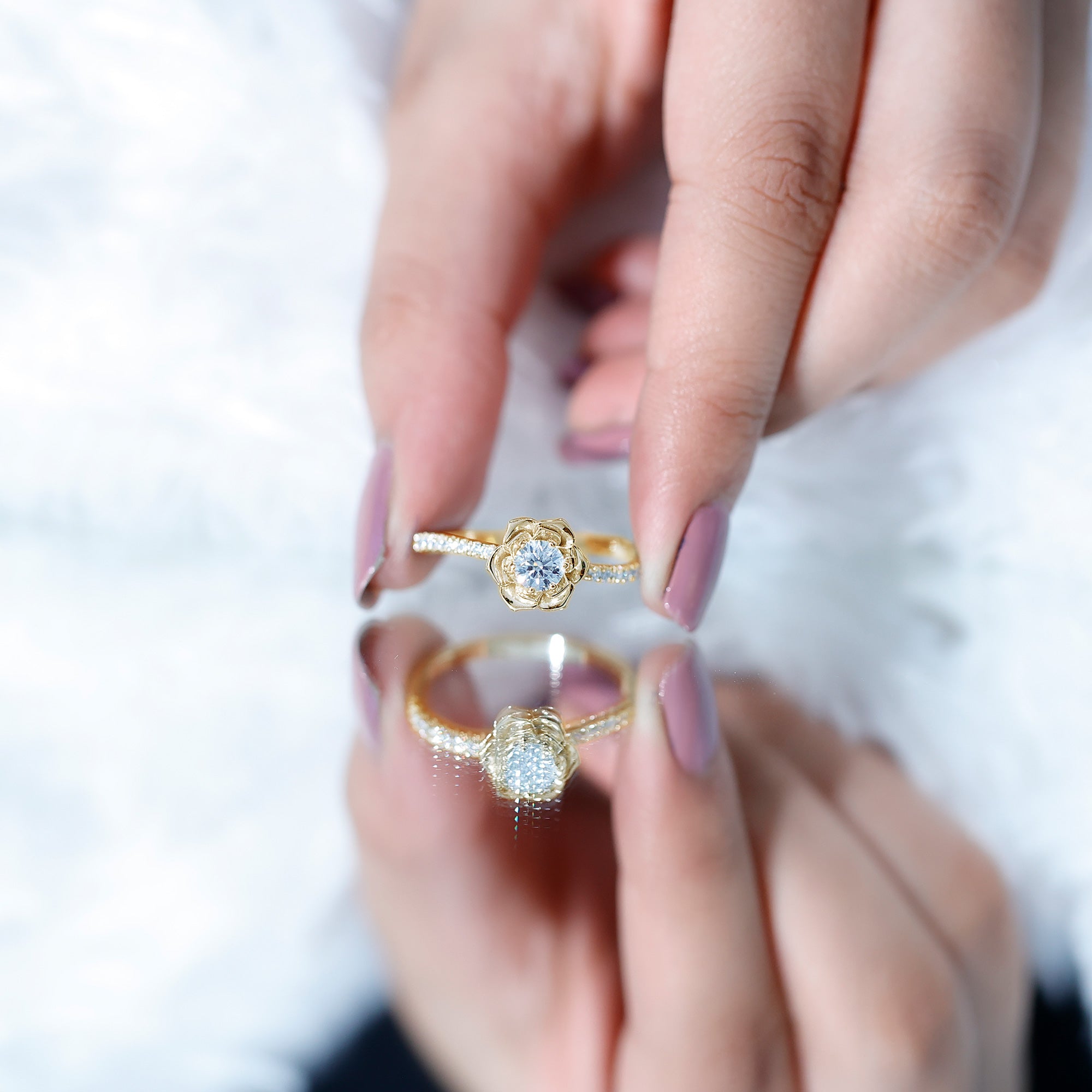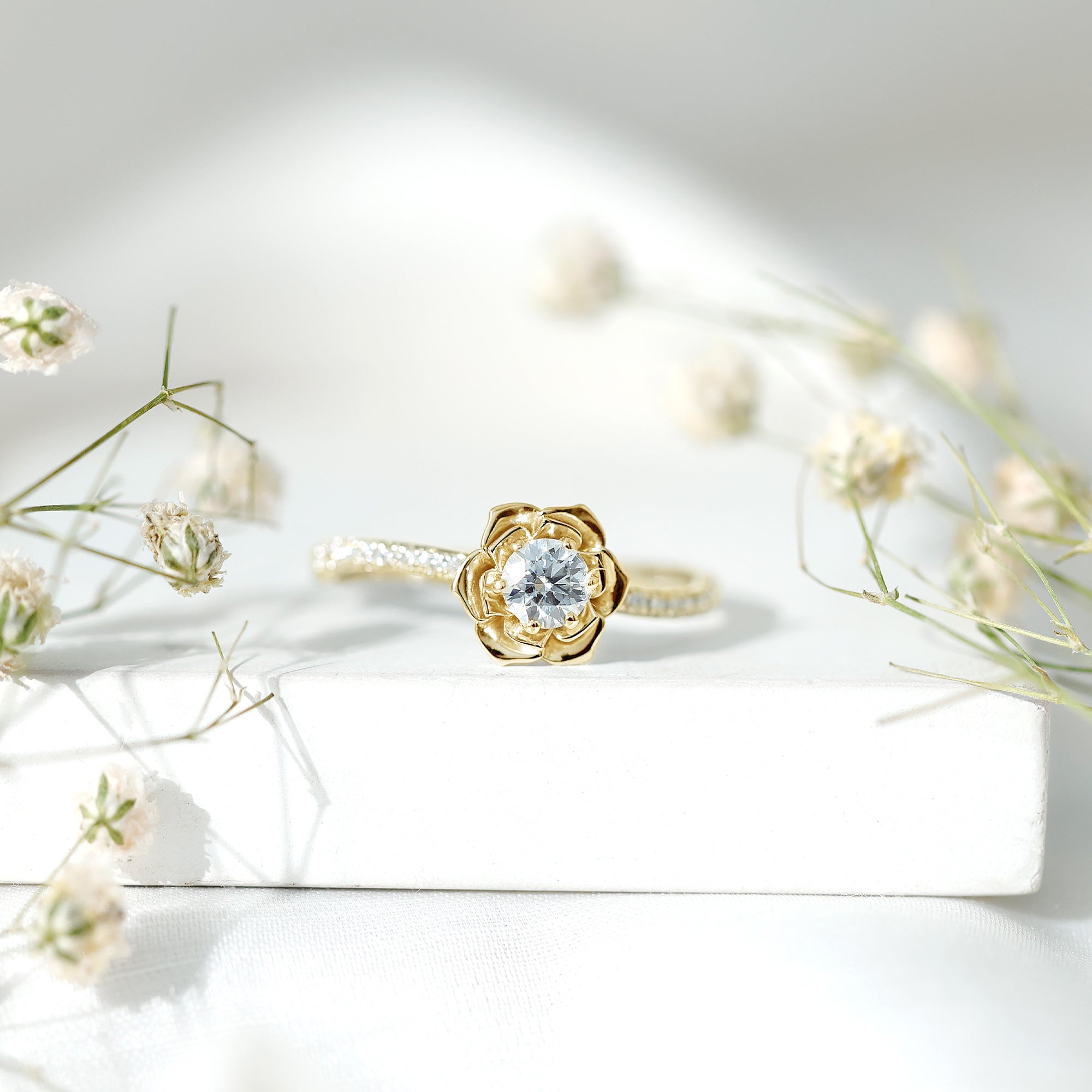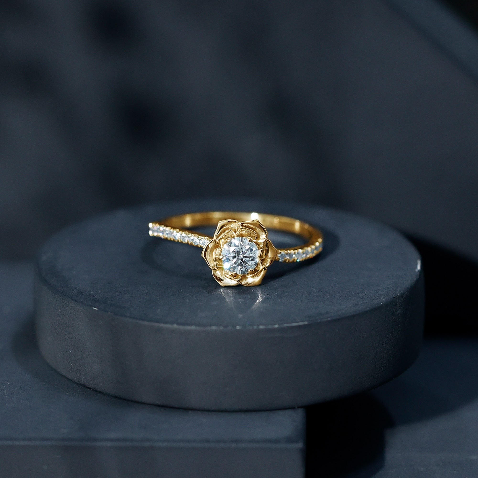 Bring joy to your beloved with this stunning Floral Engagement Ring, made of Solid Gold. The ring features a gorgeous design of a rose flower, adorned with a sparkling Round Cut Moissanite, creating a charming and elegant choice for your special occasion. This Gold Flower Engagement Ring is sure to elate and delight your beloved.