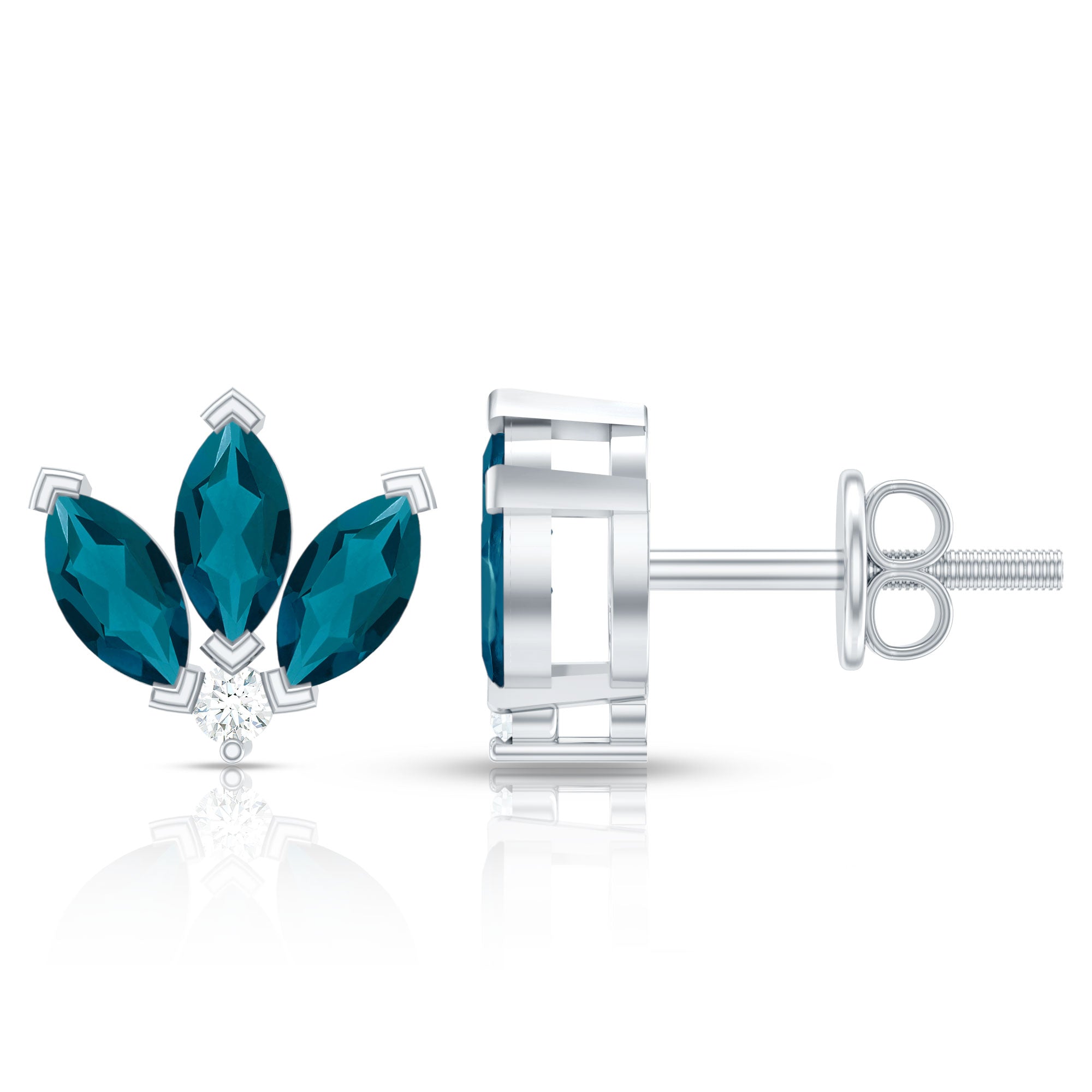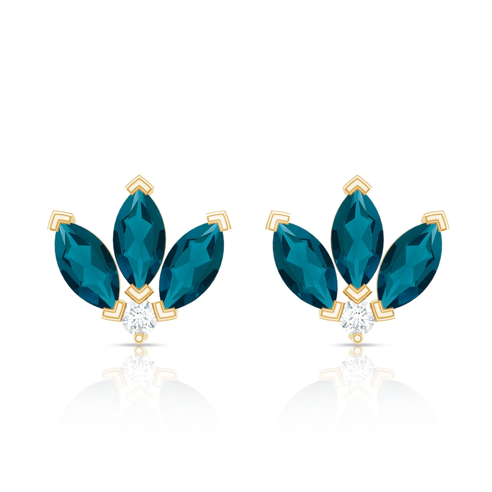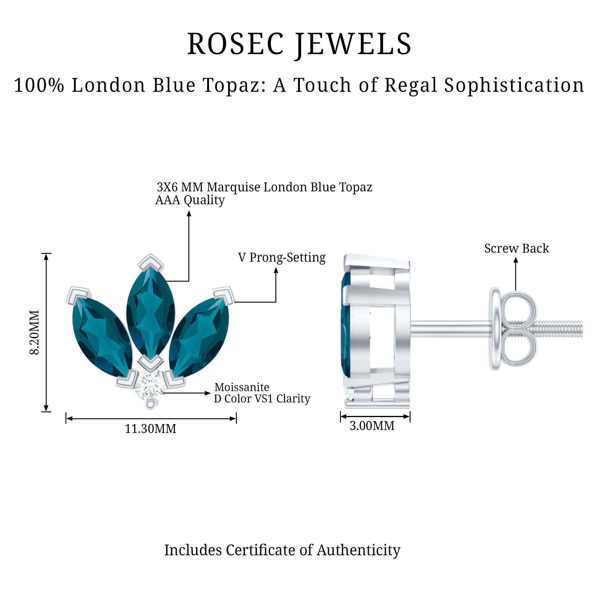 Inspired by the beauty of nature, these Lotus Stud Earrings bring elegance and charm to any look. The design features three marquise cut London Blue Topaz gemstones, forming a graceful lotus flower shape. At the center, a delicate round Moissanite stone adds a subtle sparkle, enhancing the overall brilliance. Carefully crafted with attention to detail, these London Blue Topaz Earrings offer a balanced blend of color and shine. The floral shape feels both timeless and modern, making the Topaz Flower Earrings suitable for special evenings, celebrations, or elegant gatherings. Designed with secure screw back closures, these Flower Stud Earrings provide a safe and snug fit, giving you confidence throughout the day or night. They pair effortlessly with formal outfits as well as stylish casual wear, adding a finish to your ensemble. Perfect as a thoughtful gift or a personal treat, these Lotus Earrings symbolize beauty, growth, and grace.