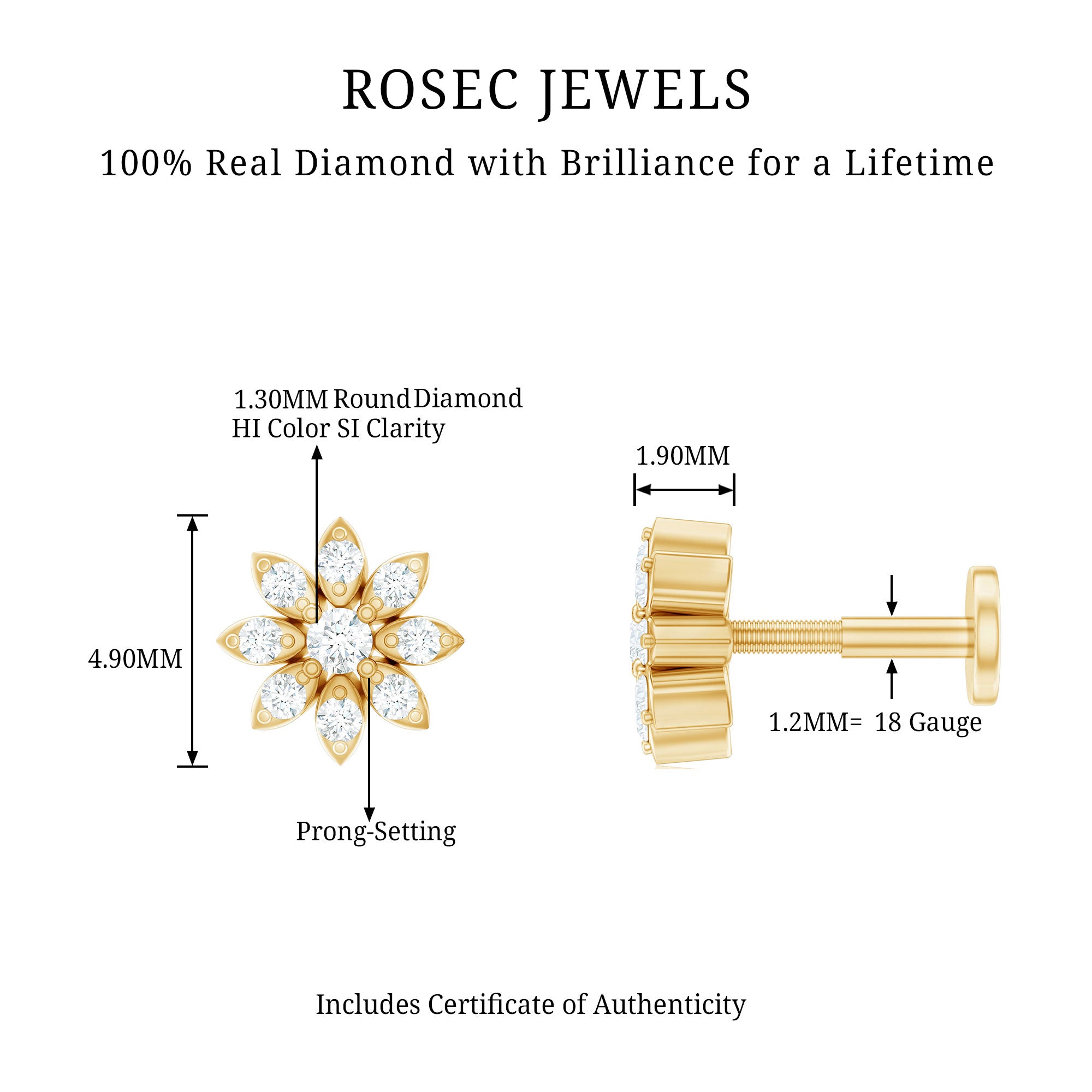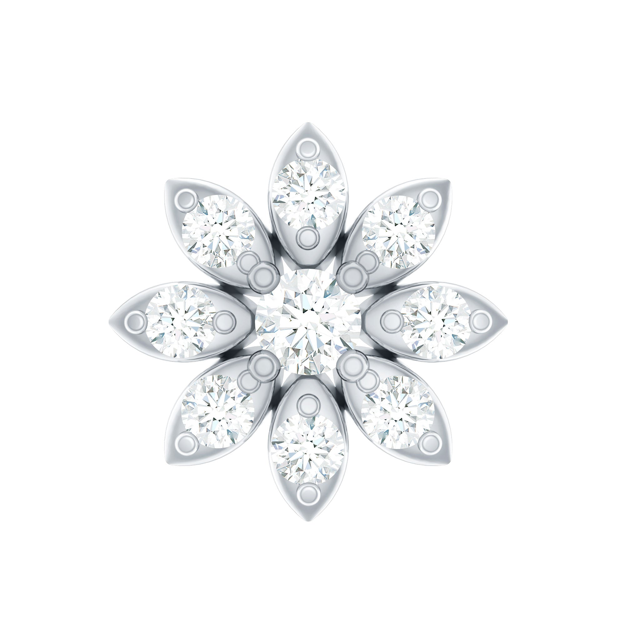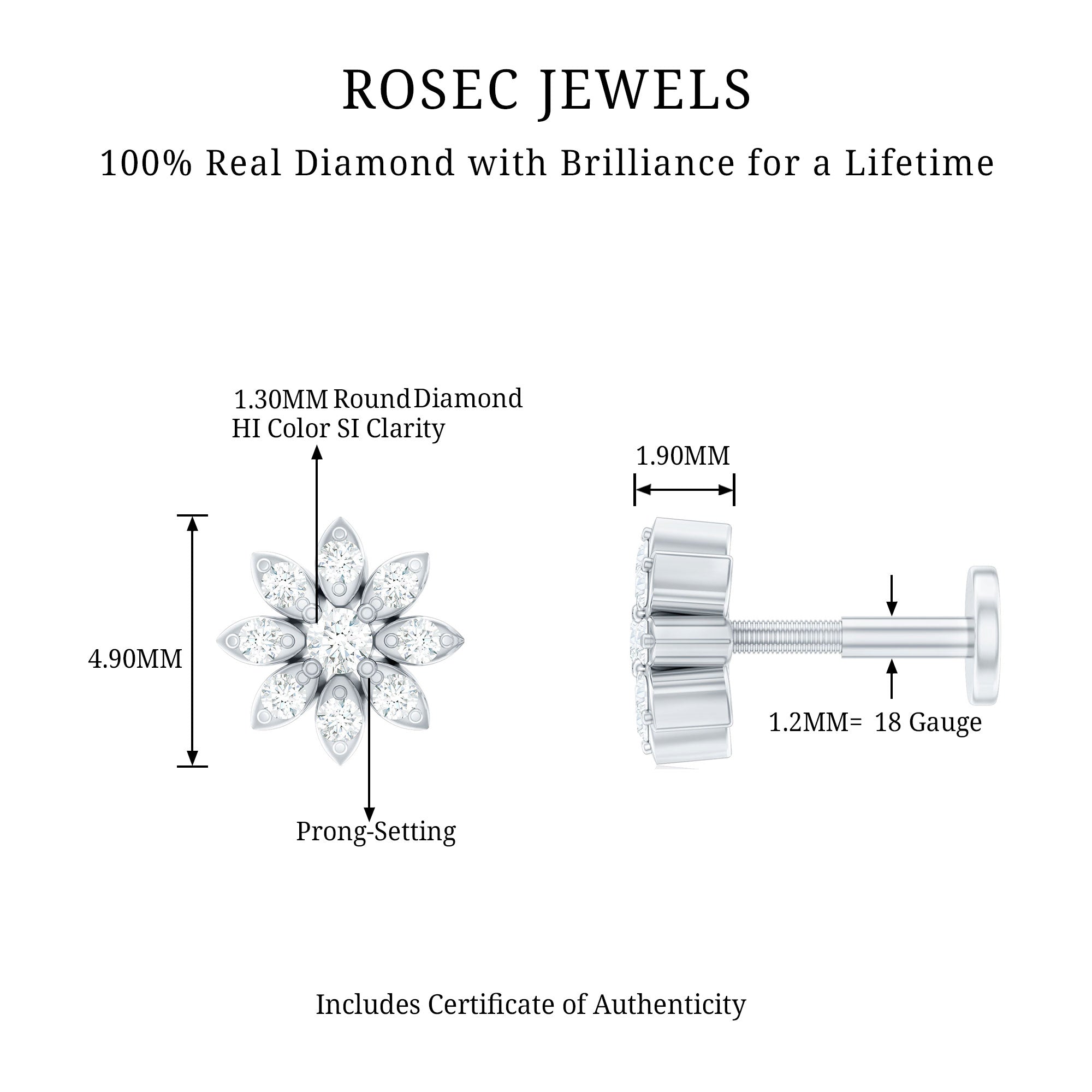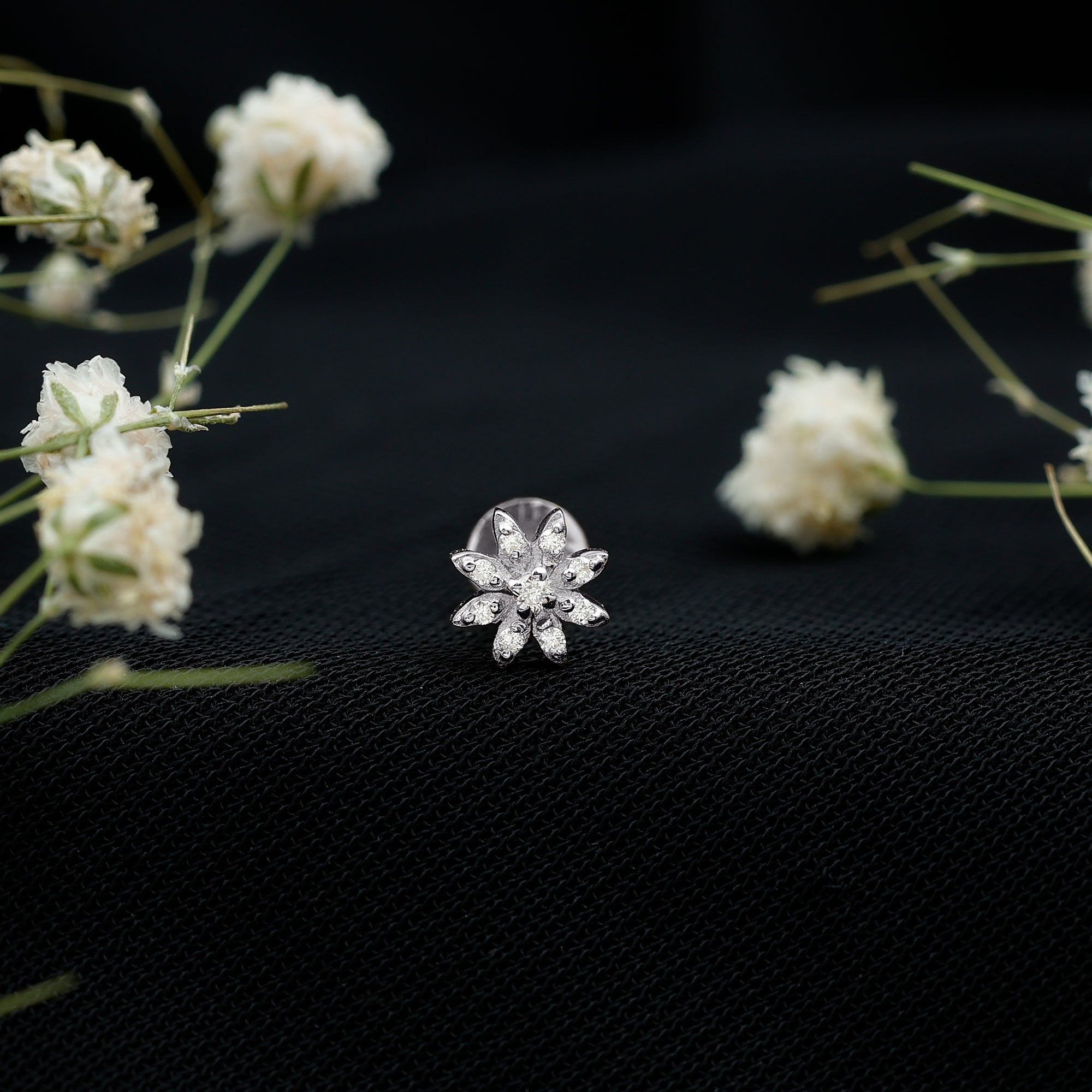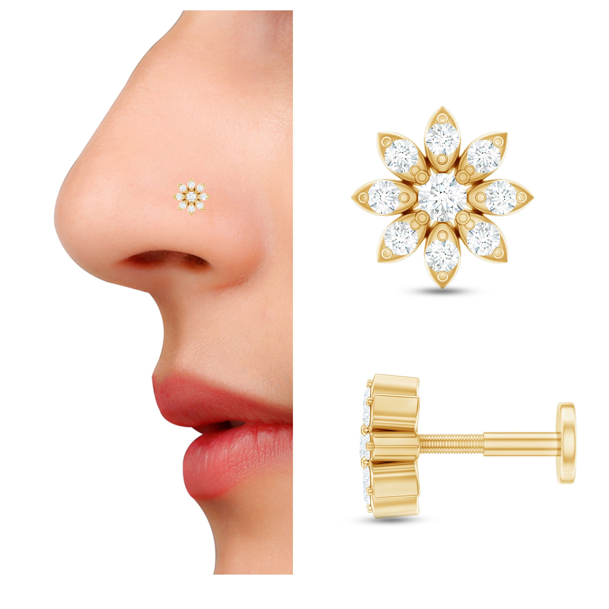 Make a statement with your unique style by wearing this exquisite Flower Nose Stud and receive endless compliments. Meticulously crafted from high-quality metal, this stunning Diamond Nose Stud showcases a beautiful floral design adorned with Round Cut Diamonds set in prong setting. Its intricate details and impeccable craftsmanship make it the perfect accessory to wear every day as a stunning piece of Body Jewelry. Flaunt your individuality and elevate your look with this exquisite Nature Inspired Jewelry that is sure to turn heads. Apart from wearing it on the nose this dainty stud can be styled on ear piercings also such as Helix Piercing, Cartilage Piercing, and Lobe Piercing. This classic stud beholds the shine of HI-SI quality Diamonds which gives an enchanting appearance to the entire look.