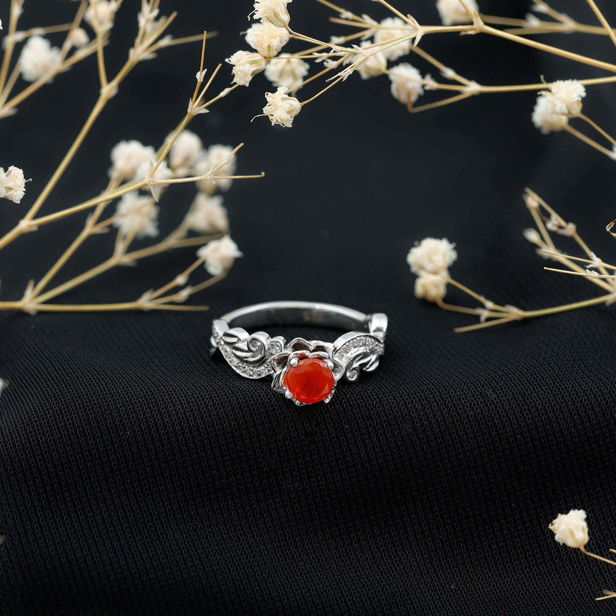Experience the elegance of this Fire Opal Floral Engagement Ring. Its flower-shaped gold metal band, sparkling Diamond stones on the shank, and radiant Fire Opal create a glamorous and classic look. Expertly crafted from solid gold, this Fire Opal ring is the perfect choice for the fashion-forward woman.