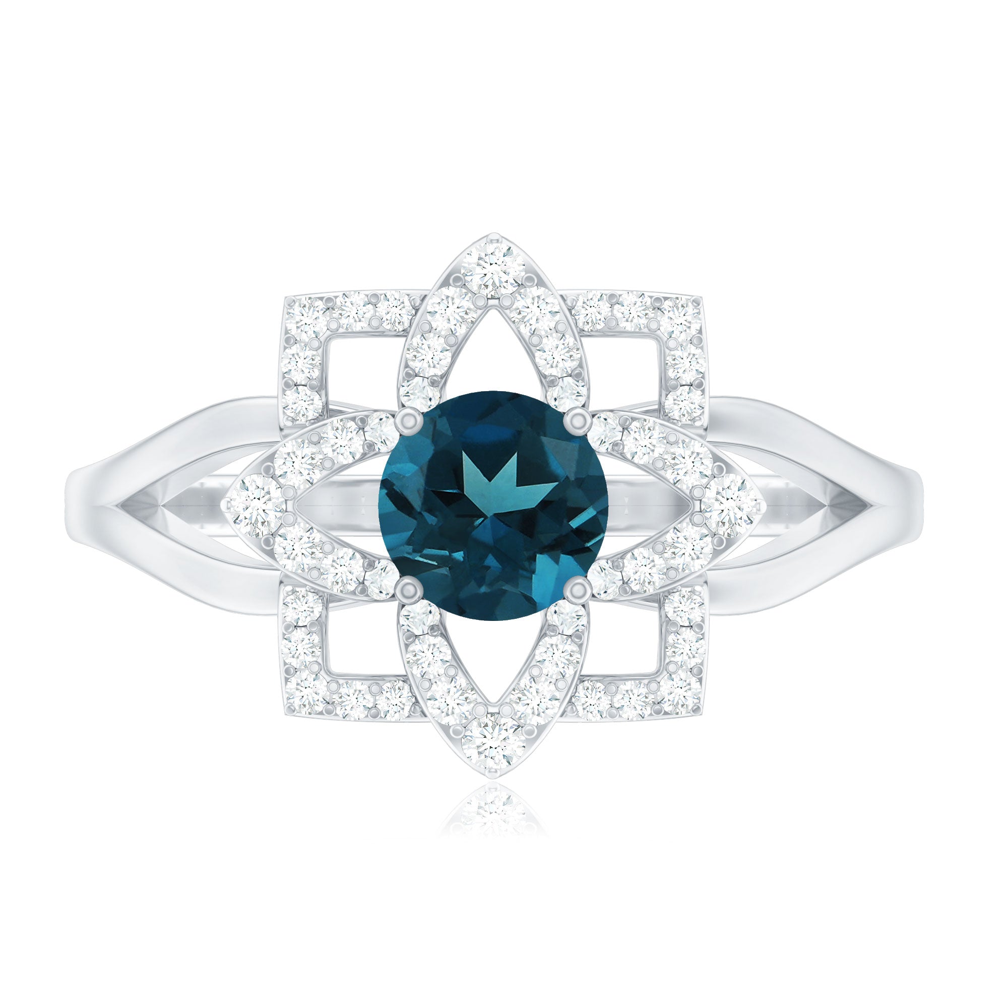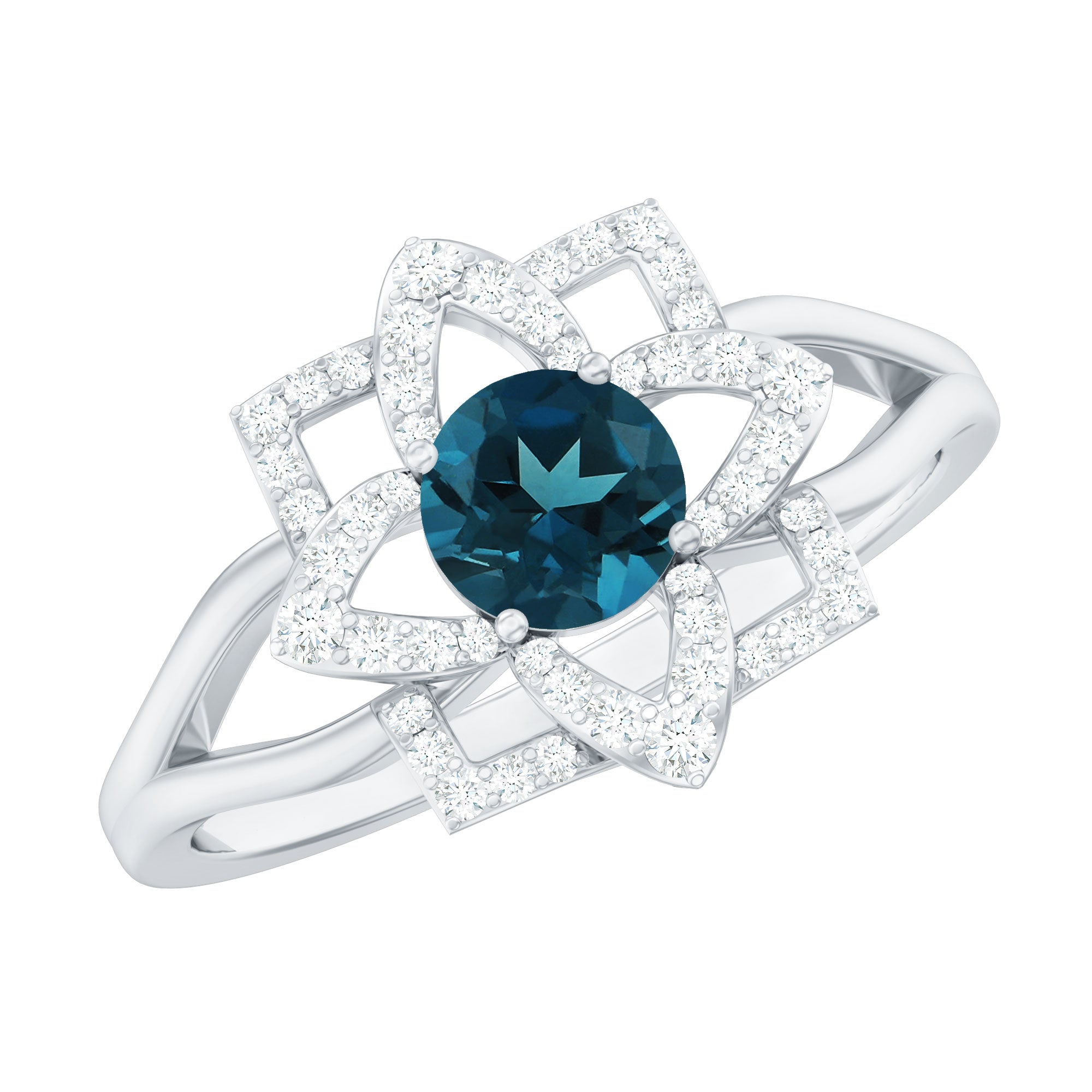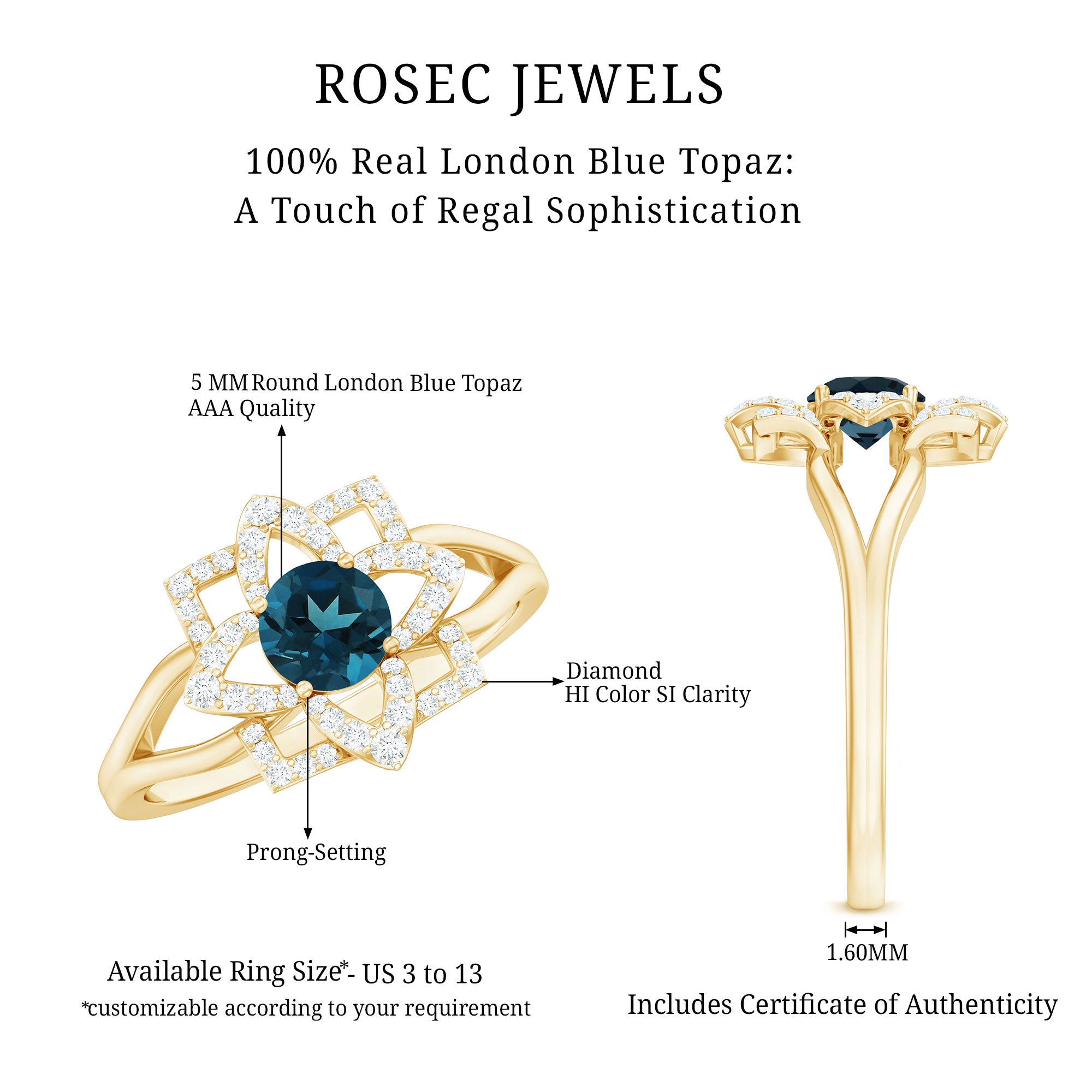 This exquisite Blue Topaz Flower Ring represents a distinctive fusion of craftsmanship and brilliance, intended to elevate every occasion. At its core lies a stunning 5 MM round cut London Blue Topaz, securely fastened by a prong setting. Encircling the central stone is a floral halo, artfully designed with small round Diamond stones arranged to resemble delicate petals. This design imparts the Flower Engagement Ring with a sophisticated yet striking character that exudes elegance and freshness. The split shank contributes to an open, airy aesthetic that complements the intricate floral setting. The overall appearance combines modern structure with floral delicacy, making it perfect for those who value exquisite design with a personal touch. Whether selected as an engagement ring or worn as a bold cocktail piece, this London Blue Topaz Engagement Ring effortlessly captures attention. The flower motif introduces a romantic essence, while the split band and meticulous stone arrangement provide a unique, contemporary flair. The AAA quality london blue topaz and HI-SI Diamond stone delivers exceptional brilliance and is recognized for its durability, rendering this Cocktail Ring ideal for both daily wear and special events. It serves as a wonderful means to convey individuality and style through a piece that is both meaningful and beautifully crafted.