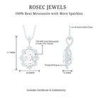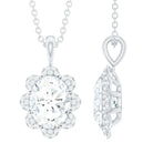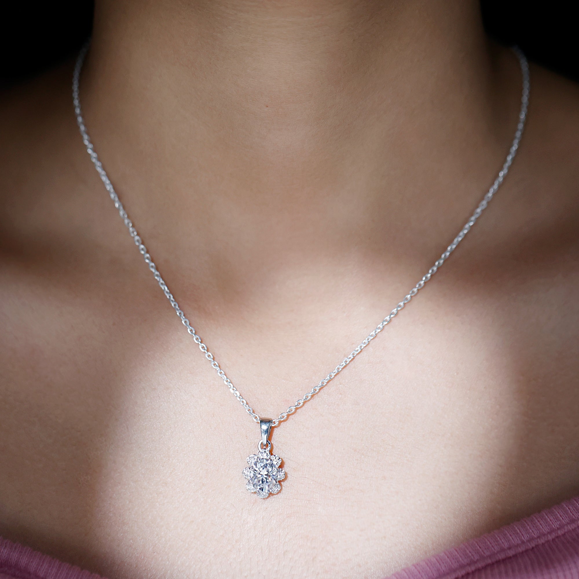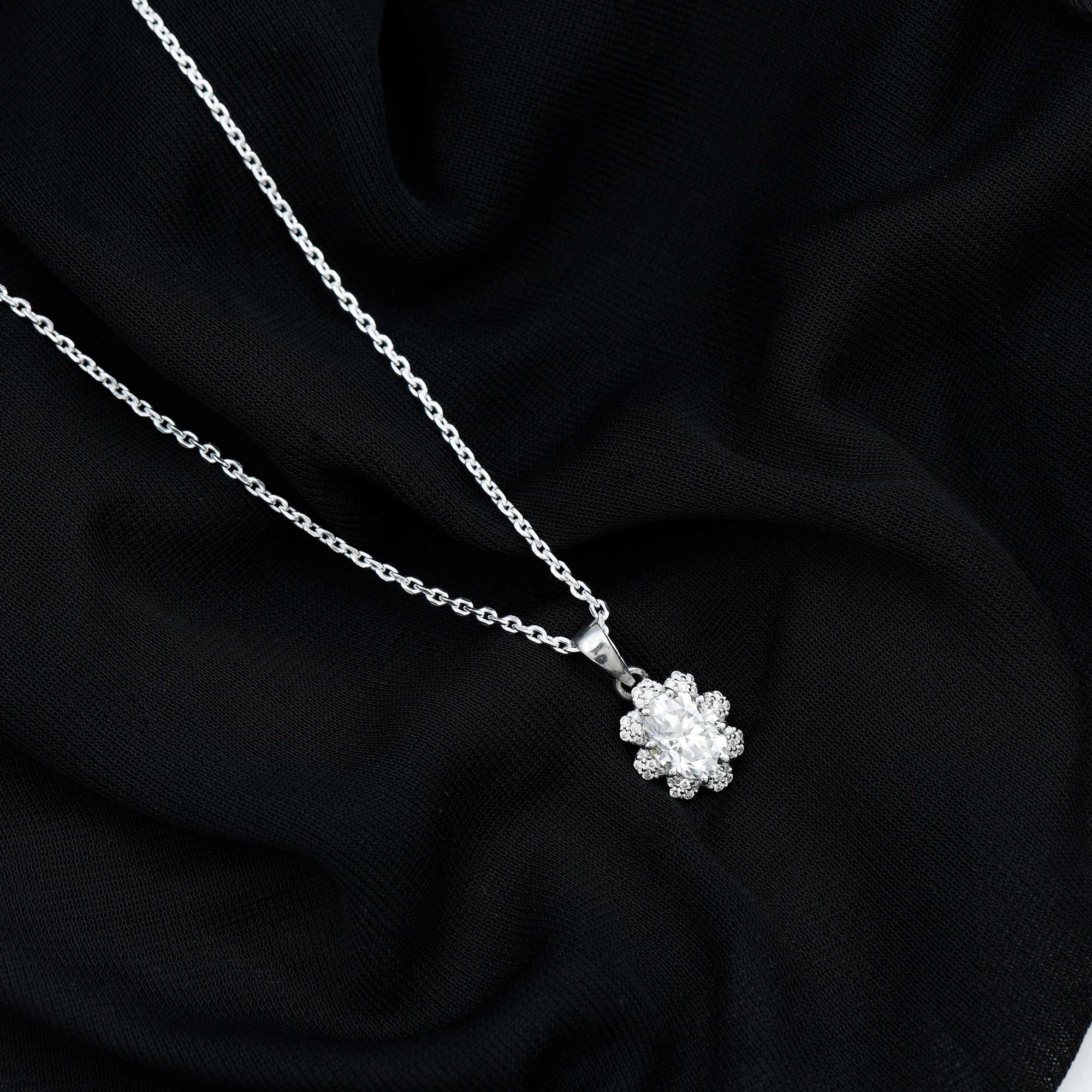Adorn your neckline with this Moissanite Pendant, beautifully made with 14K White Gold Plated Silver. The pendant features a 7X9 MM Oval Shaped Moissanite of D-VS1 quality and adorned with smaller Moissanite cluster, making the flowers petal all around. This Floral Pendant is dangling with a standard bail through which a cable chain is passing through that has a secured Lobster clasp which also let the wearer adjust the length according to their comfort and makes it beautifully sit on the neckline. This Halo Pendant can be a thoughtful gift for your beloved on the special occasion. The pendant will be delivered to you in a premium quality packaging with a certificate of authenticity.