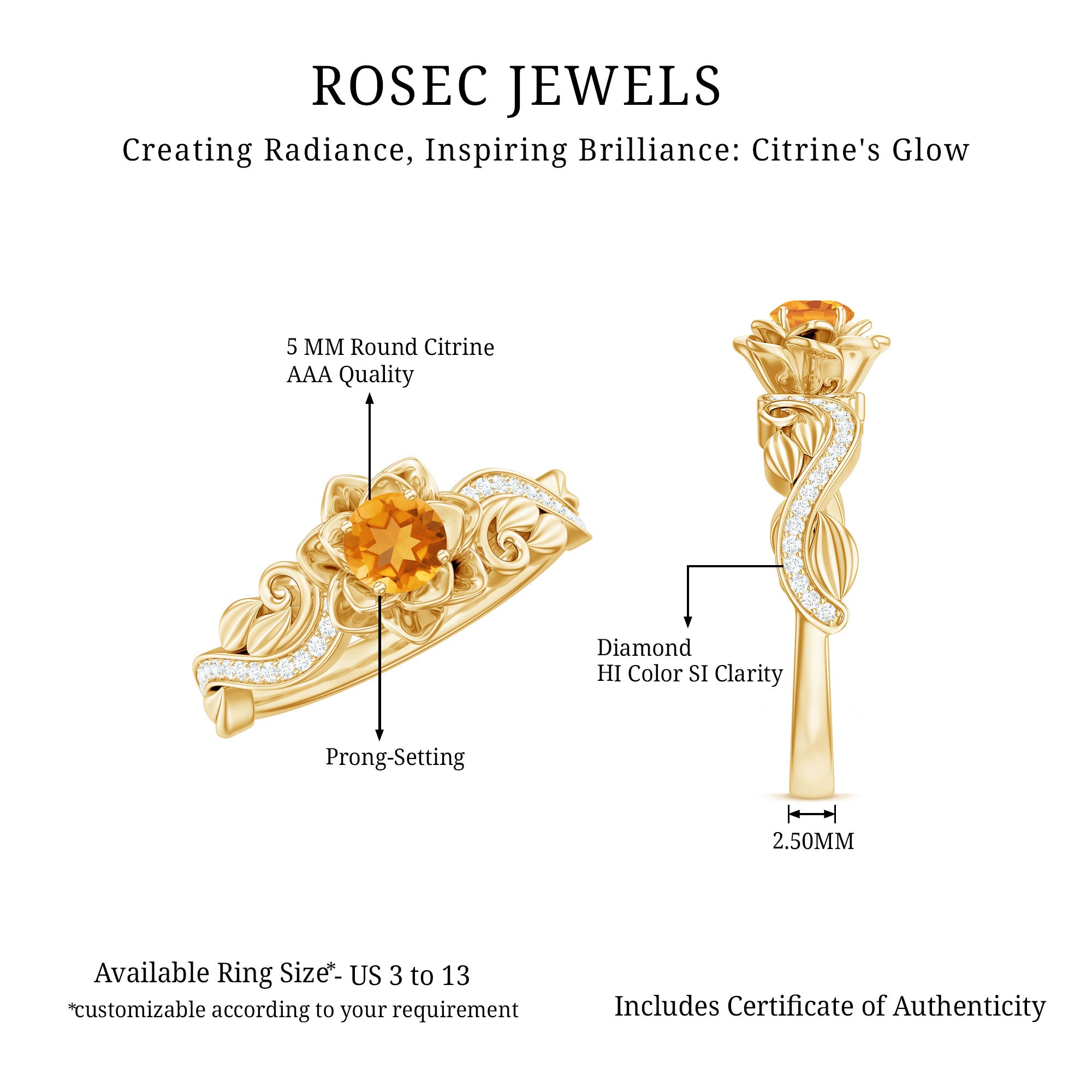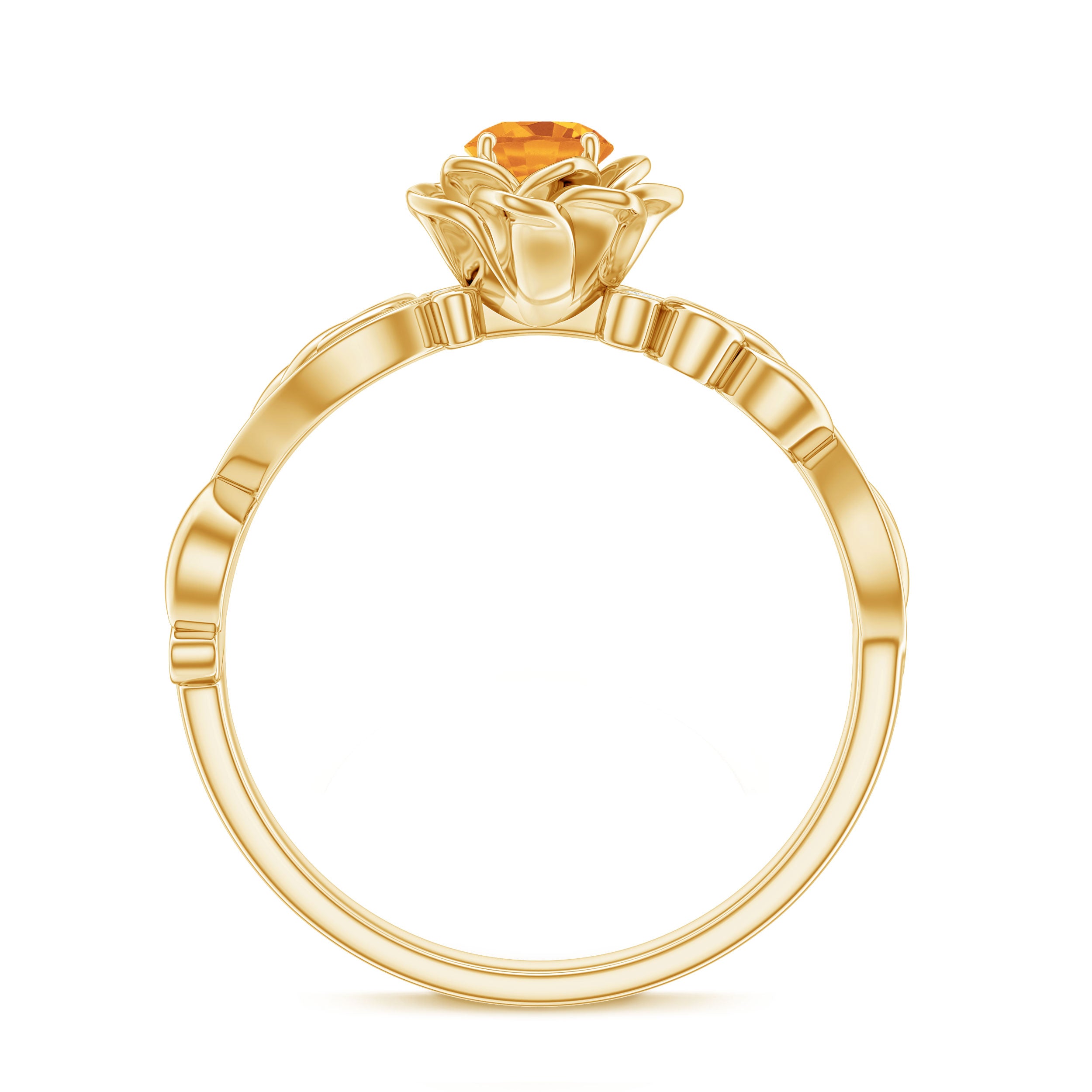 Experience the elegance of this Citrine Floral Engagement Ring. Its flower-shaped gold metal band, sparkling Diamond stones on the shank, and radiant Citrine create a glamorous and classic look. Expertly crafted from gold, this Citrine ring is the perfect choice for the fashion-forward woman.