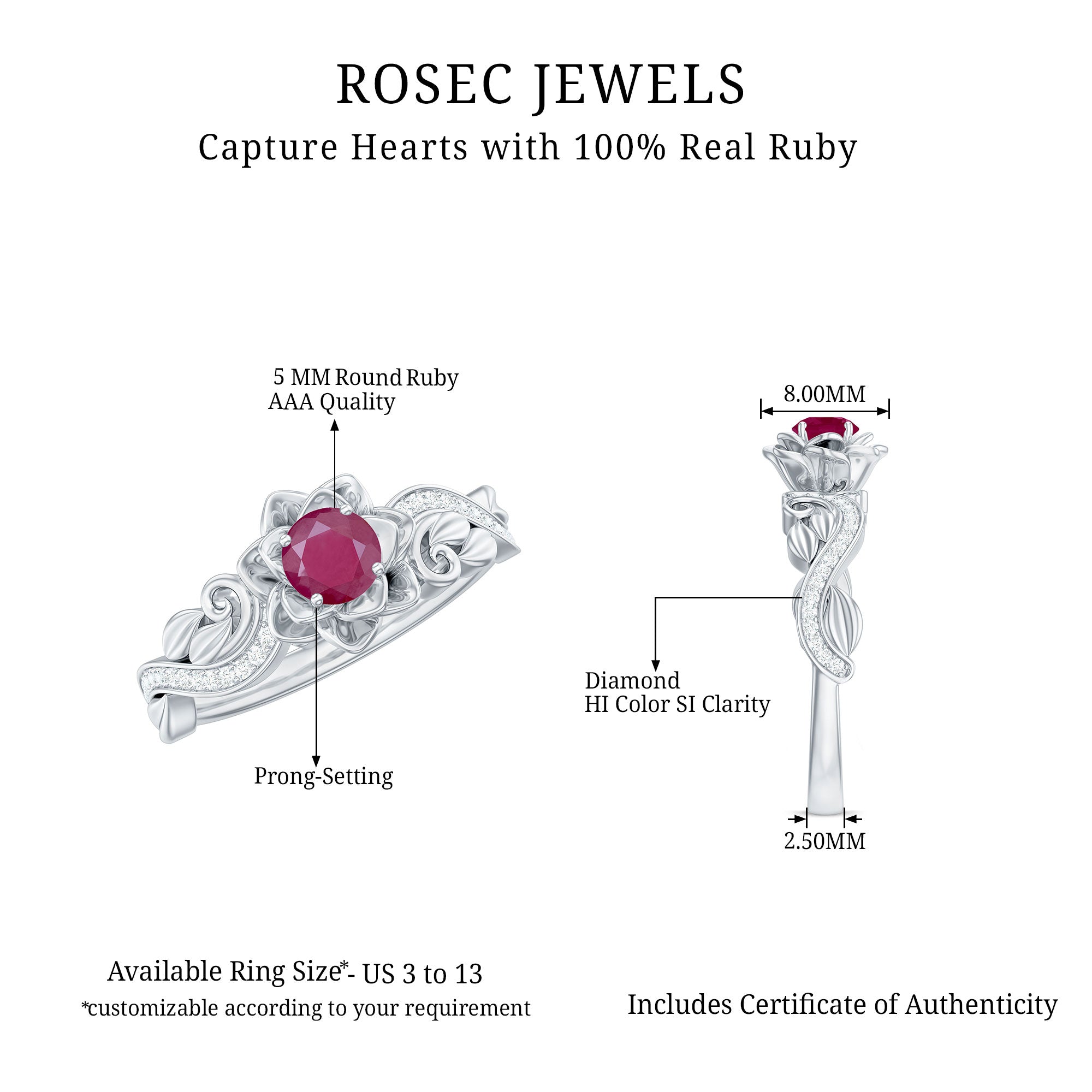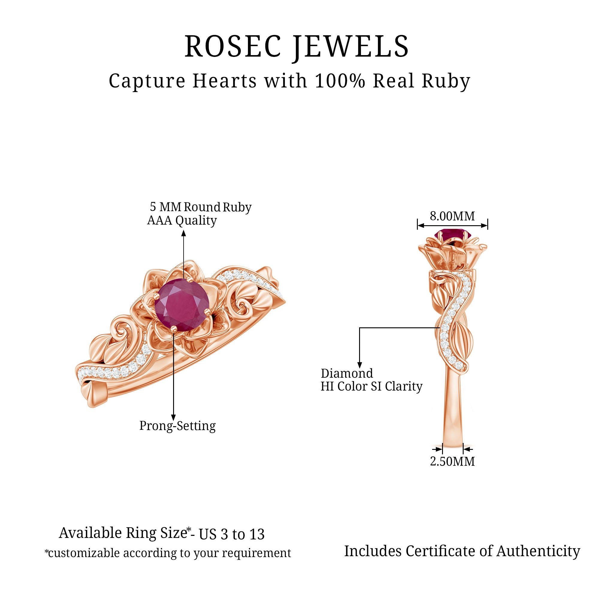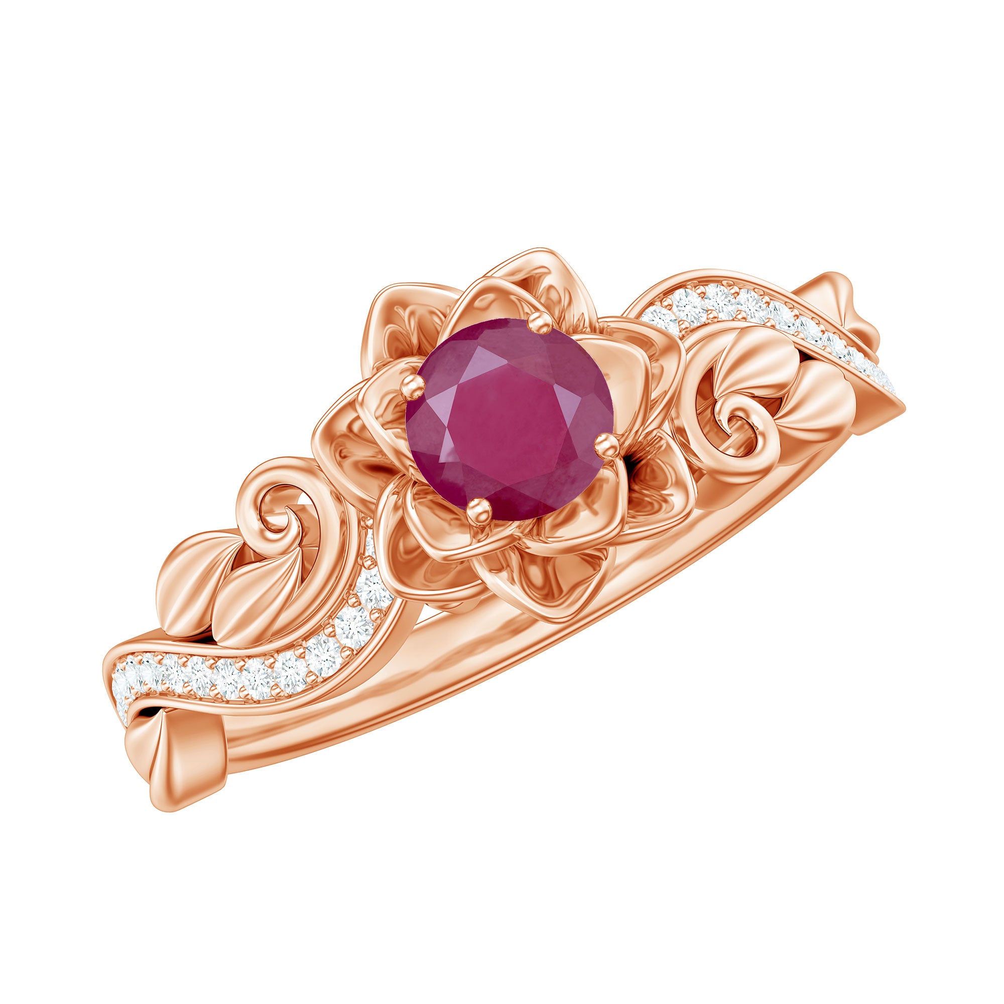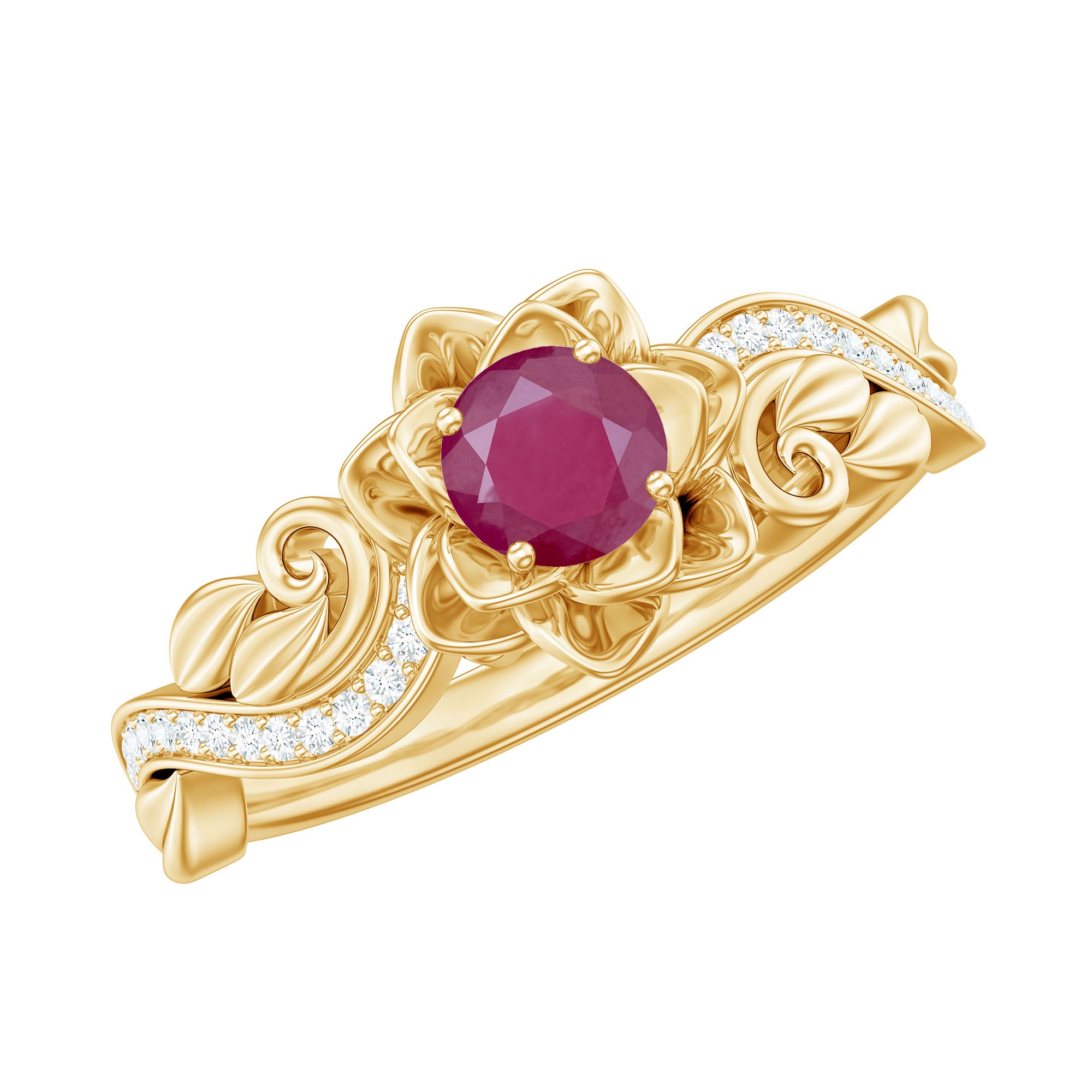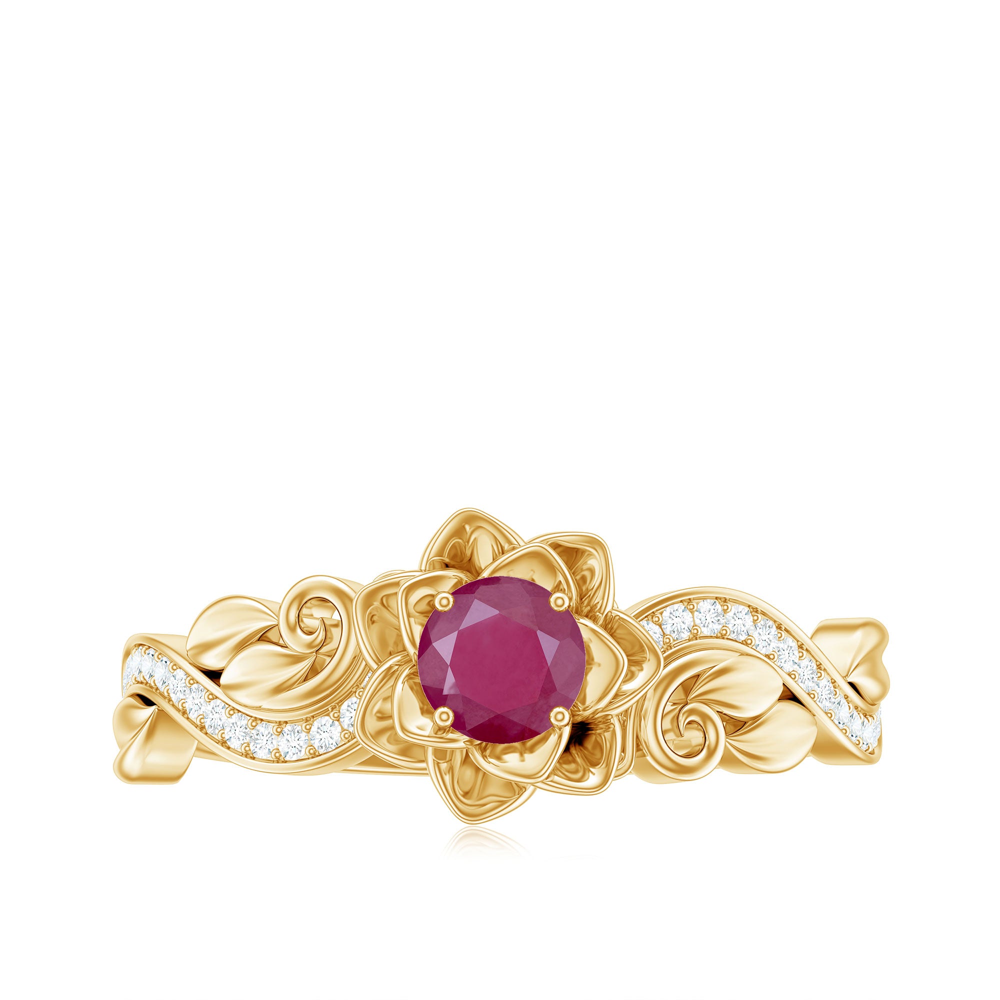 Experience the elegance of this Ruby Floral Engagement Ring. Its flower-shaped gold metal band, sparkling Diamond stones on the shank, and radiant Ruby create a glamorous and classic look. Expertly crafted from solid gold, this ring is the perfect choice for the fashion-forward woman.