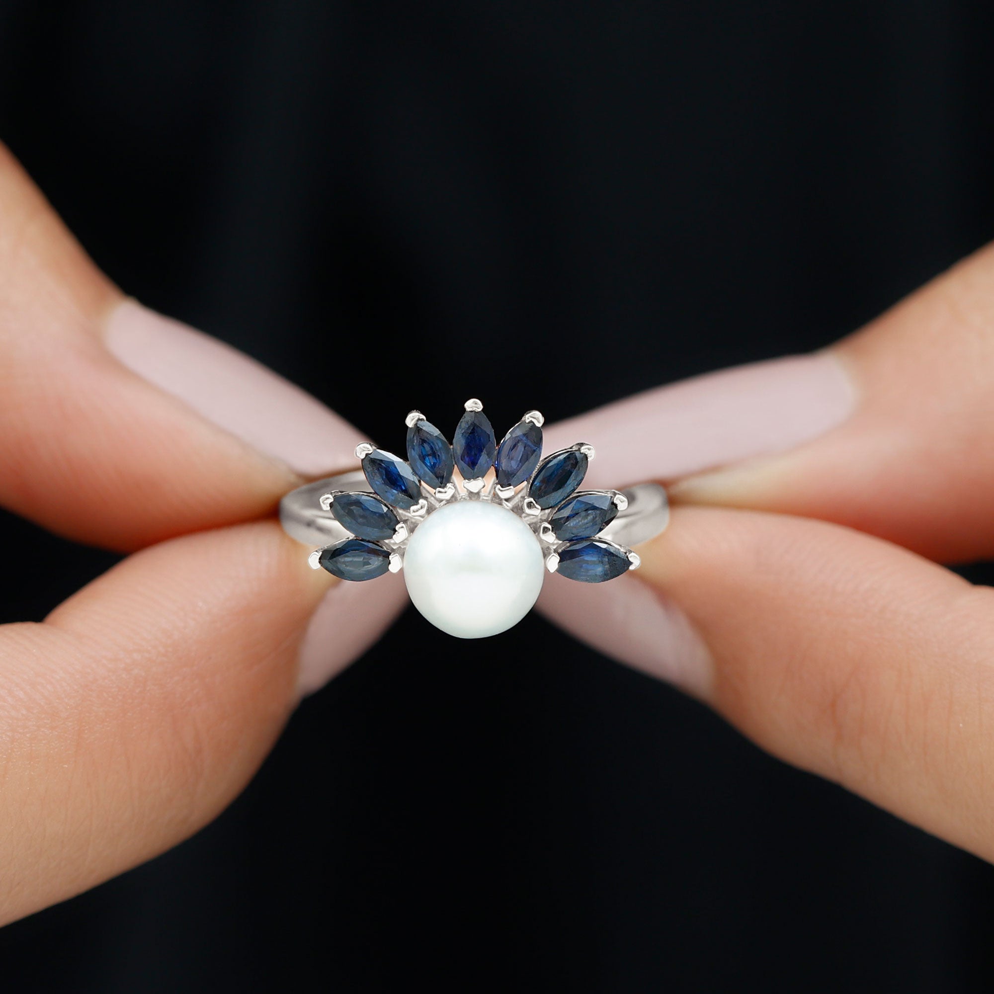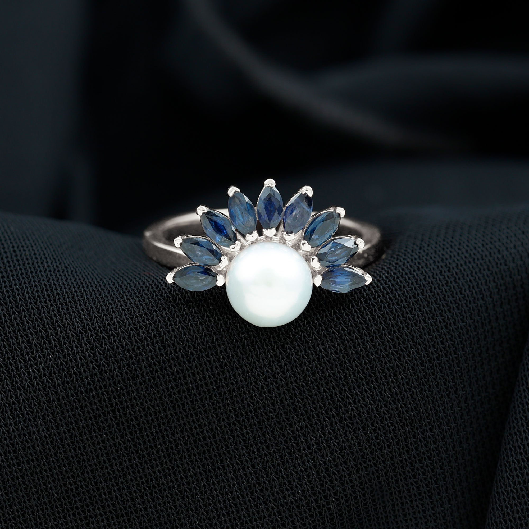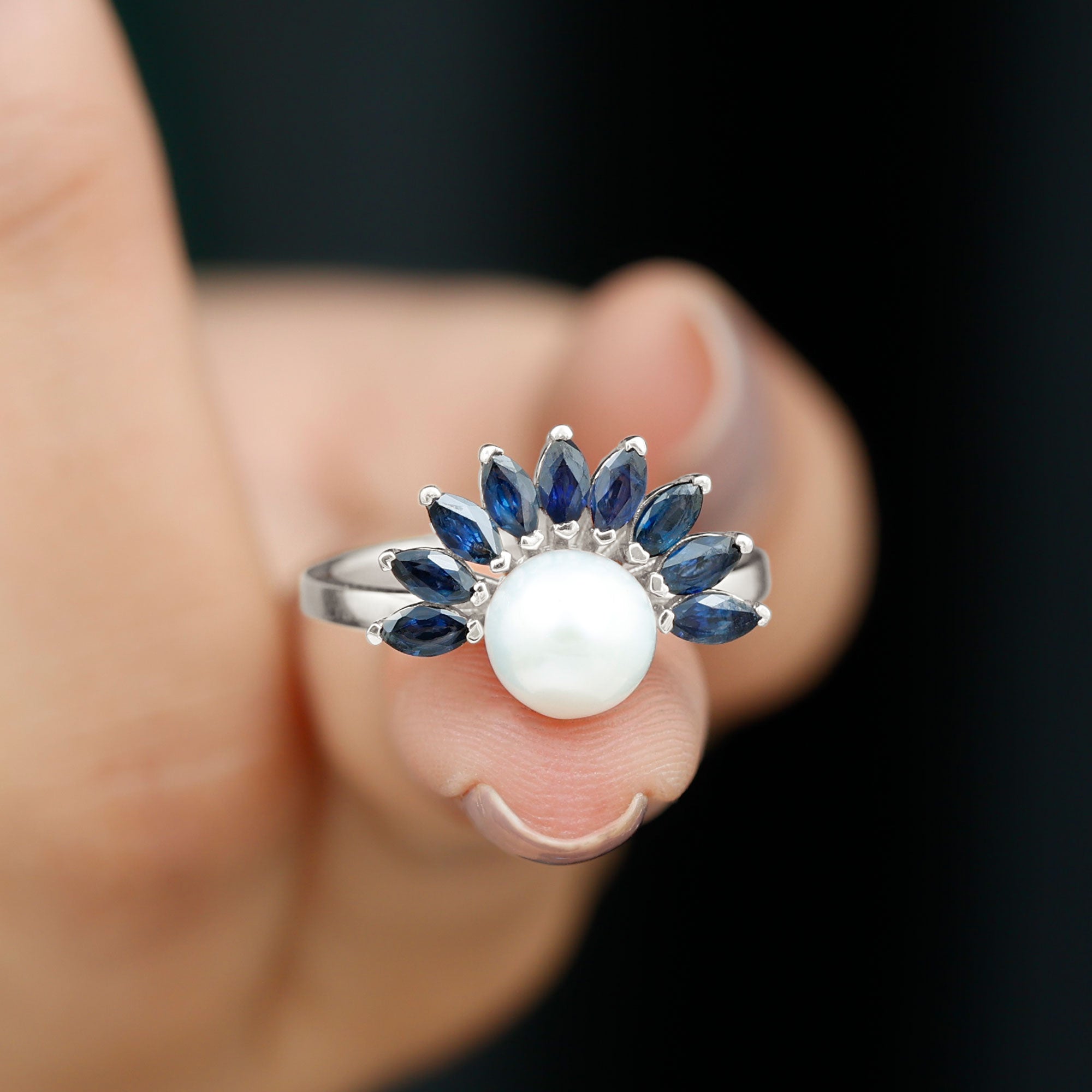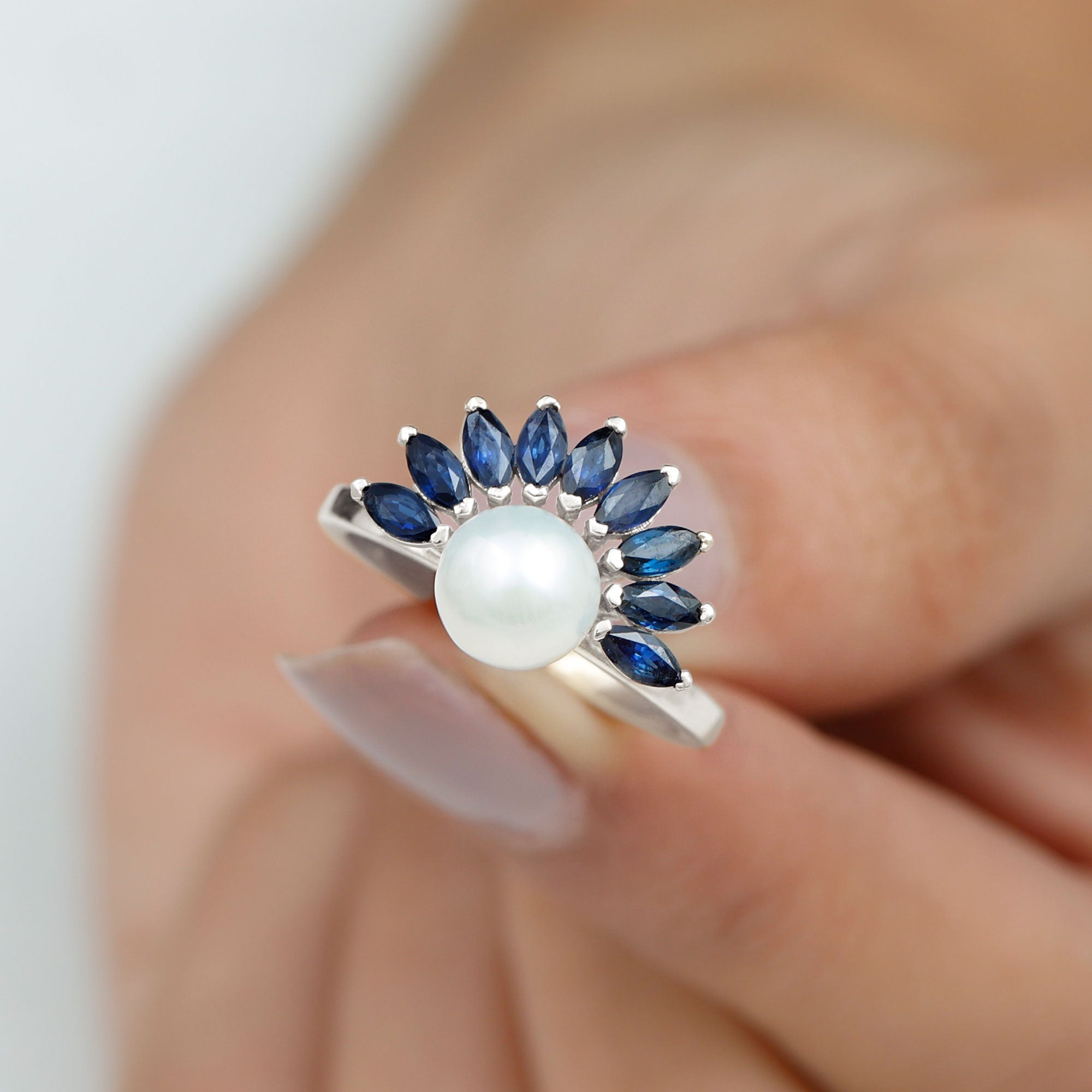 Half Flower Engagement Ring is engraved with Solitaire Fresh Water Pearl in the center with Marquise Shape Blue Sapphire in the prong setting makes lovely floral. This gorgeous accessory for parties and weddings.