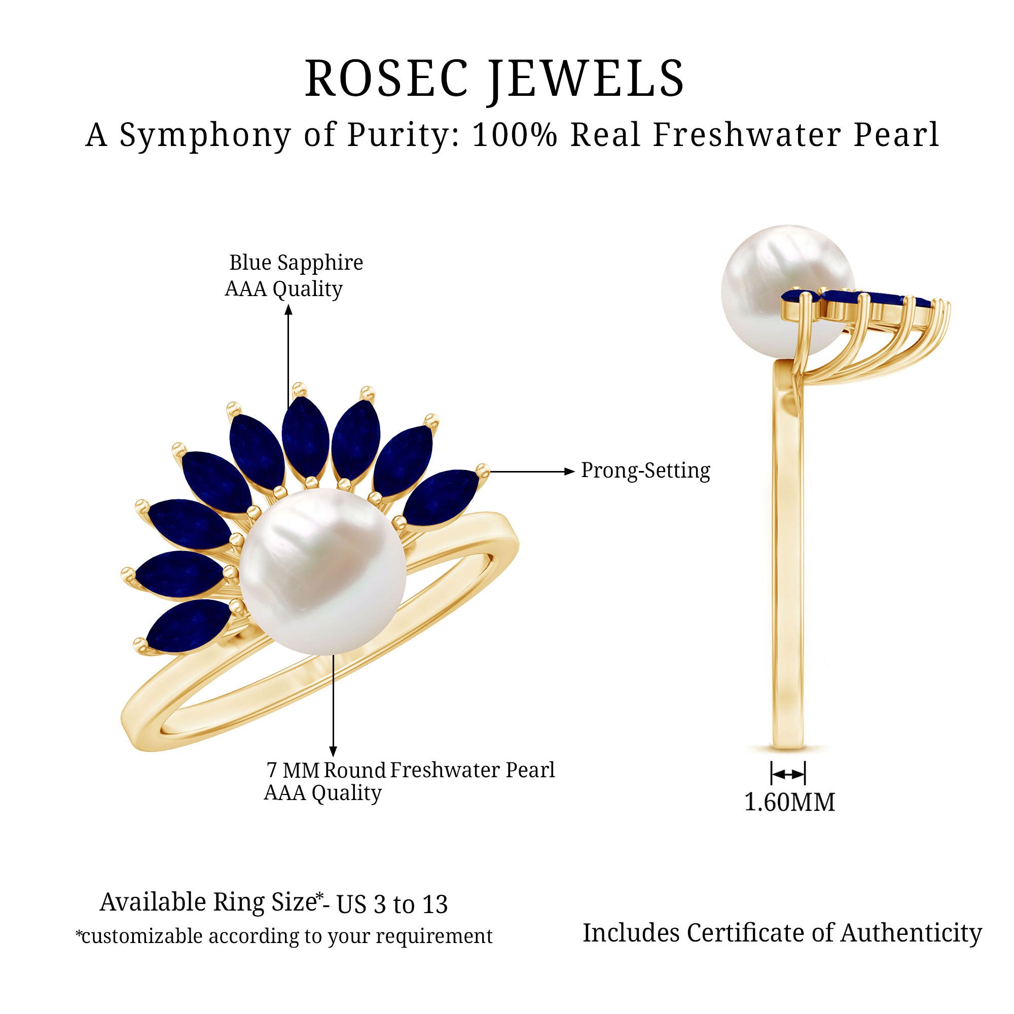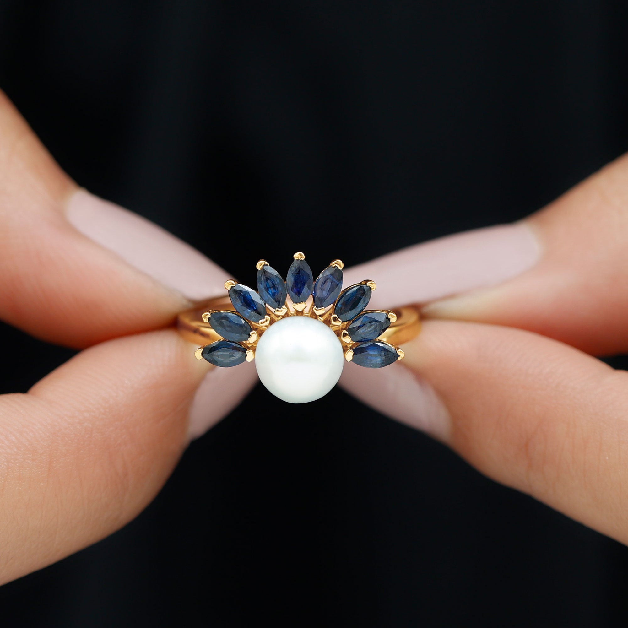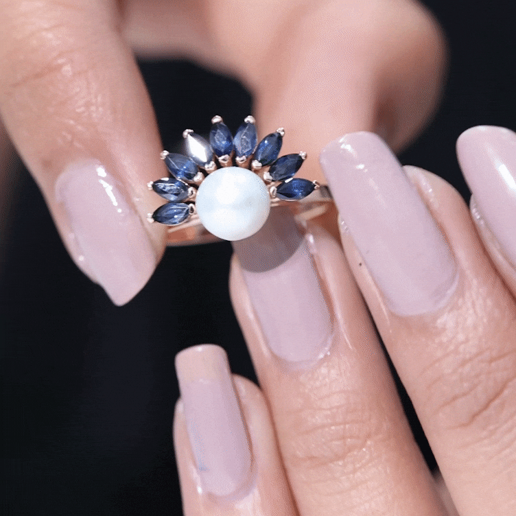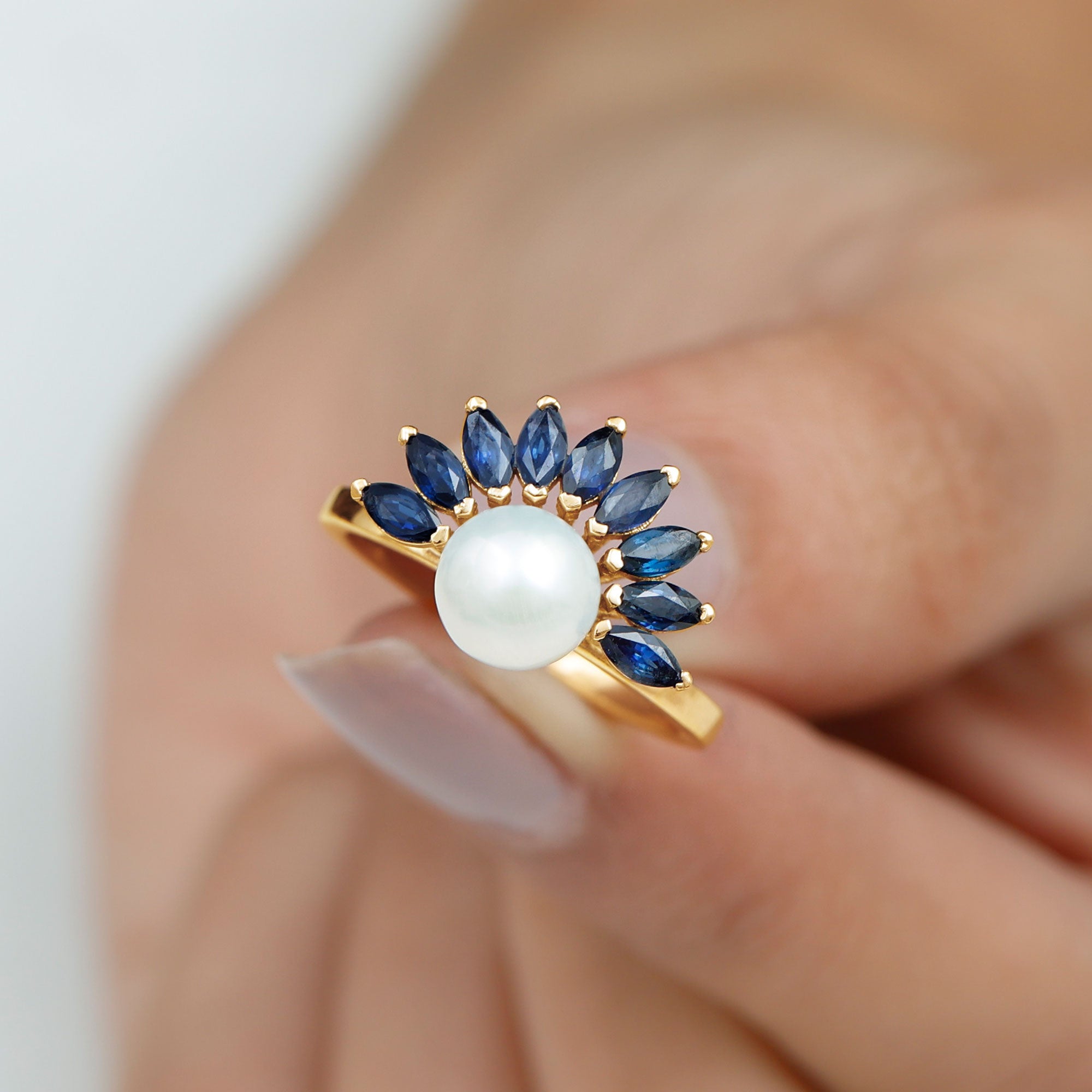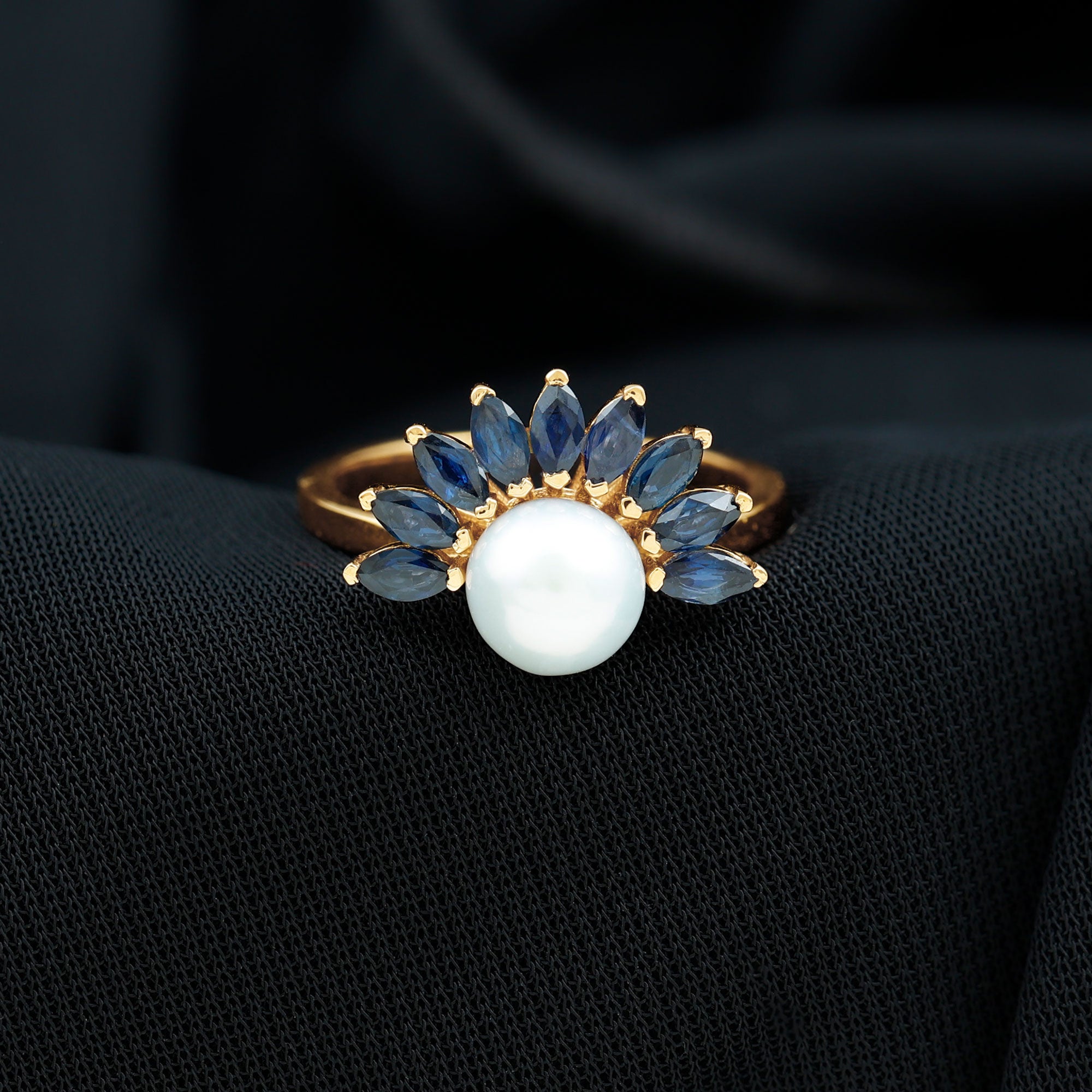 Half Flower Engagement Ring is engraved with Solitaire Fresh Water Pearl in the center with Marquise Shape Blue Sapphire in the prong setting makes lovely floral. This gorgeous accessory for parties and weddings.