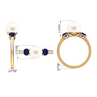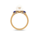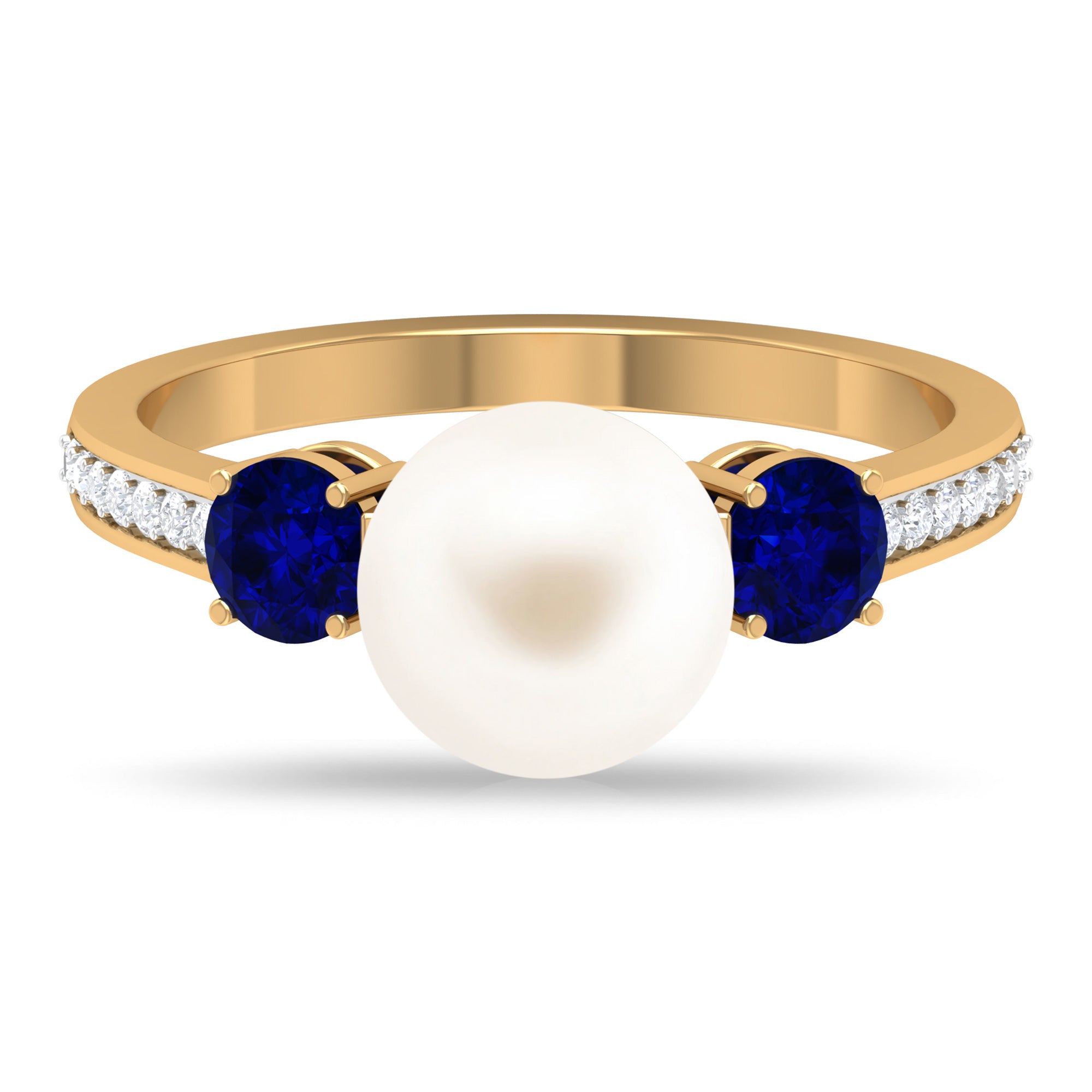 Unique Engagement Ring is embellished with 8 MM Round Shape Freshwater Pearl Solitaire with Round Blue Sapphire and Moissanite are set as Side Stones gives a gorgeous touch to this Ring. This beautiful White Pearl Engagement Ring is crafted in Gold. A perfect present for your Lady Love to gift on her special or big day.