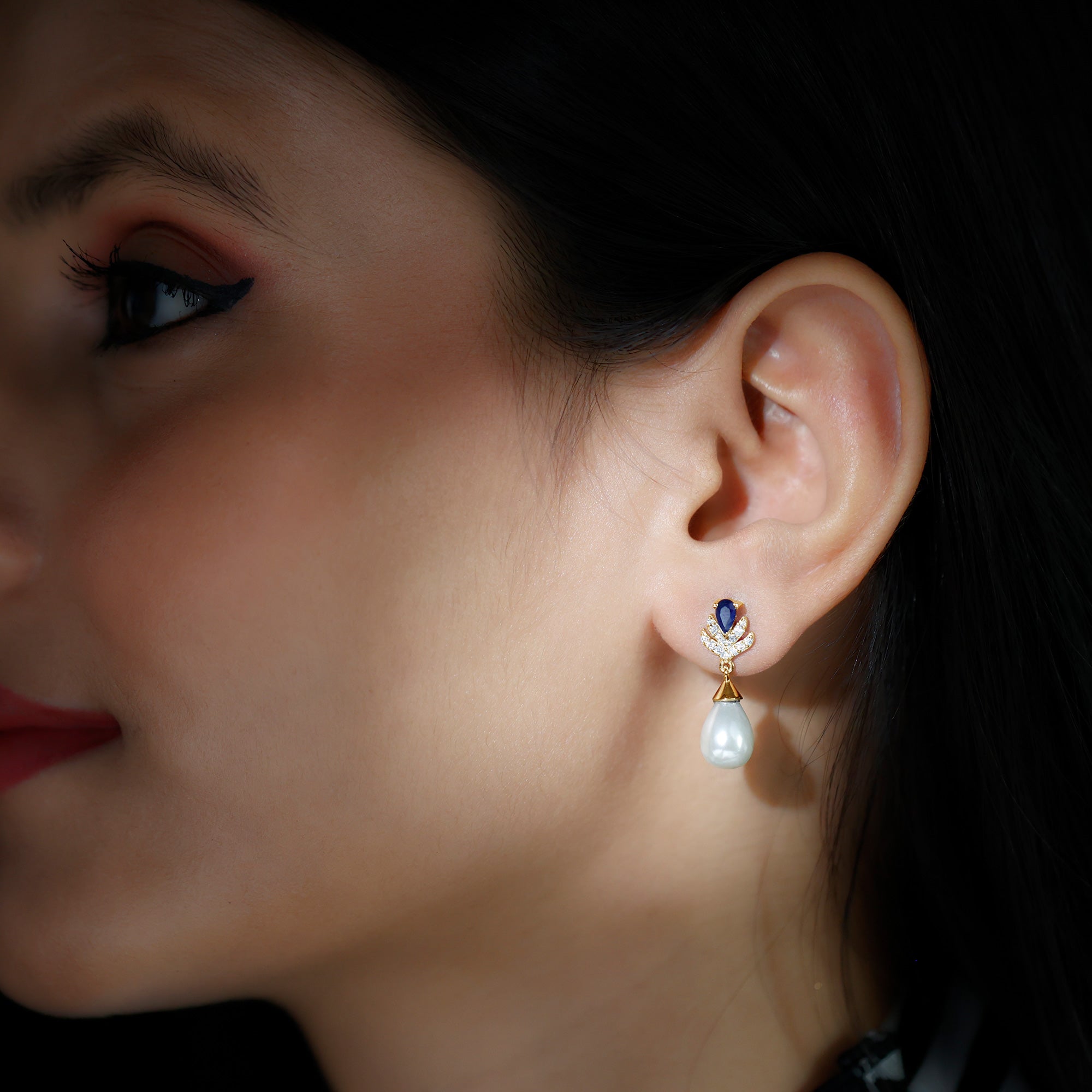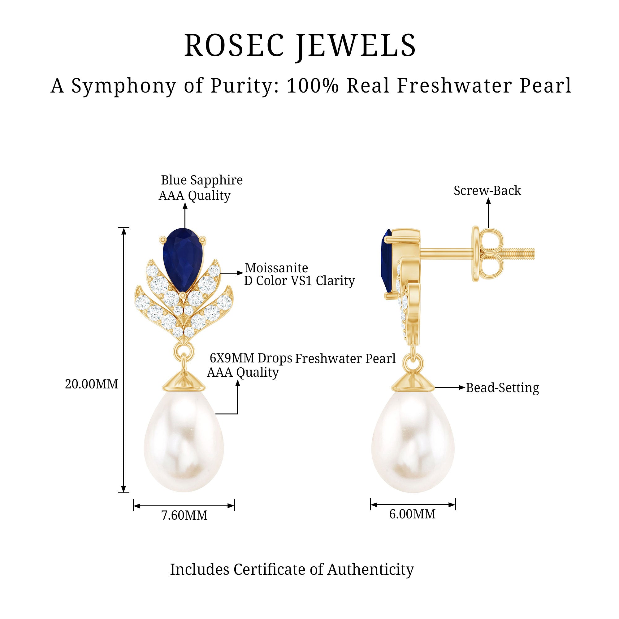 Freshwater Pearl and Blue Sapphire Teardrop Earrings with Moissanite
