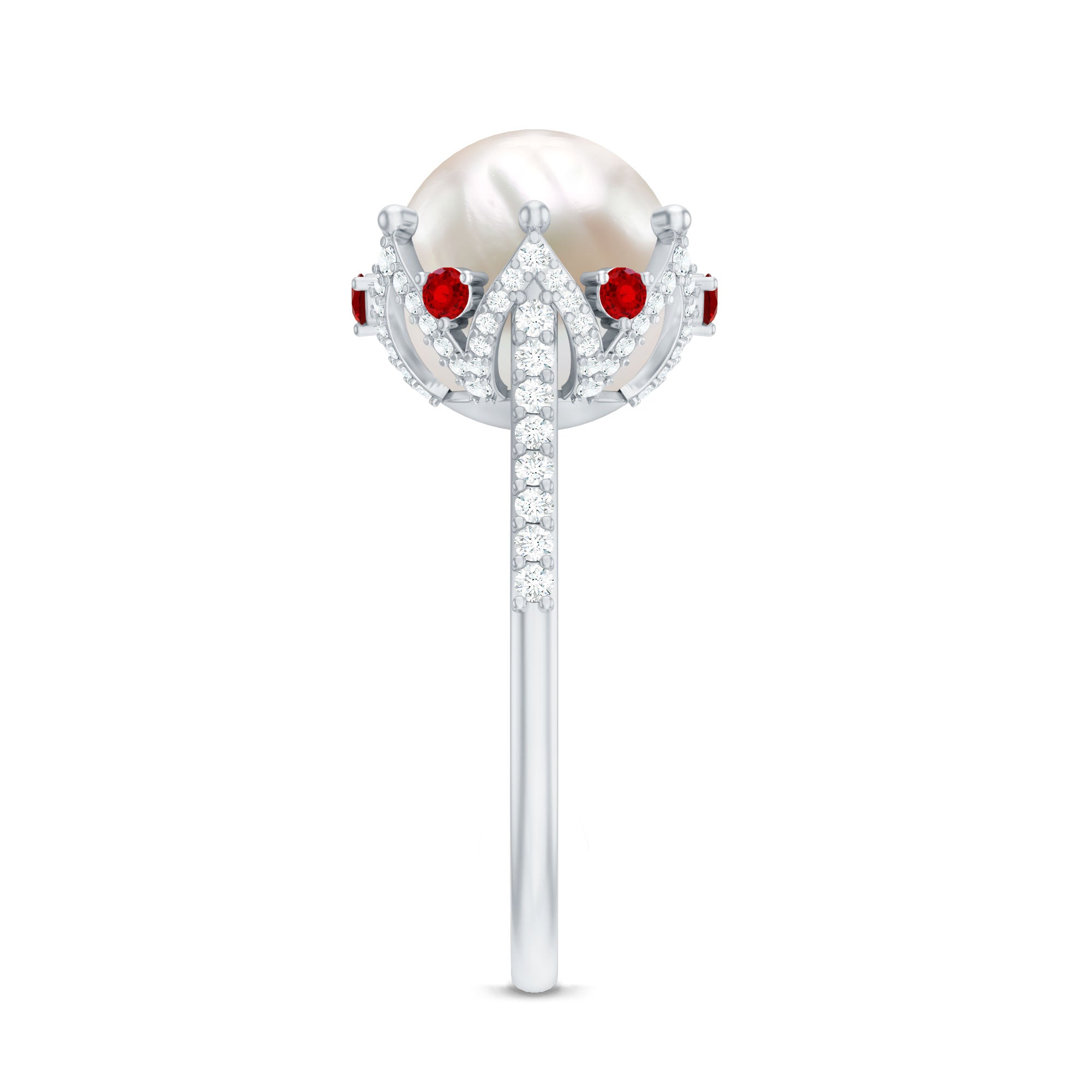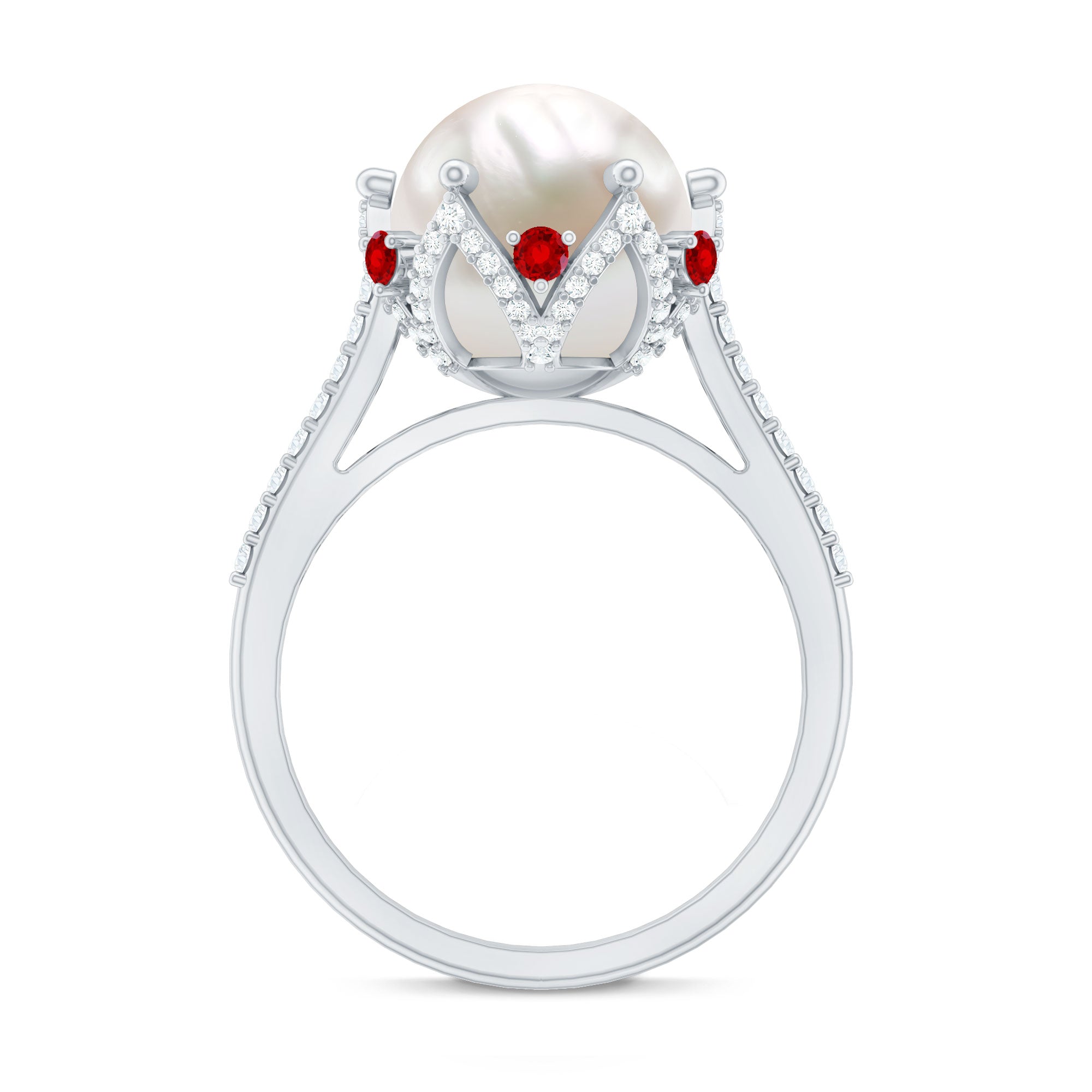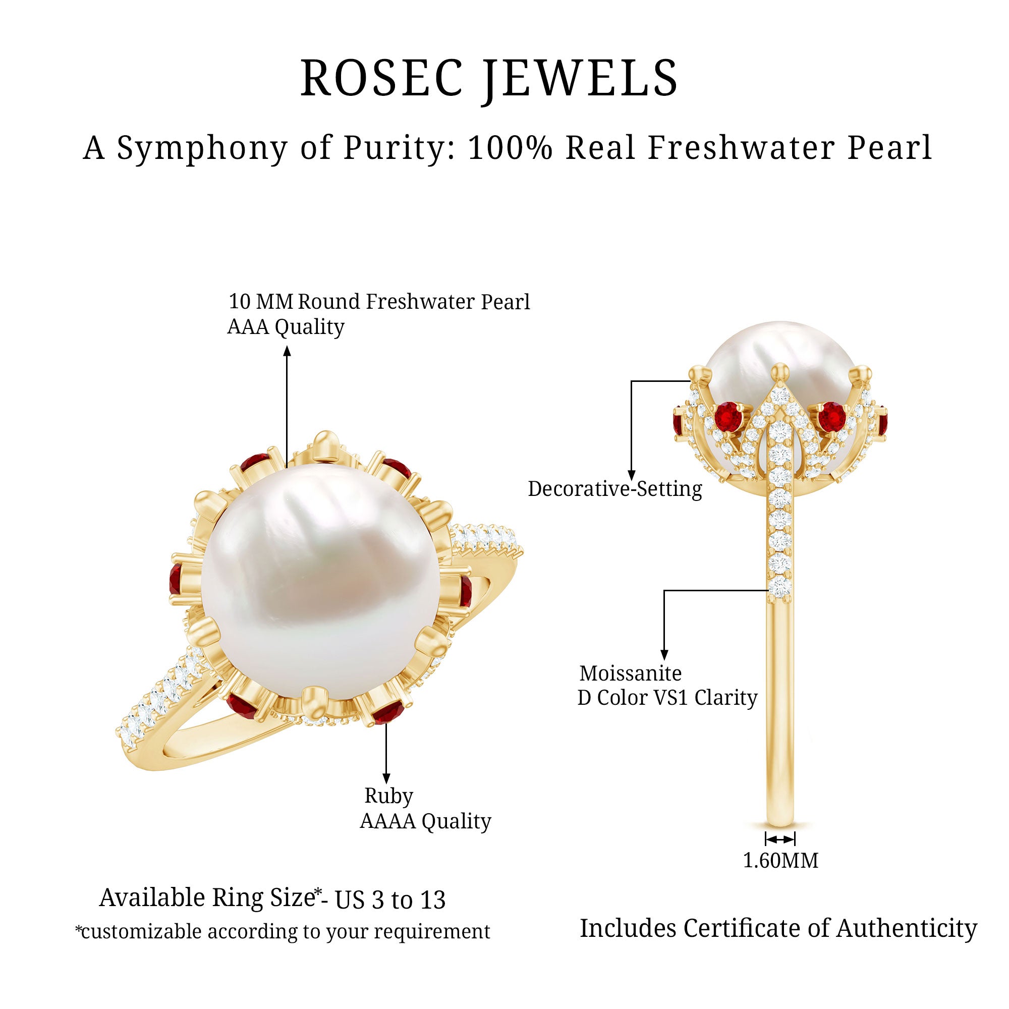 Make a bold and timeless statement with this exquisite Pearl Cocktail Ring. At the center of attention is a round Freshwater Pearl, elegantly set in a decorative prong setting. Surrounding the pearl, round rubies and Moissanite gemstones add a touch of vibrant color and brilliant sparkle, creating a captivating contrast. This Pearl Ring stands out as a standalone piece of jewelry, commanding attention and exuding elegance.