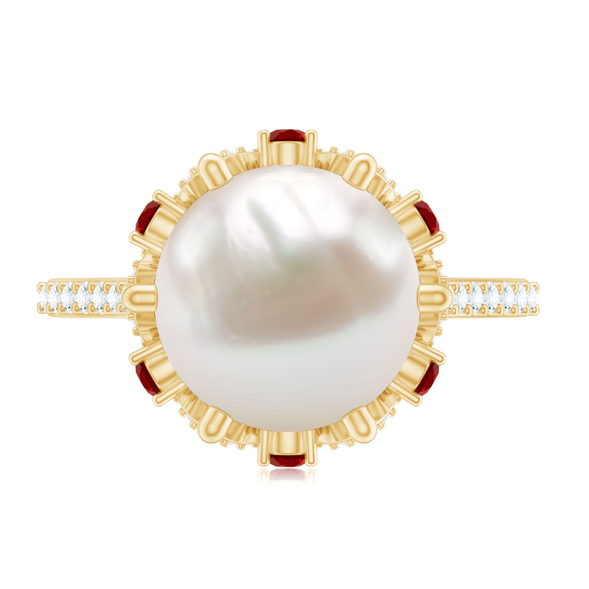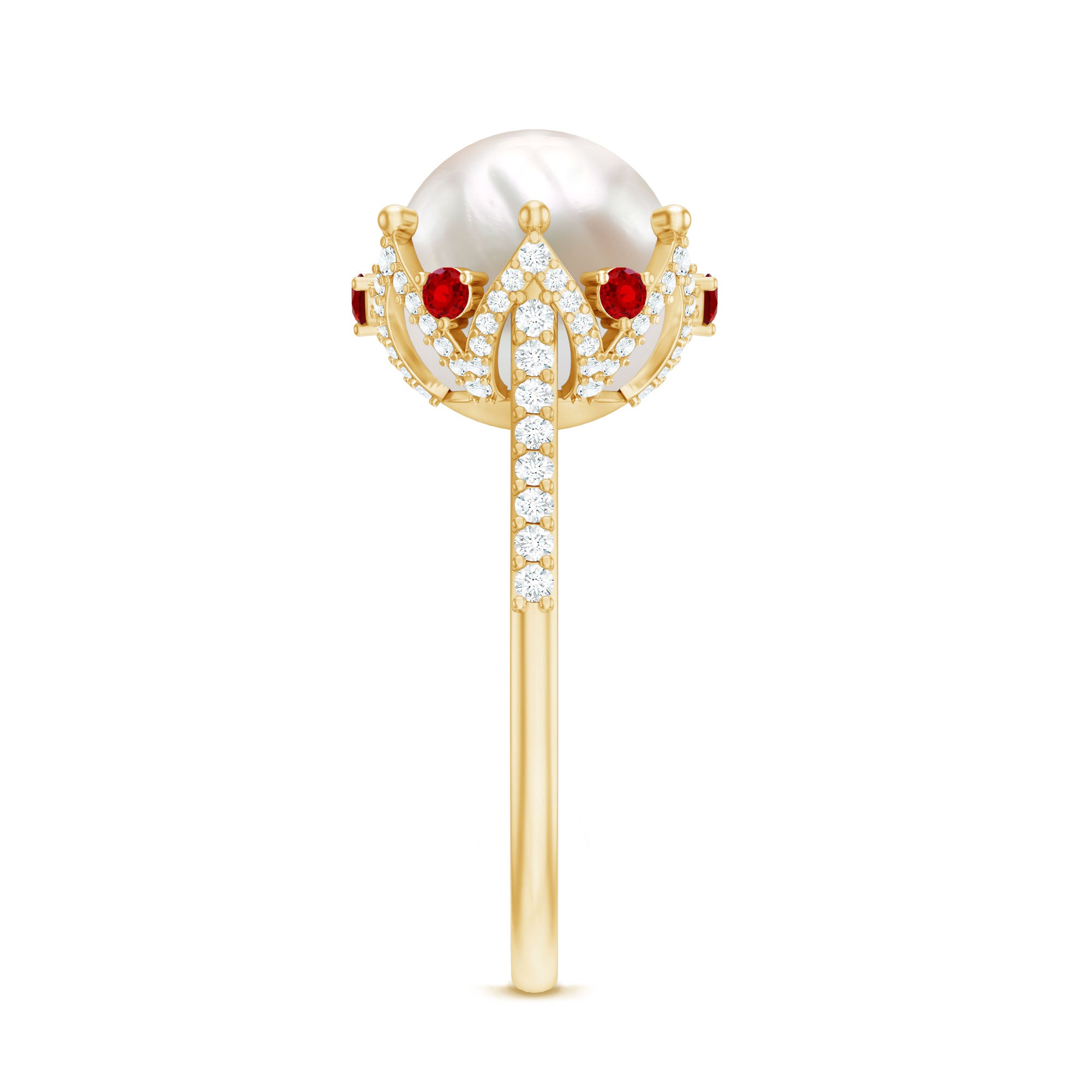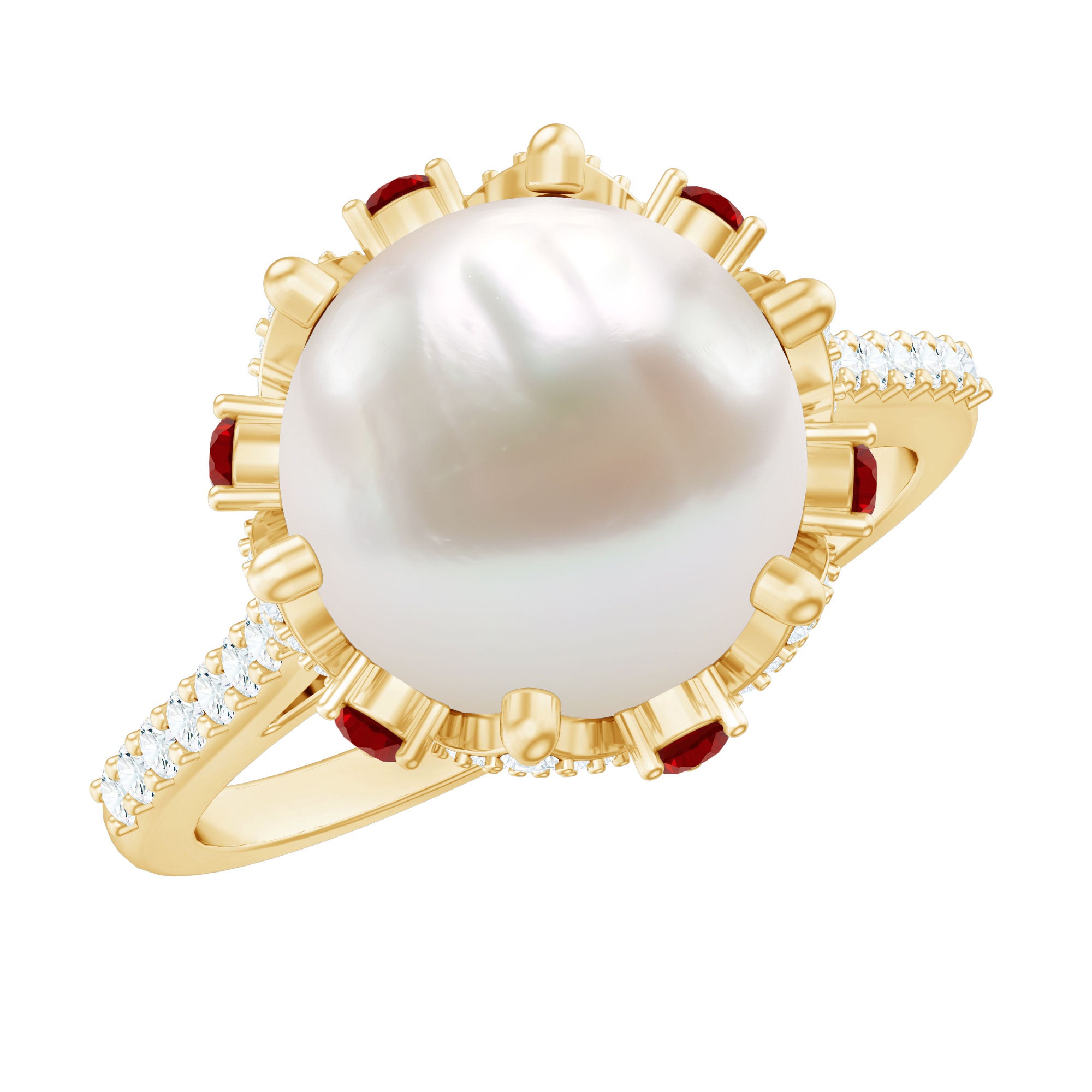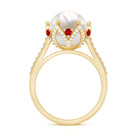 Make a bold and timeless statement with this exquisite Pearl Cocktail Ring. At the center of attention is a round Freshwater Pearl, elegantly set in a decorative prong setting. Surrounding the pearl, round rubies and Moissanite gemstones add a touch of vibrant color and brilliant sparkle, creating a captivating contrast. This Pearl Ring stands out as a standalone piece of jewelry, commanding attention and exuding elegance.