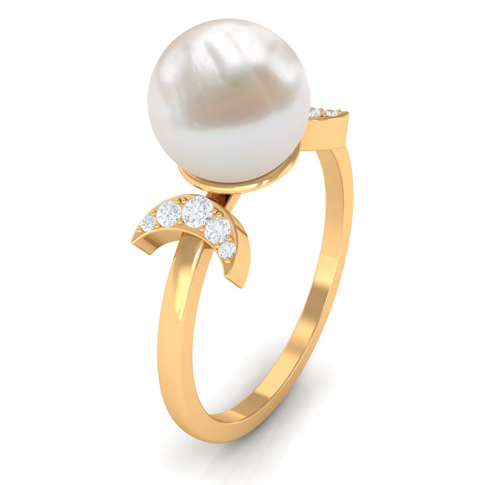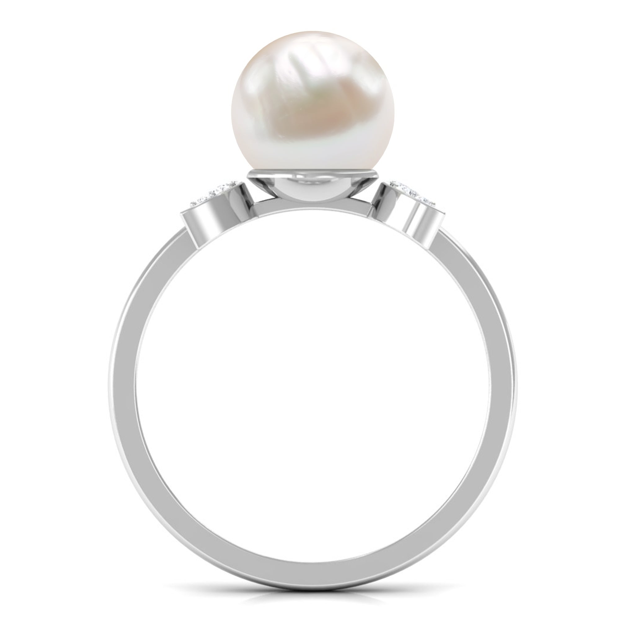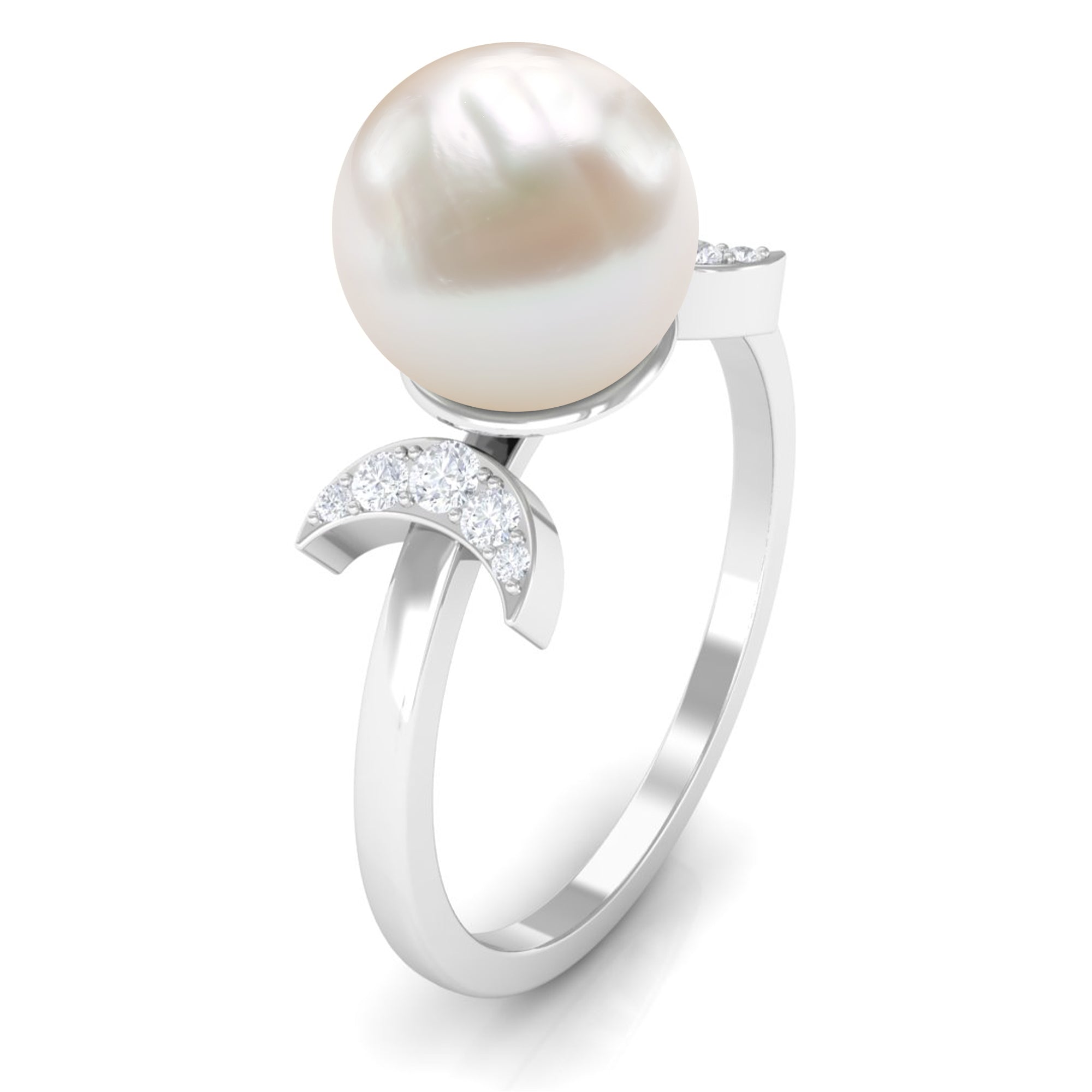 Providing this timeless and elegant ring style with a contemporary twist, one round shape freshwater pearl illuminates from a traditional bead setting along with round Diamond creating a half moon design on both sides. Offering unique contrast, the amazing Freshwater Pearl Designer Engagement Ring. Treat her with our new White Pearl and Diamond Engagement Ring and your unconditional love.