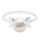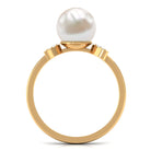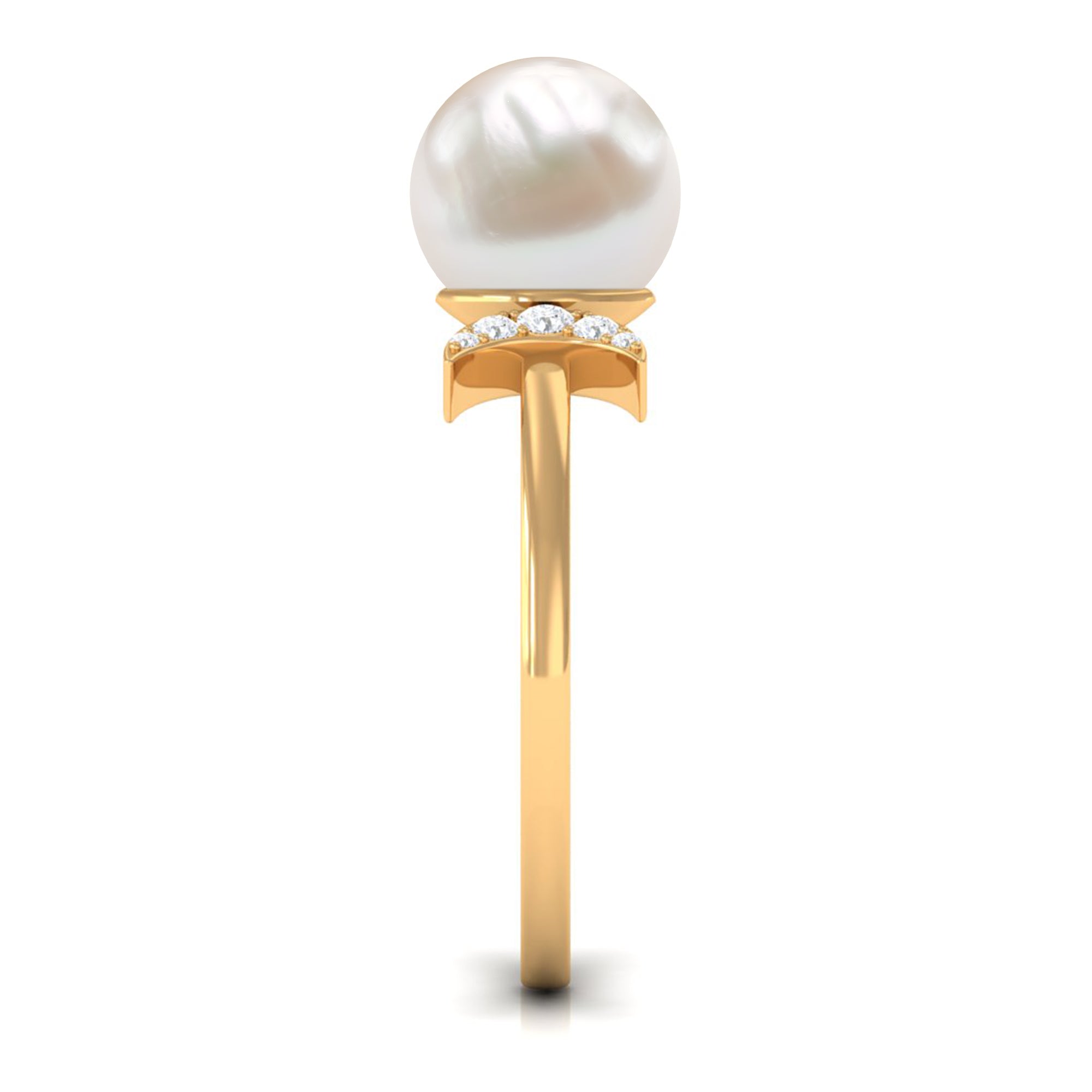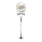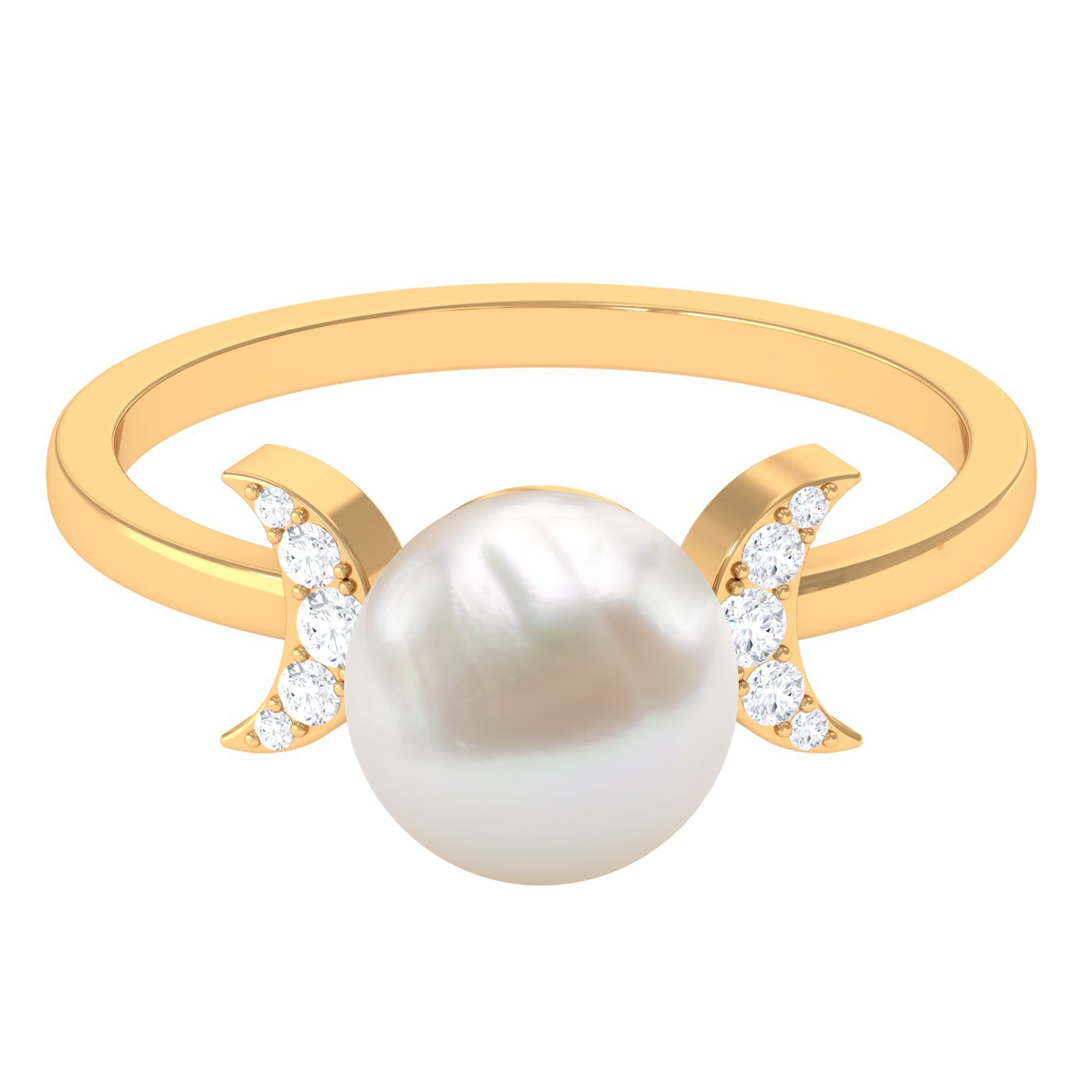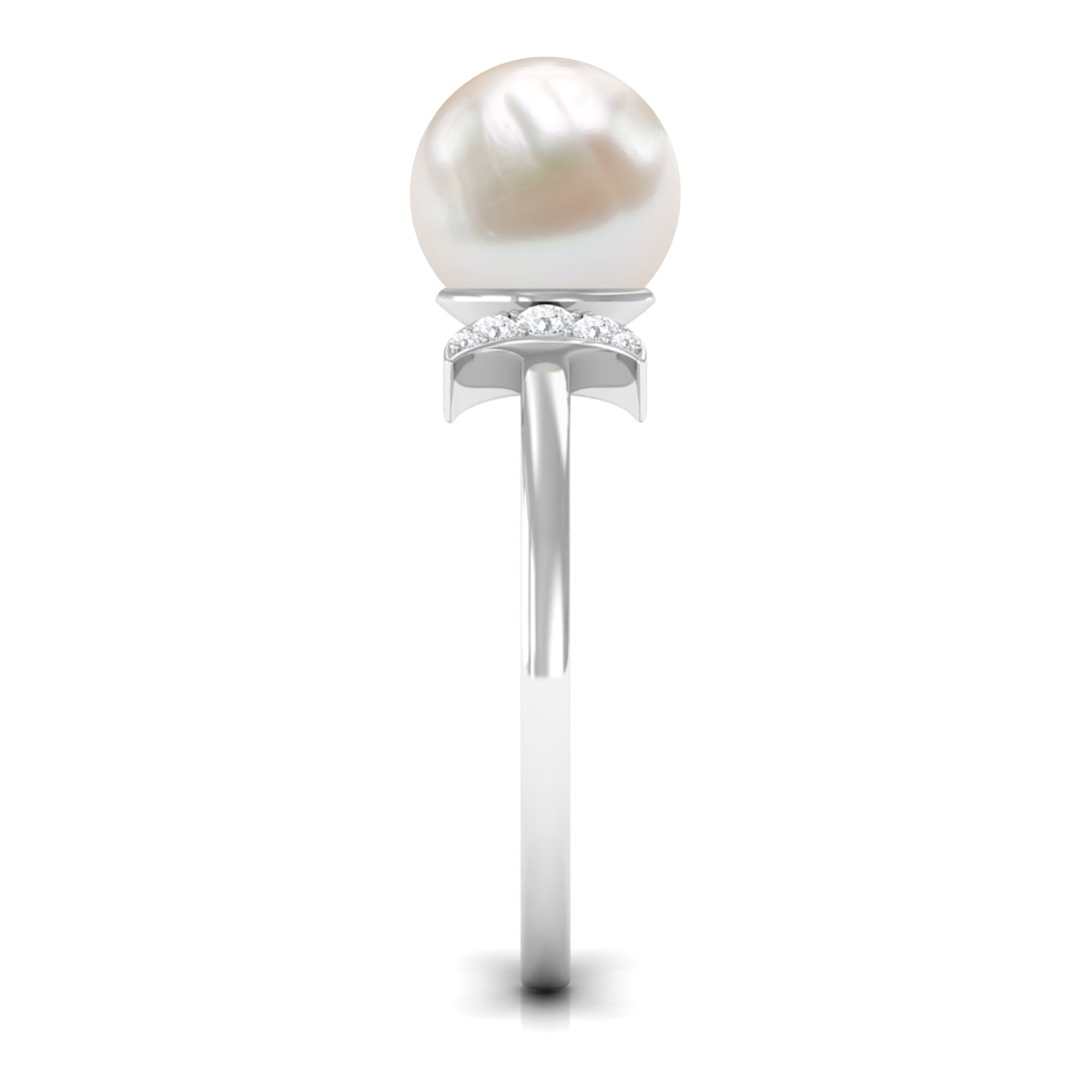 Providing this timeless and elegant ring style with a contemporary twist, one round shape freshwater pearl illuminates from a traditional bead setting along with round Diamond creating a half moon design on both sides. Offering unique contrast, the amazing Freshwater Pearl Designer Engagement Ring. Treat her with our new White Pearl and Diamond Engagement Ring and your unconditional love.
