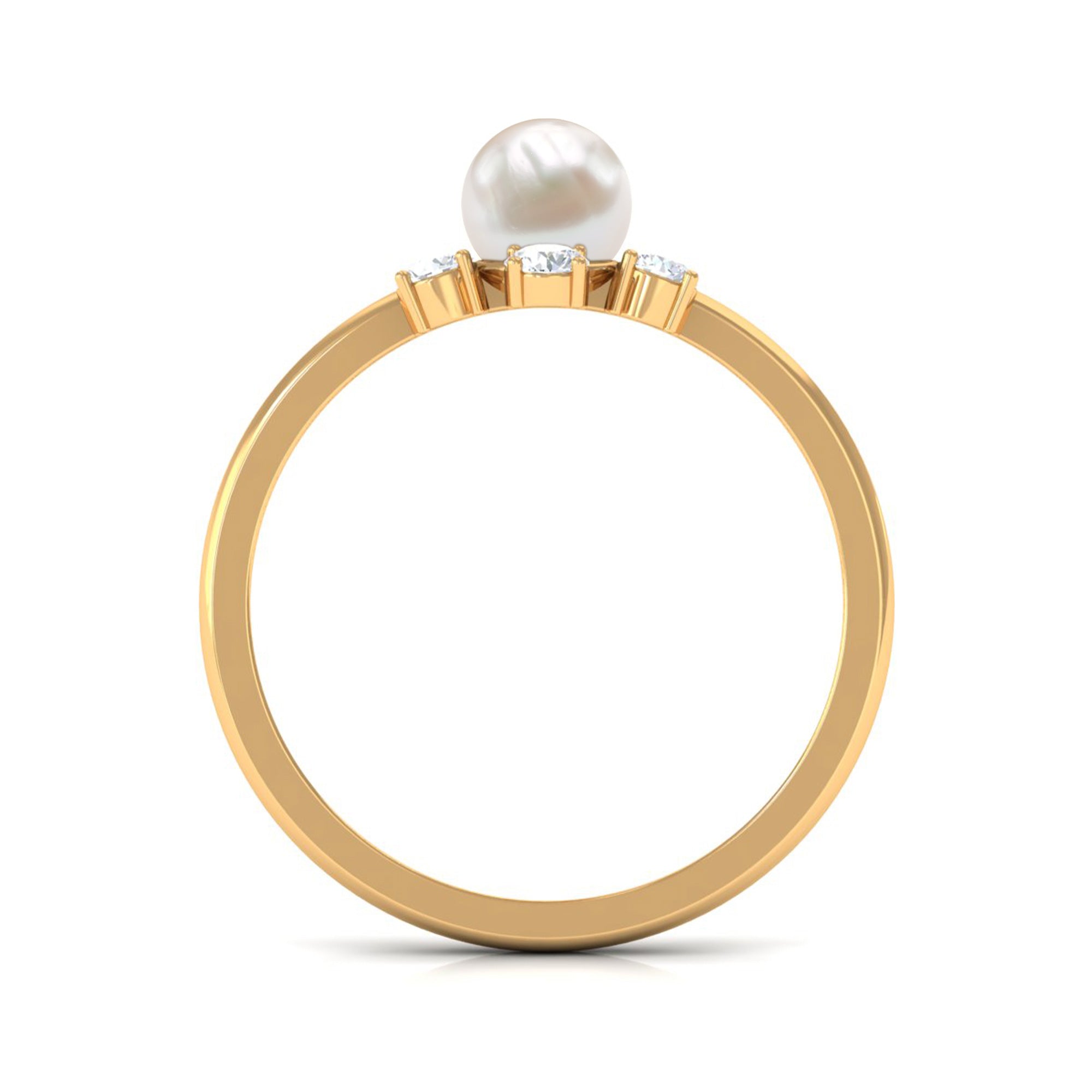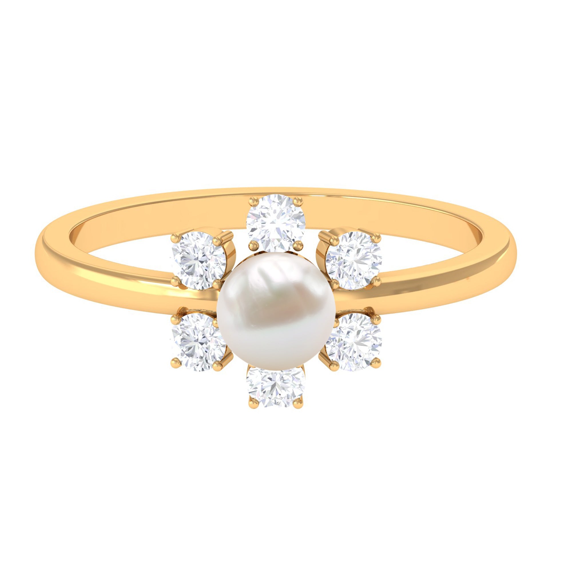 Contemporary Floral design this ring has a unique solitaire White Pearl with shining metal and a sculptural look. Amazingly crafted in Gold with a round shape Freshwater Pearl having Diamond accentuating it. Stunningly adorn yourself with this timeless Freshwater Pearl jewelry.