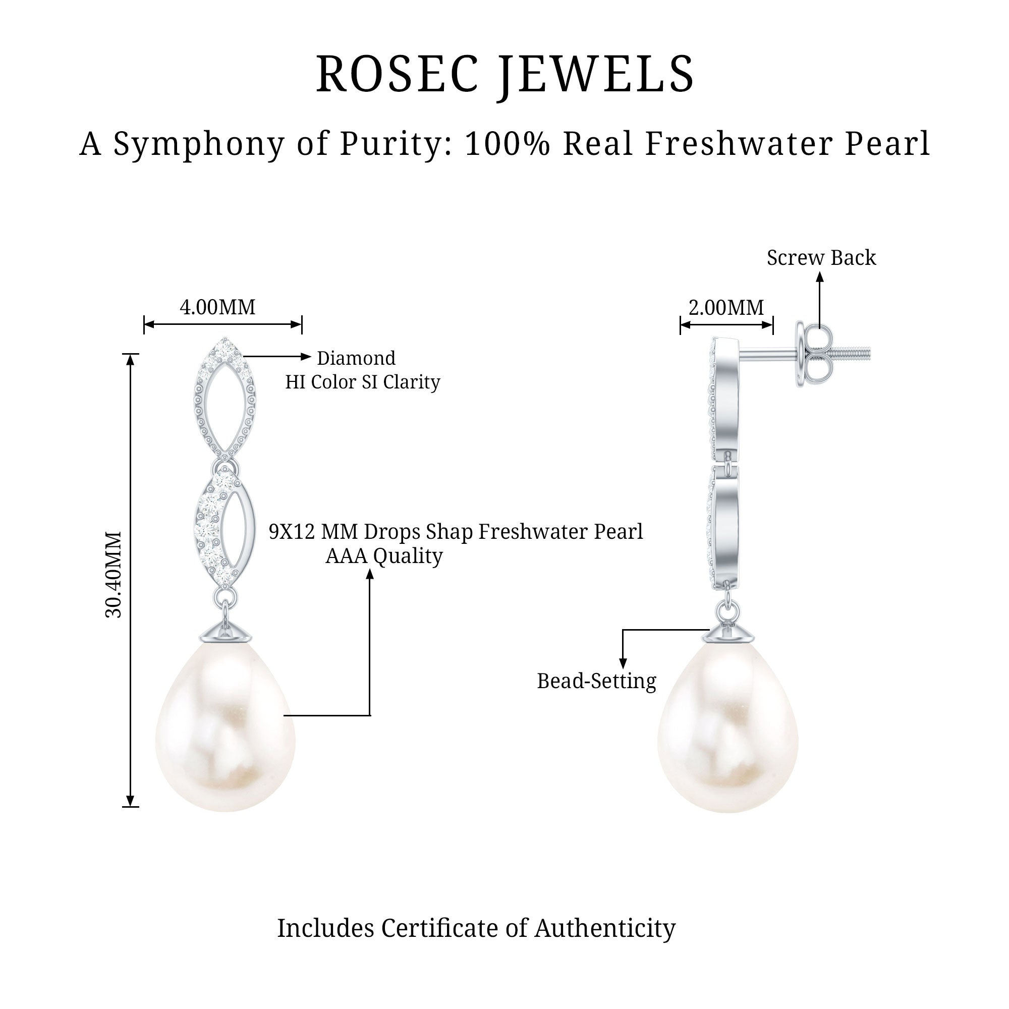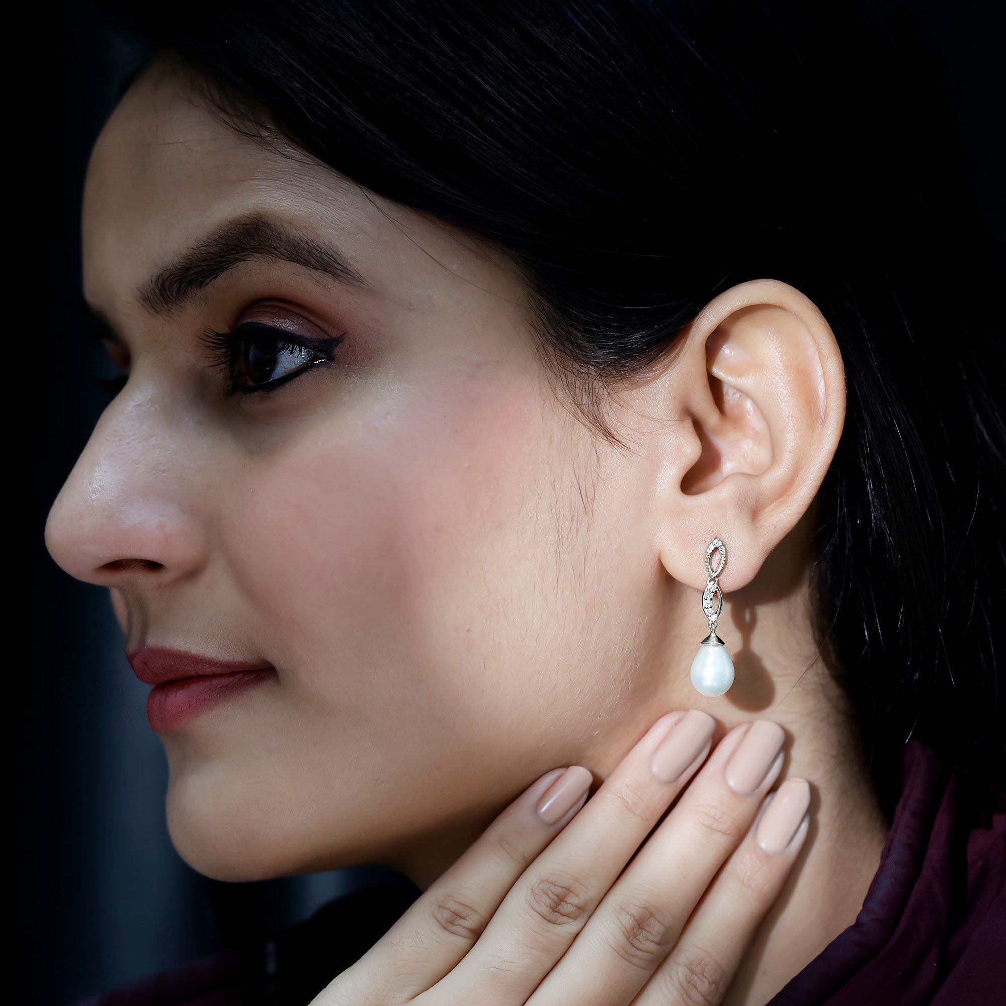 Embrace the infinite possibilities of love with these exquisite white freshwater pearls and Diamond infinity drop earrings. Adorned with a graceful infinity symbol, these earrings shimmer with the radiant brilliance of 9X12 MM pearl drops and sparkling Diamond encrusted over the infinity symbol, creating a dazzling display that will surely get attention. Together, these two precious gems create a truly breathtaking piece of jewelry that is perfect for any occasion.