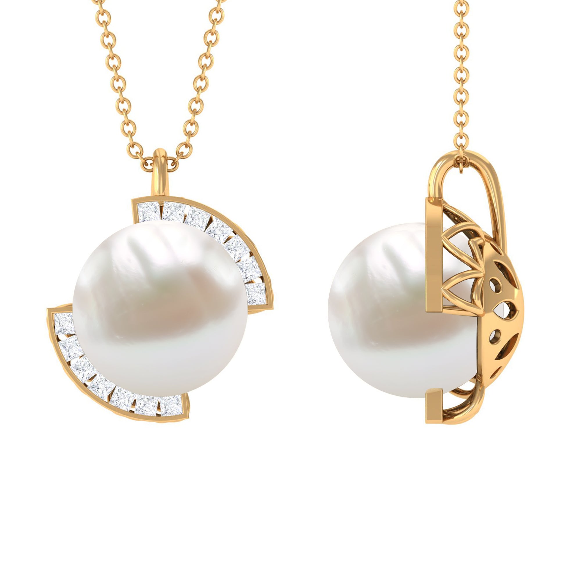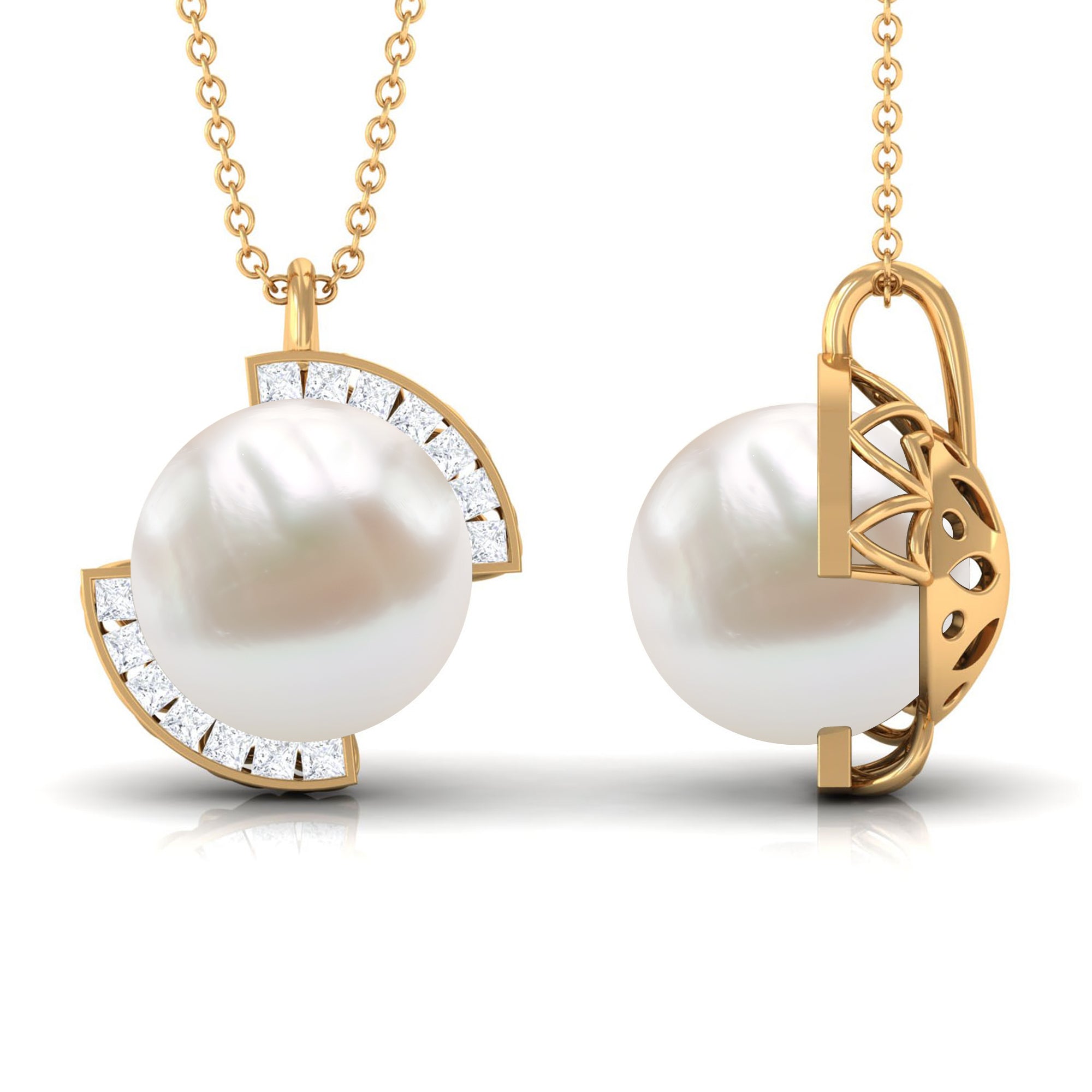 Bring a smile to her face by presenting this beautiful Minimal Pendant Necklace. Embellished with a Round Shape Freshwater Pearl and Princess Cut Diamonds. This Pearl Pendant Necklace will make a pleasant addition to her jewelry collection, something she would always keep close to her heart.