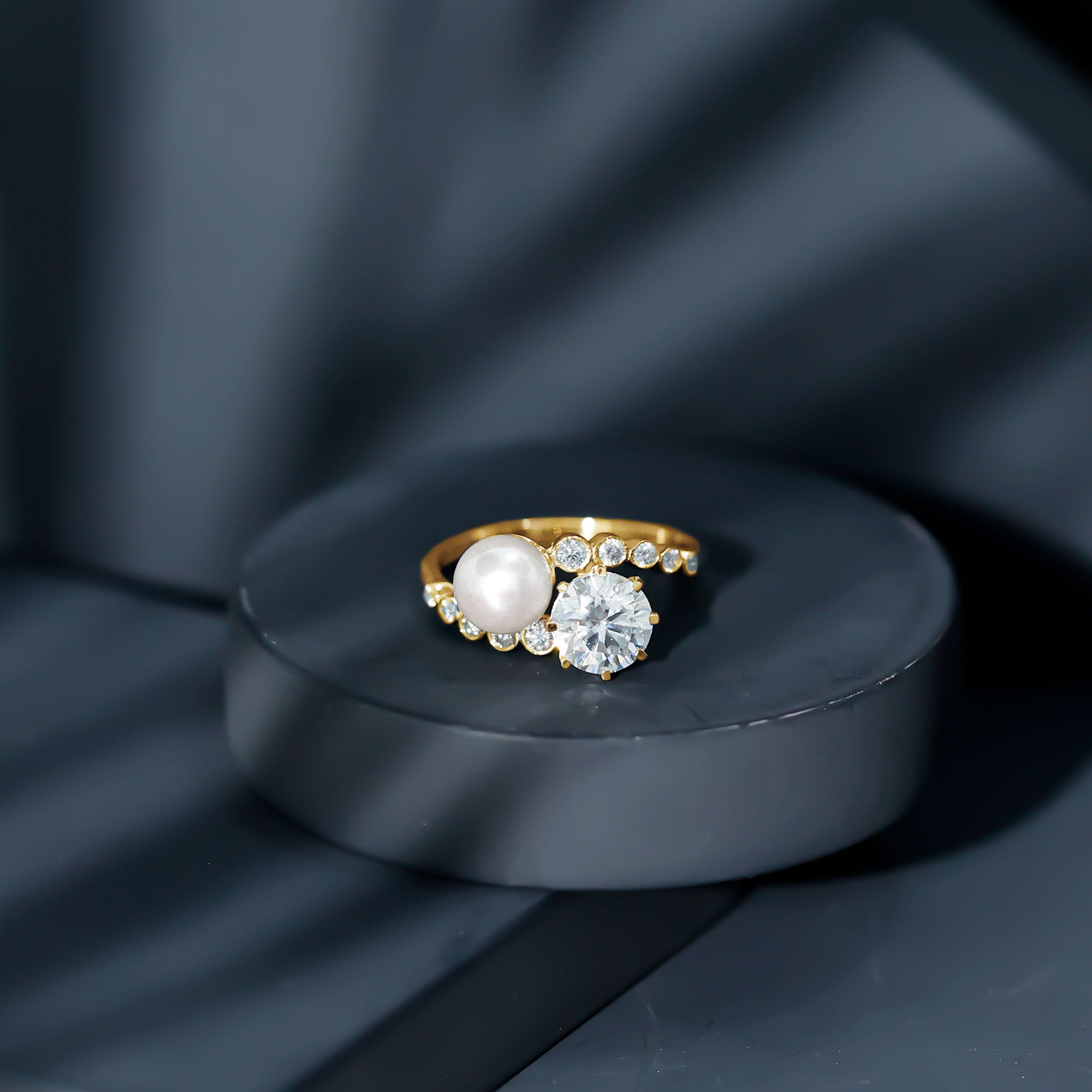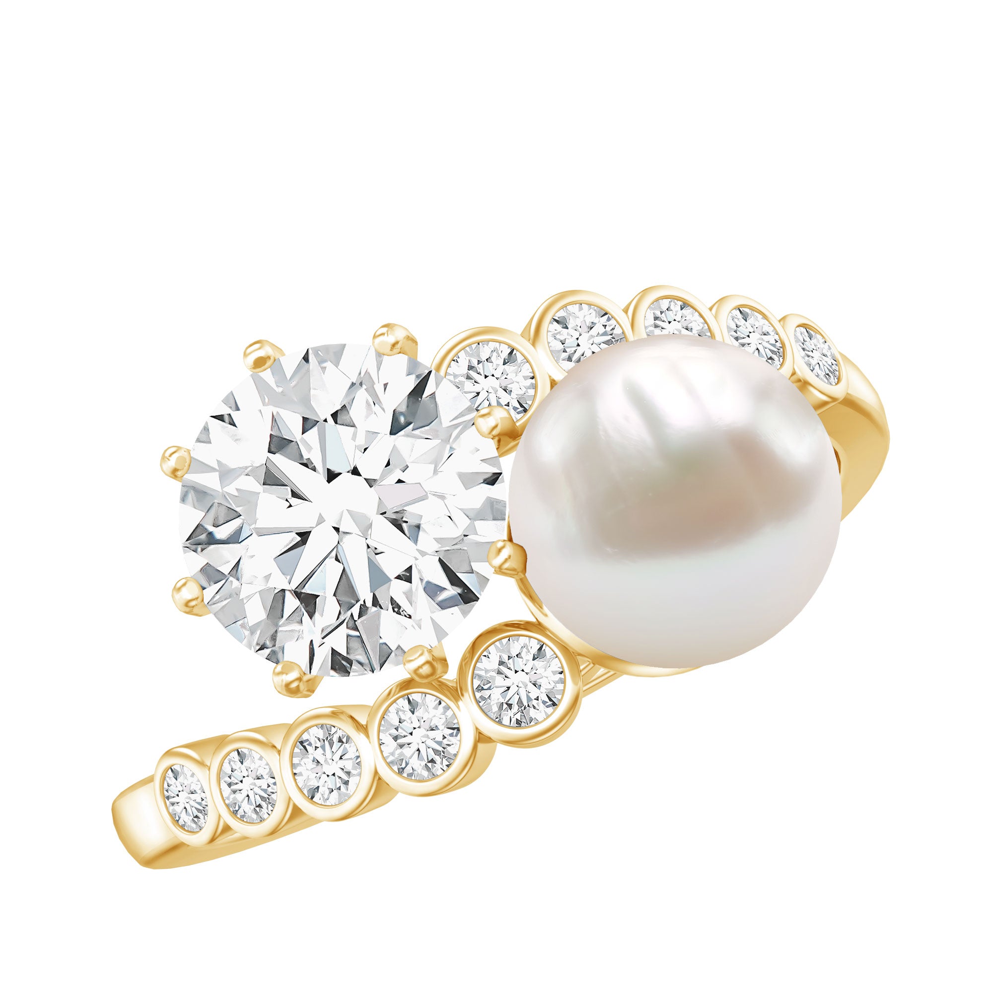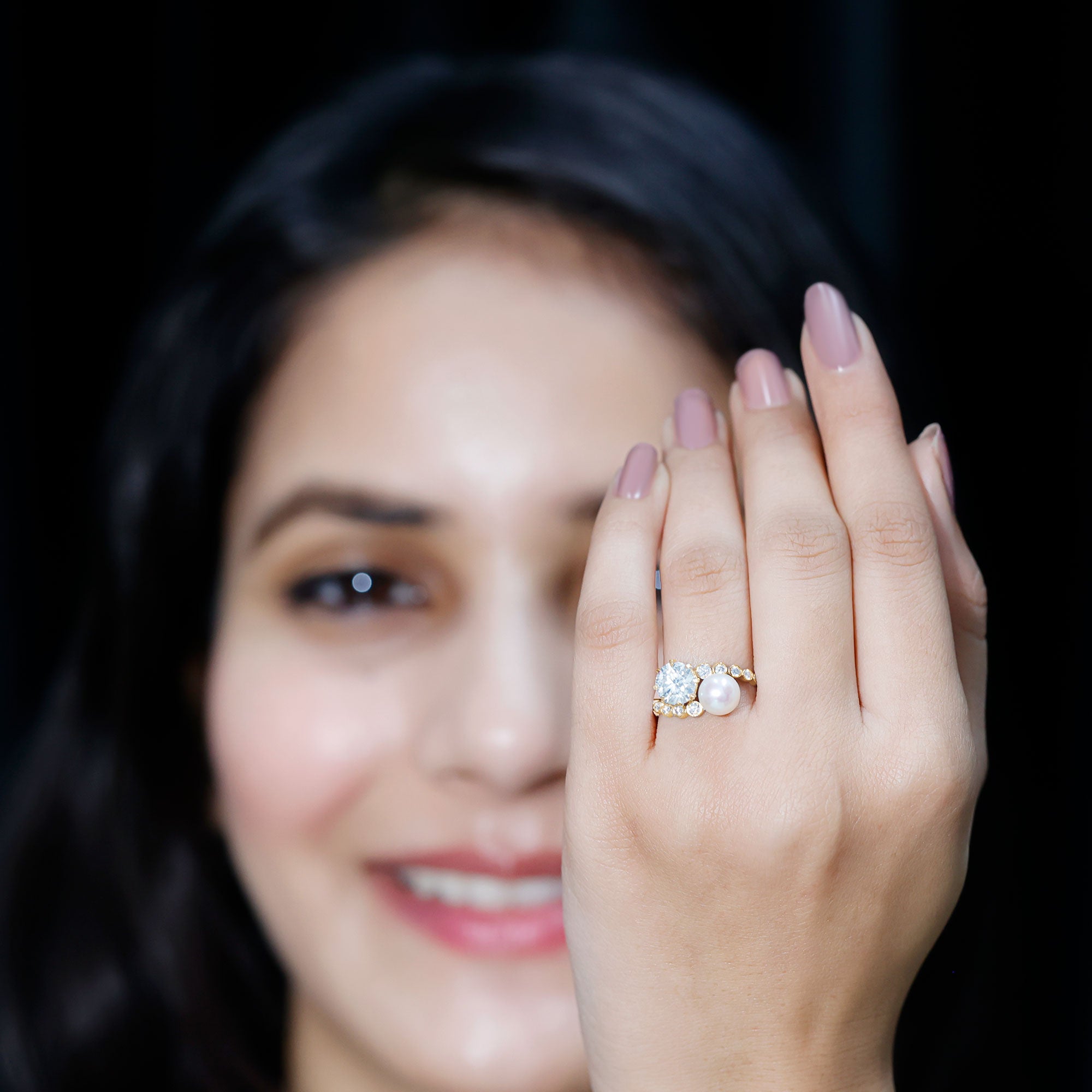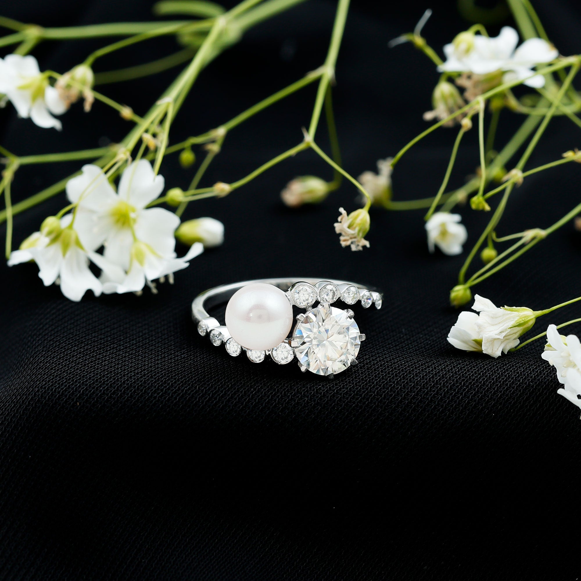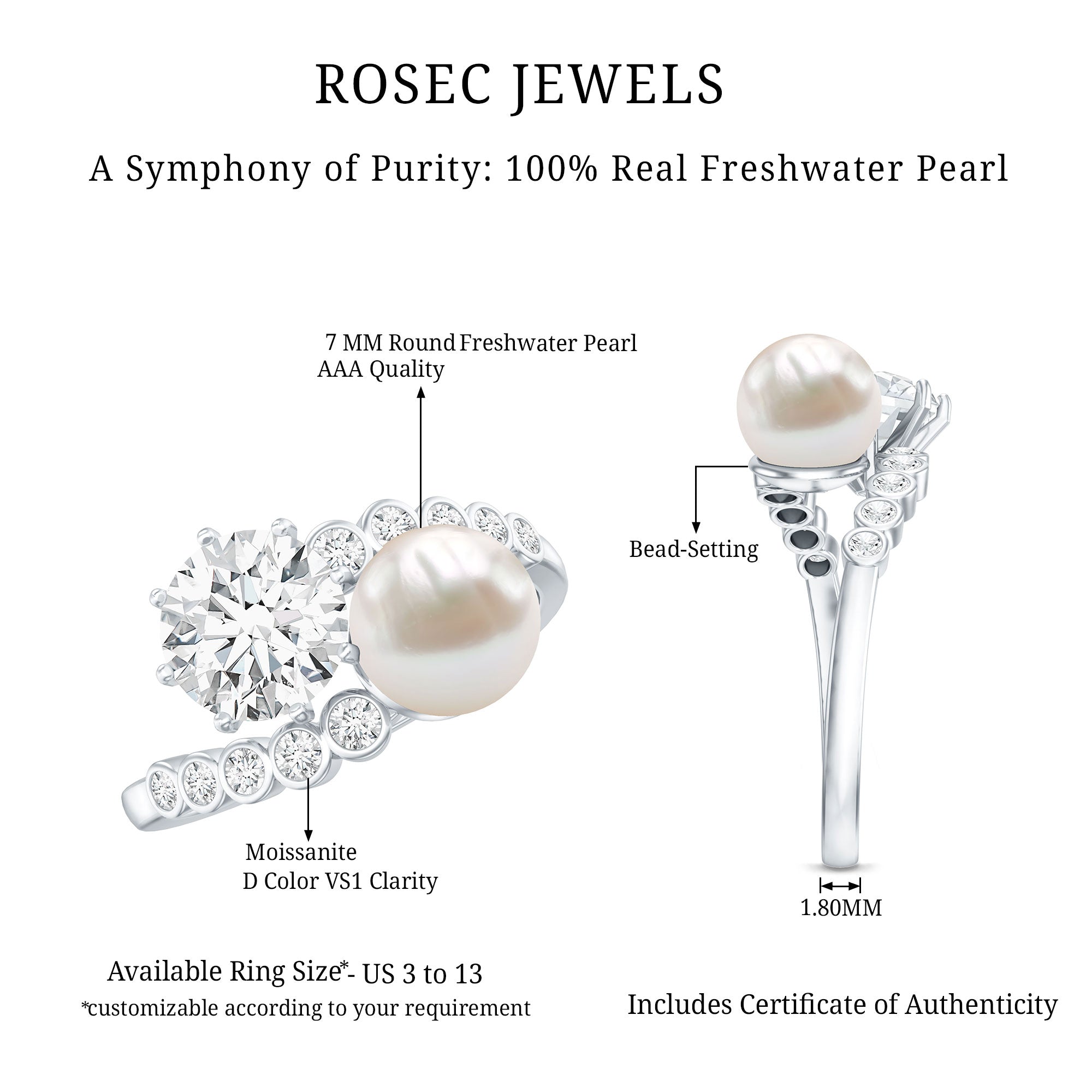 Get this breathtaking Cocktail Ring for your lovely wife and show her your love. This Two Stone Ring features 7 MM Freshwater Pearl and Moissanite over the Bypass Shank studded with dainty Moissanite gemstones. She will flutter with love and joy and will always keep this Pearl Ring close to her heart.