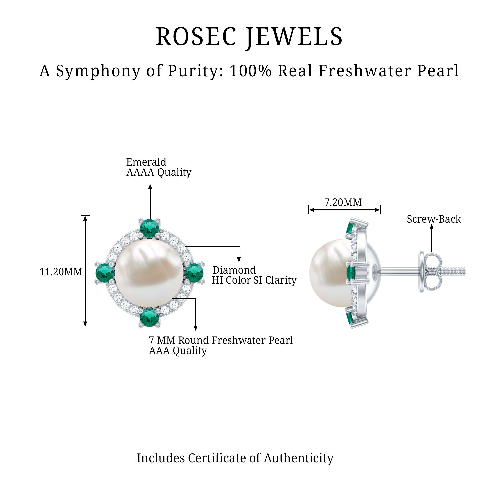 Freshwater Pearl Diamond Halo Stud Earrings with Created Emerald
