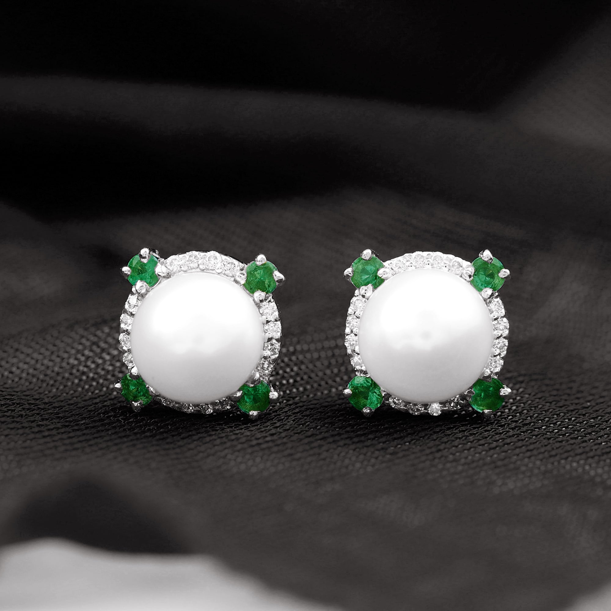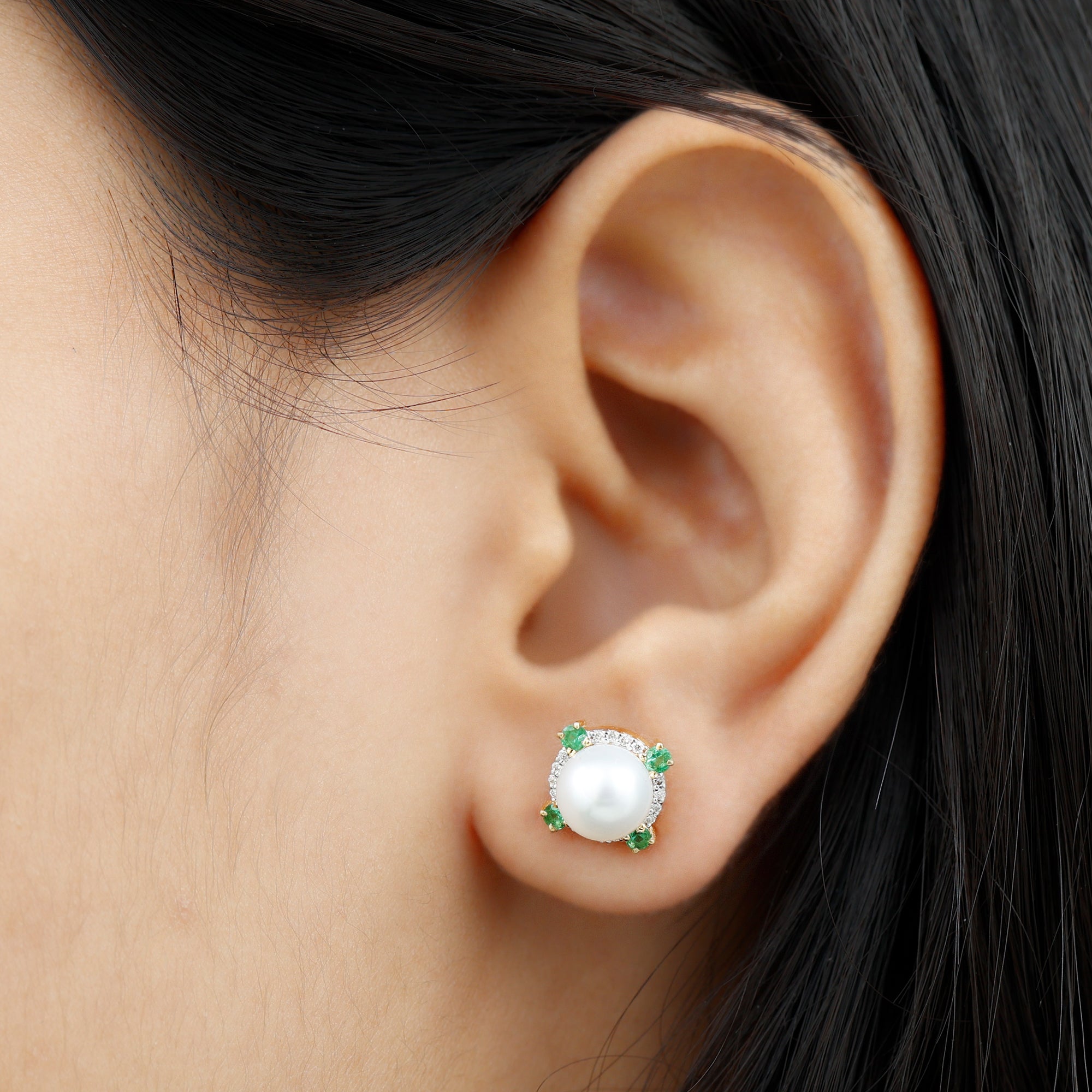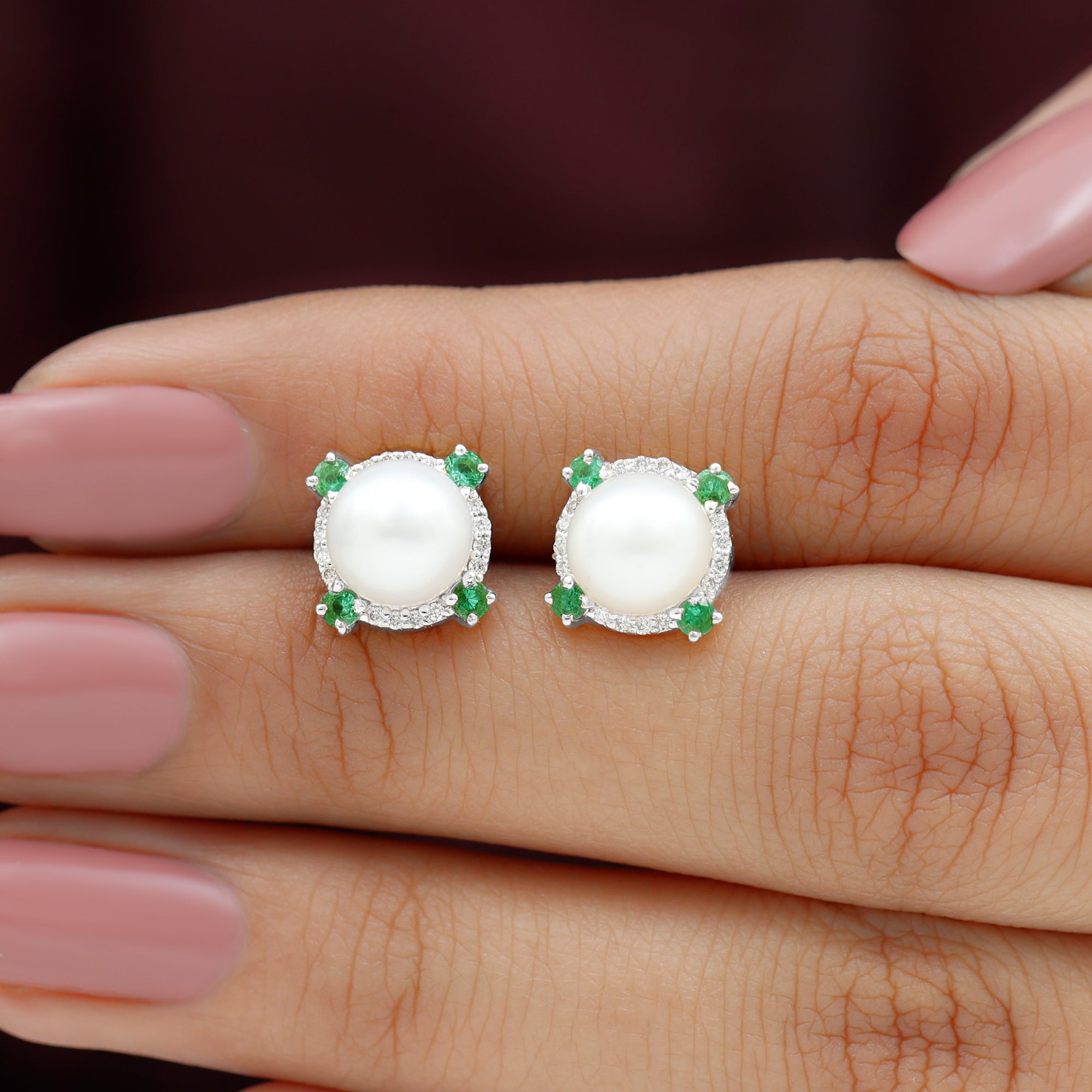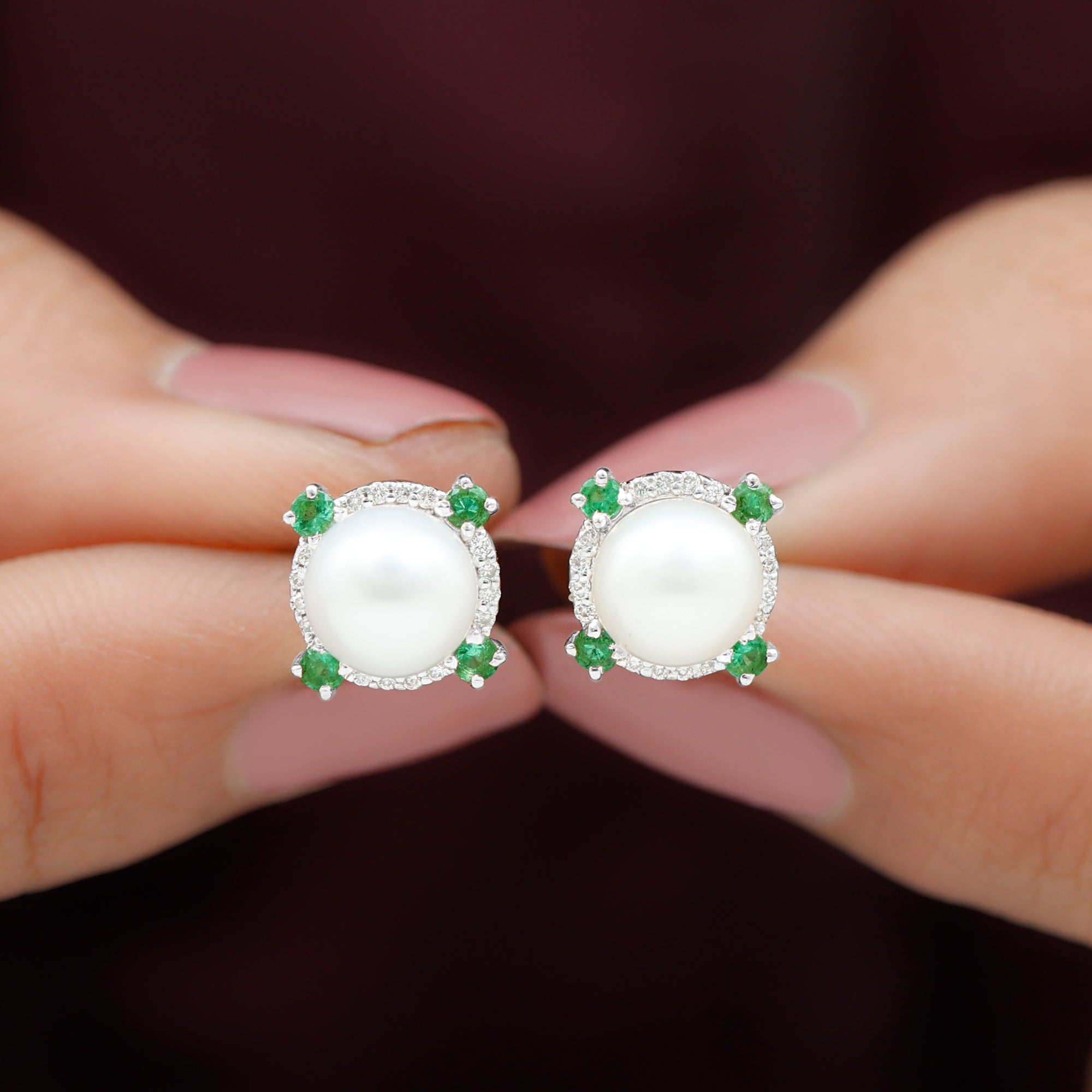 Grab these amazing Halo Stud Earrings embellished with Round Shape Freshwater Pearl secured by Bead Setting and dainty Round Diamonds and Lab Grown Emerald studded as Halo. Look charming no matter where you are heading, out for a coffee, or a party with your best friends when you wear these Pearl Earrings. Make her Christmas wish come true by getting her a precious pair like these Freshwater Pearl Earrings as a christmas gift.
