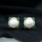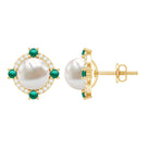 Freshwater Pearl Diamond Halo Stud Earrings with Created Emerald