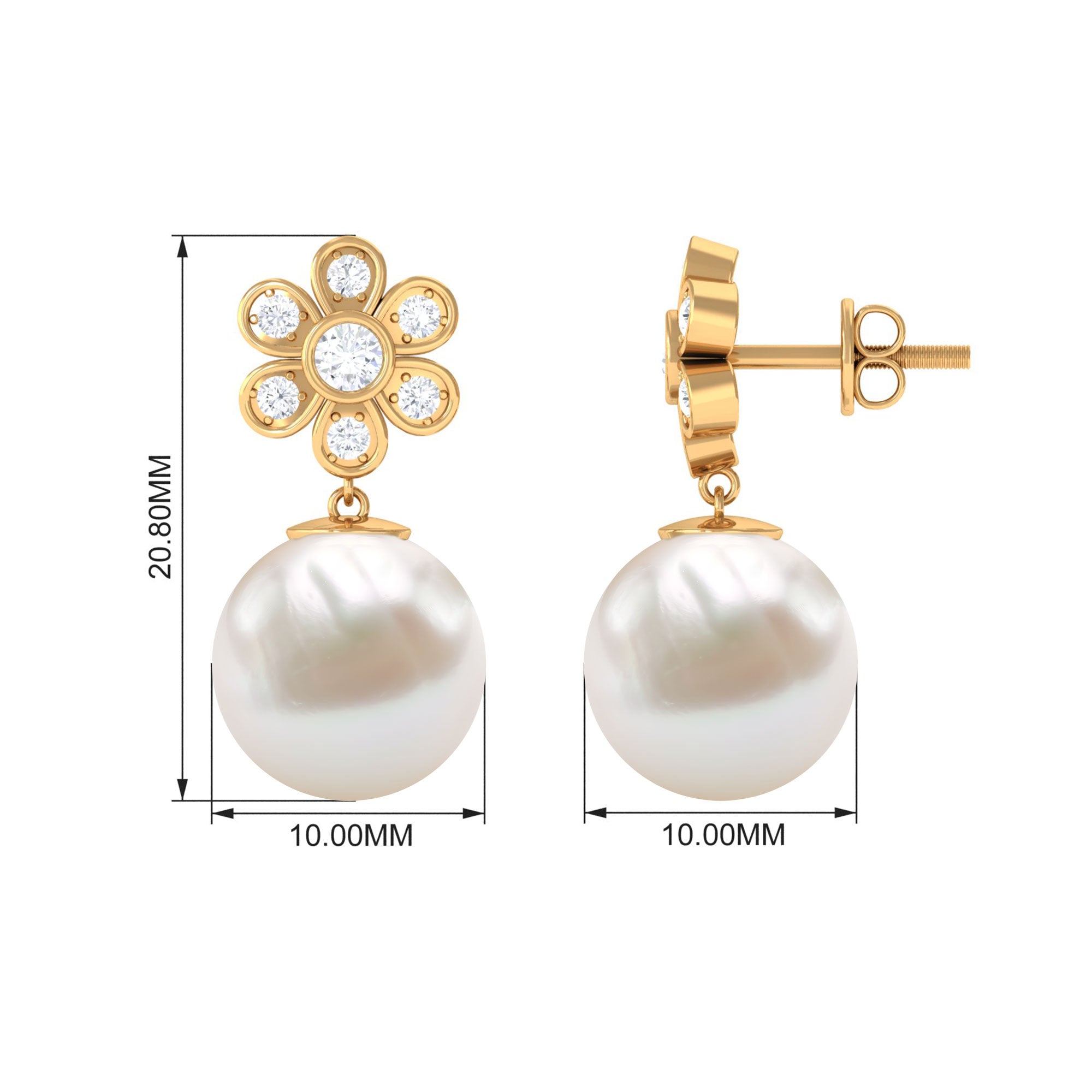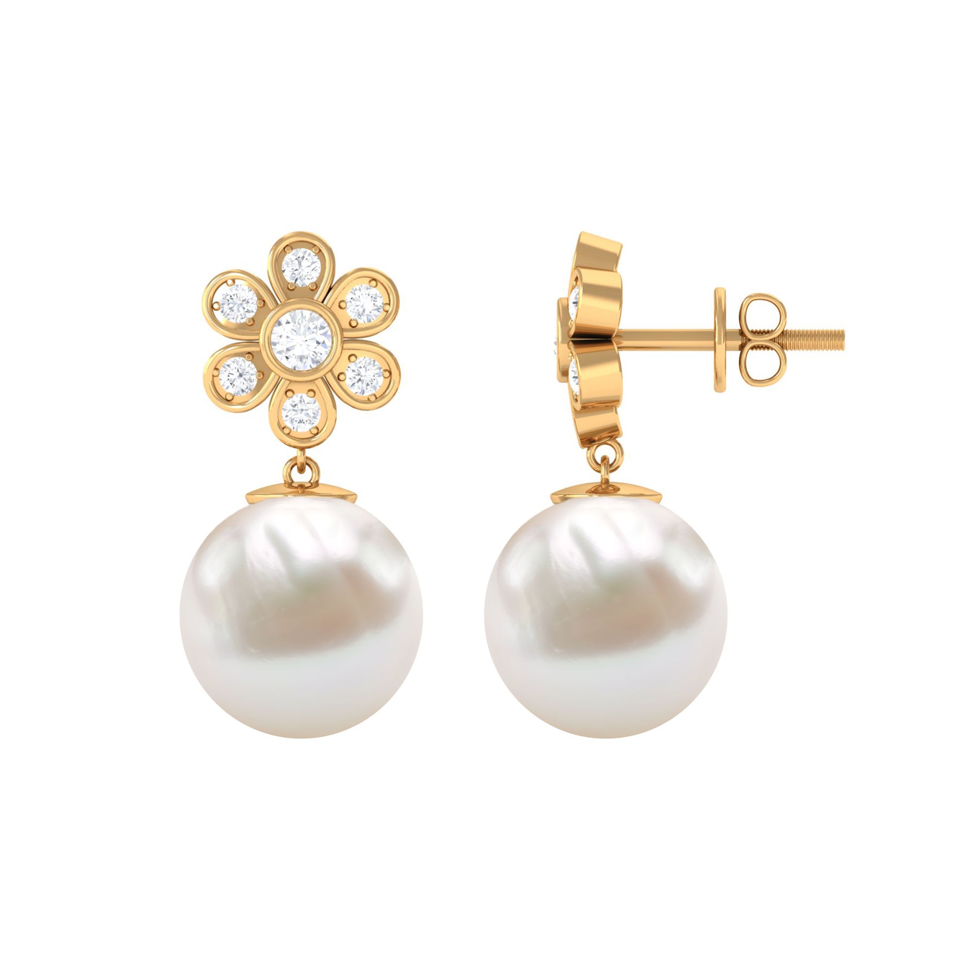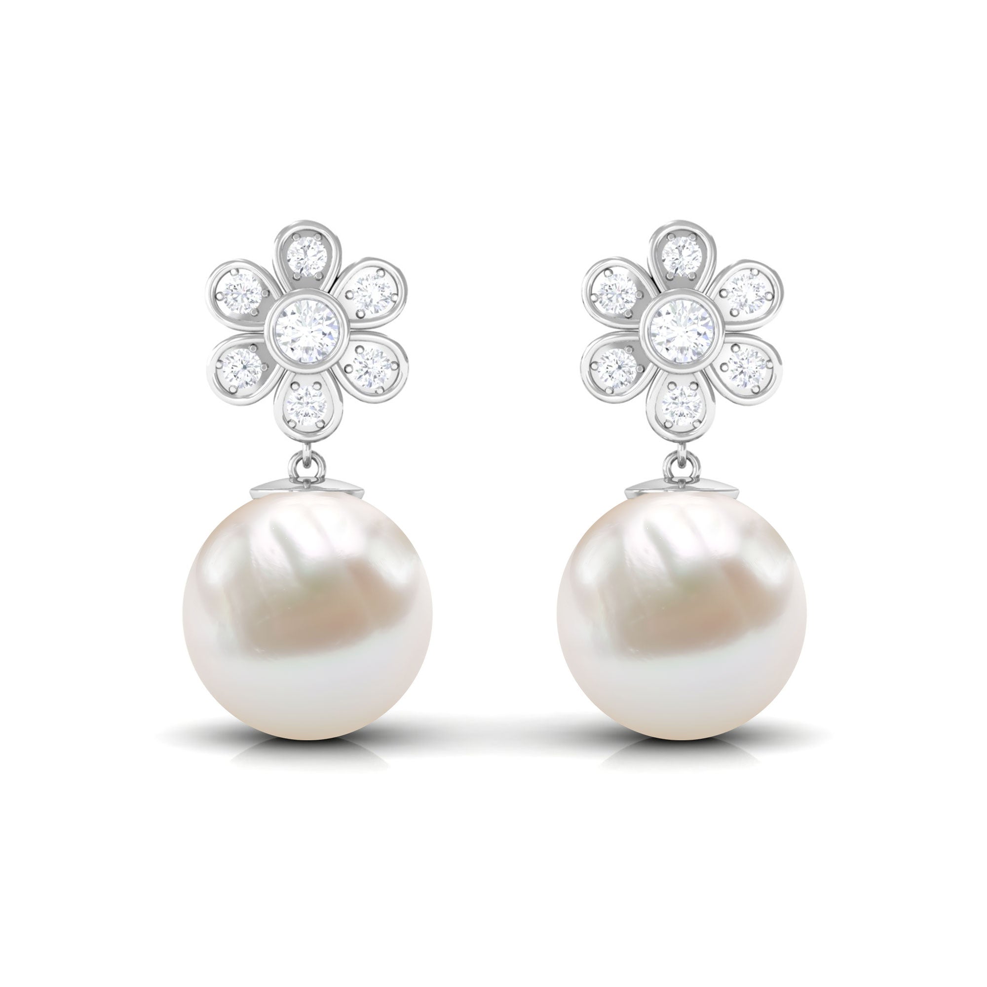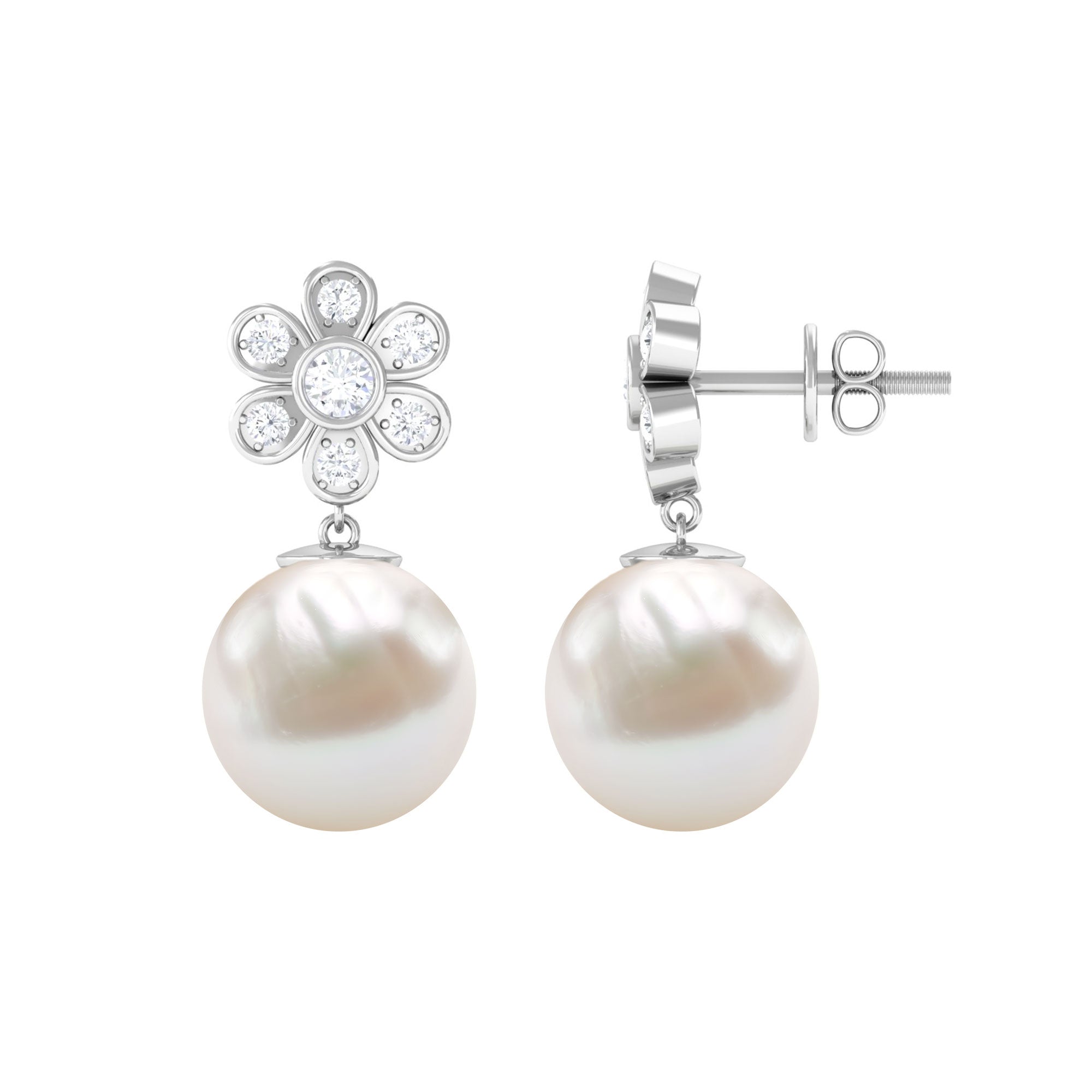 Freshwater Pearl Drop Earrings with Bezel Set Diamond Flower