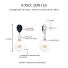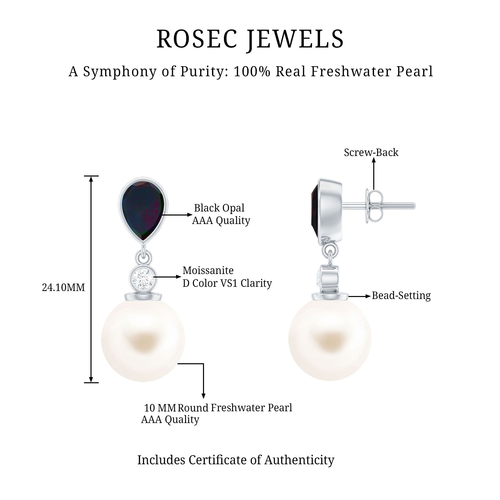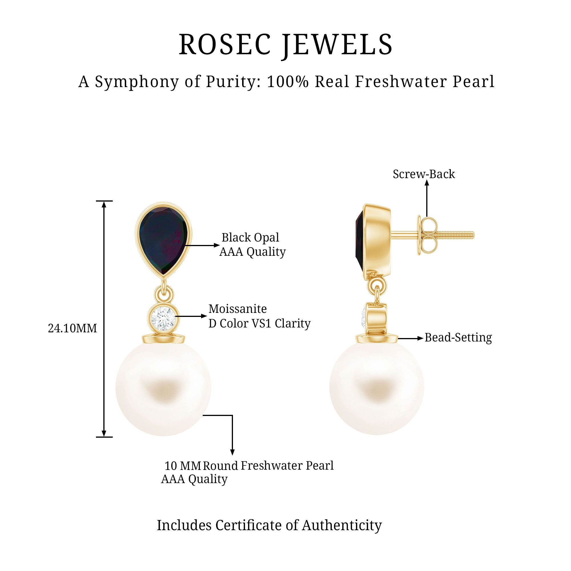 Behold the captivating beauty of these Freshwater Pearl Earrings secured with Screw Back Closure, a stunning piece of jewelry that instantly mesmerizes. A Round Shape White Freshwater Pearl delicately hangs as a drop, accentuated by a lustrous Pear Cut Black Opal on top in a bezel setting, and further adorned with Moissanite for a touch of luxury.