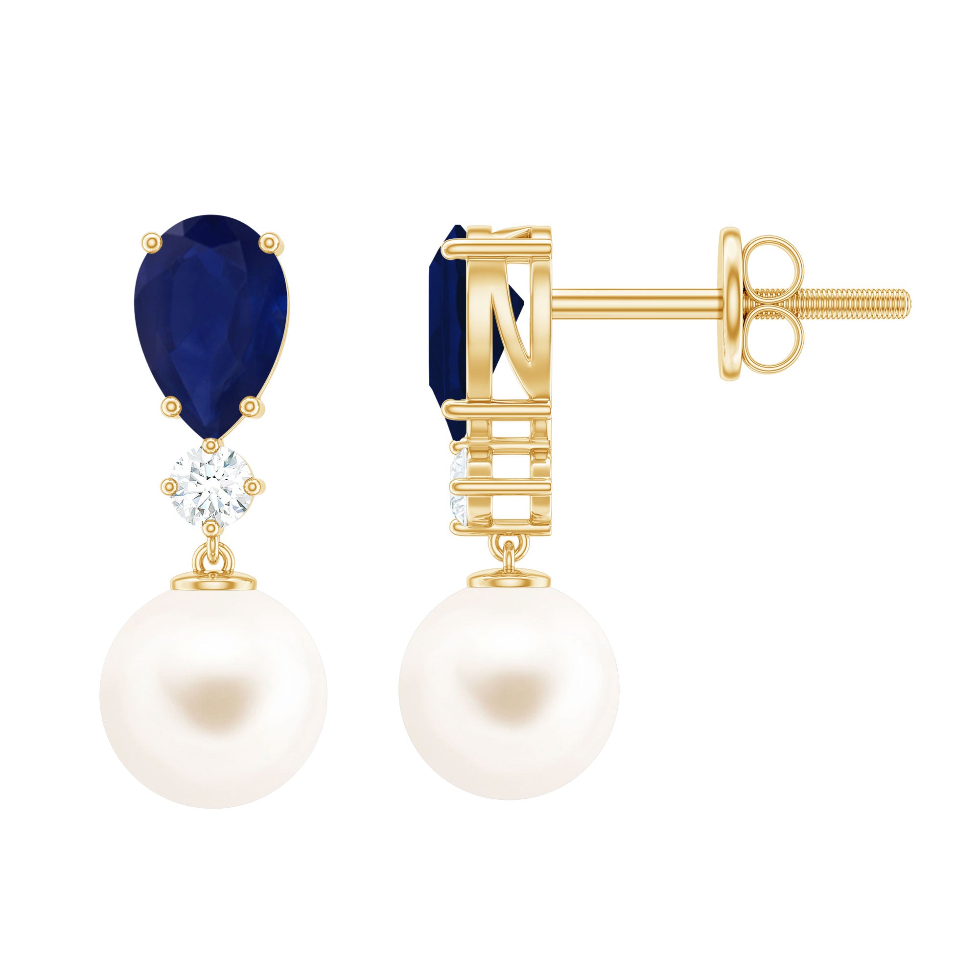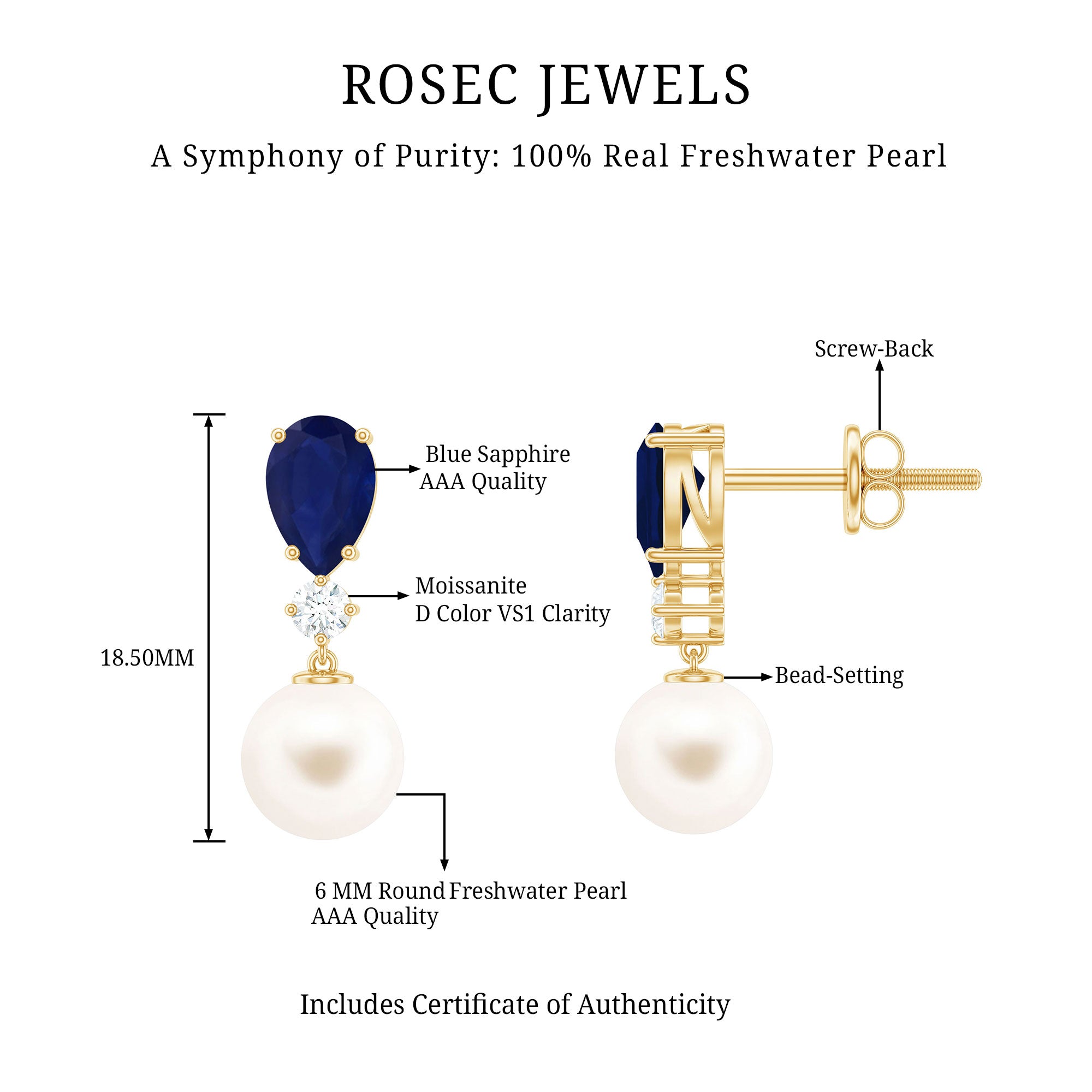 Make a fashion statement when you wear these Freshwater Pearl Earrings. Adorned with Round Shape Freshwater Pearl in Bead Setting with Blue Sapphire as Pear Shape, making them quite versatile jewelry for any occasion. These Pearl Drop Bridesmaid Earrings make a great combination of White Pearl, Blue Sapphire and Moissanite, leaving your jaws drop on the floor. Elevate your style with these pretty Drop Earrings.