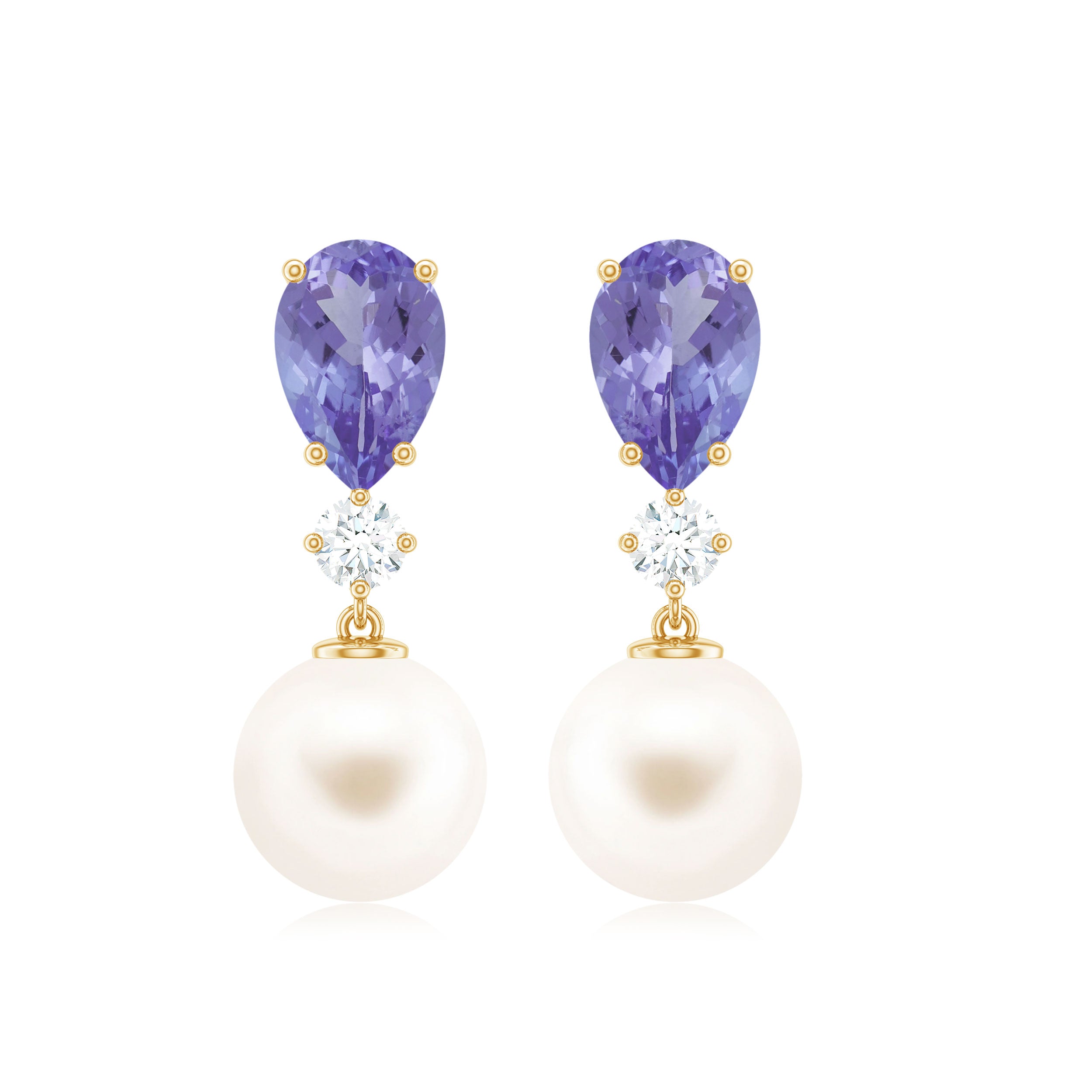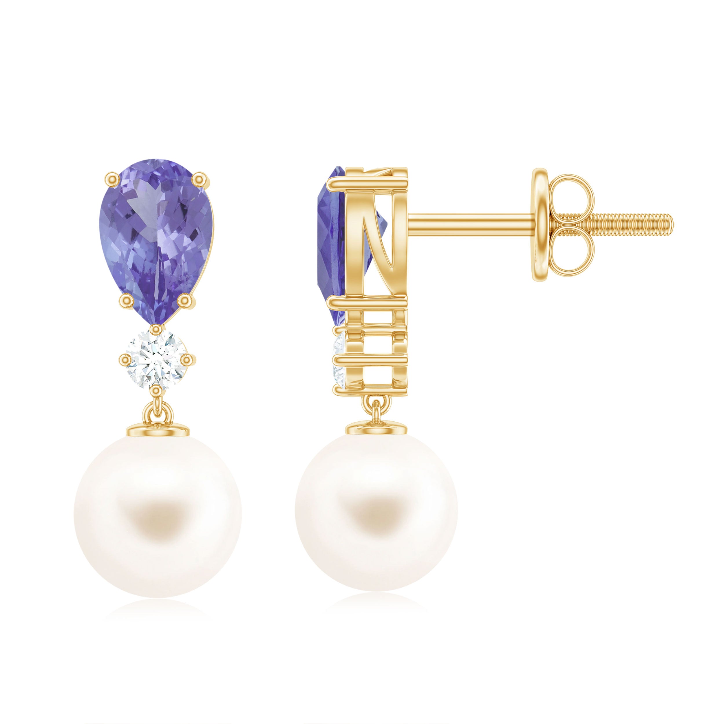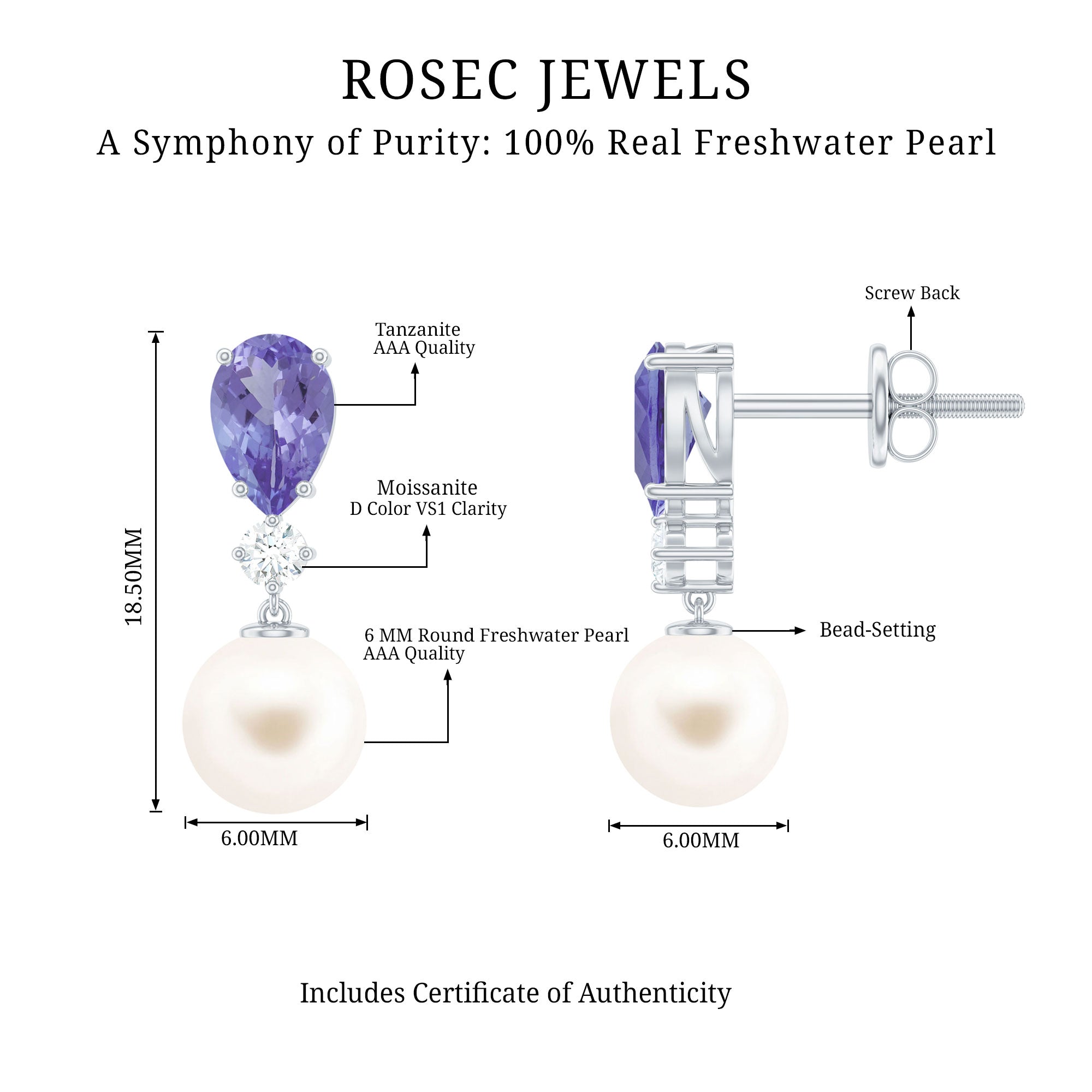 Get ready for your party look when you wear these Pearl Drop Earrings. Featuring Round Shape Freshwater Pearl in Bead Setting as Drop, additionally for more brilliance the Tanzanite and Moissanite stones makes this jewelry a must have for your collection.
