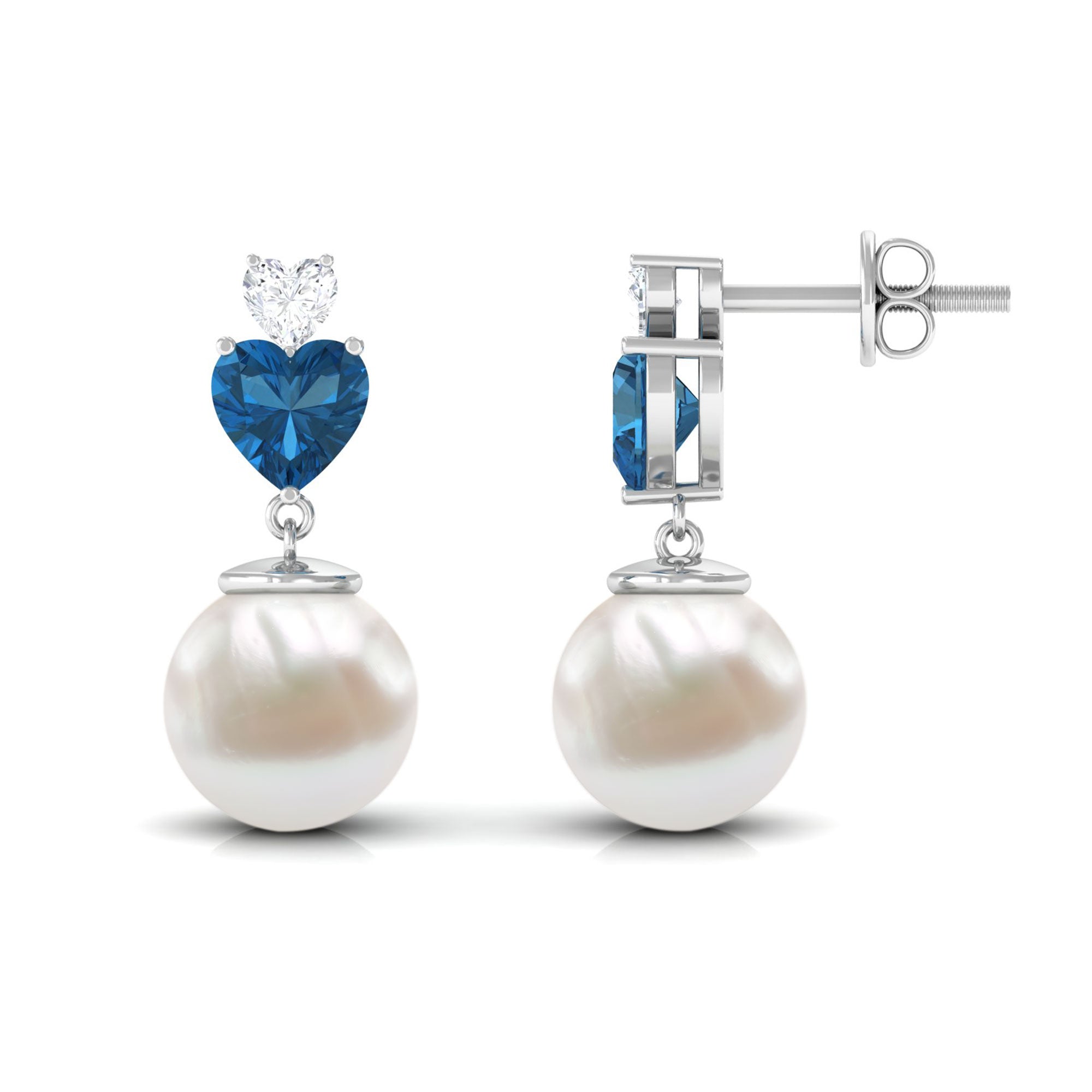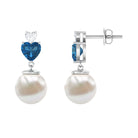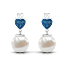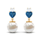 Freshwater Pearl Heart Stud Drop Earrings with London Blue Topaz and Moissanite