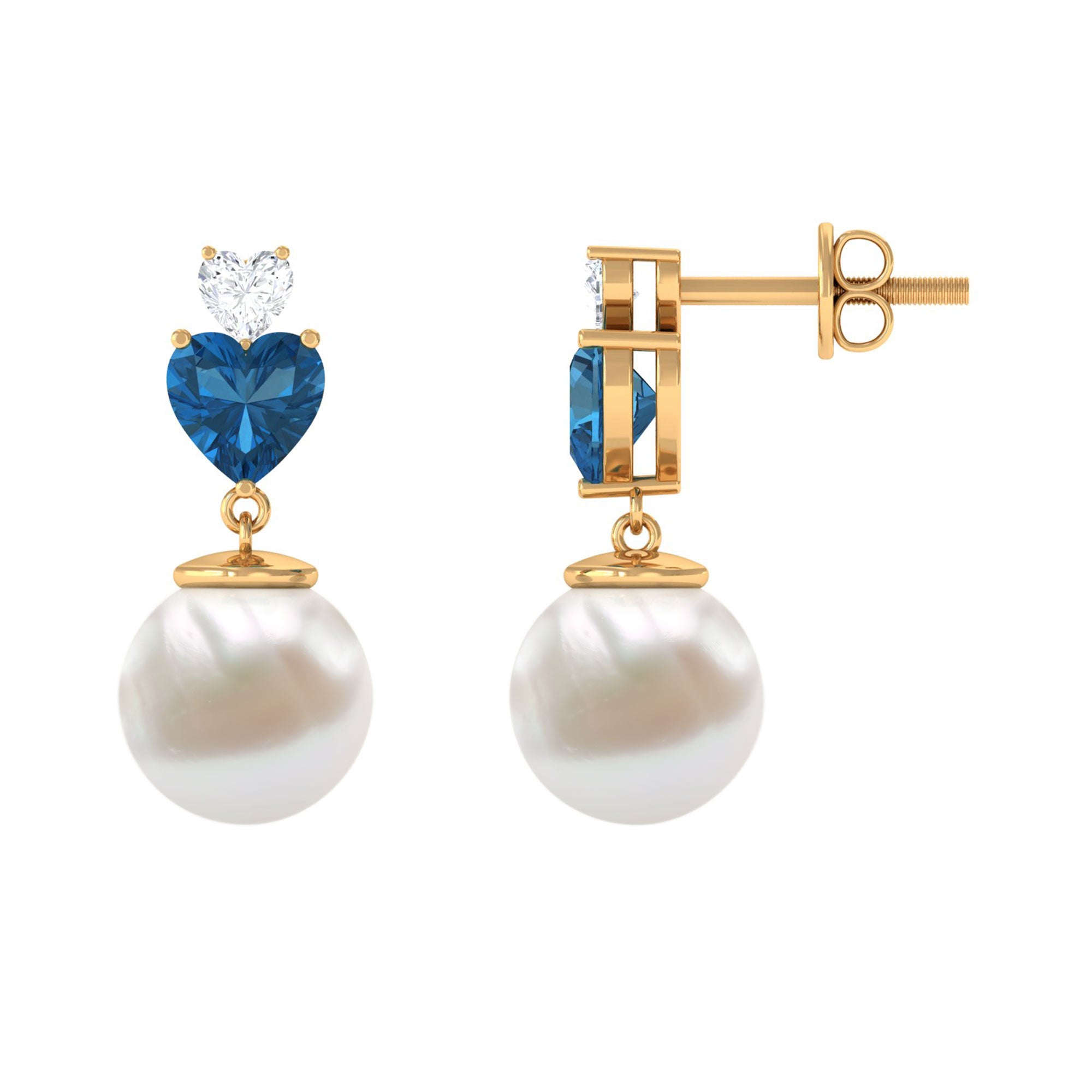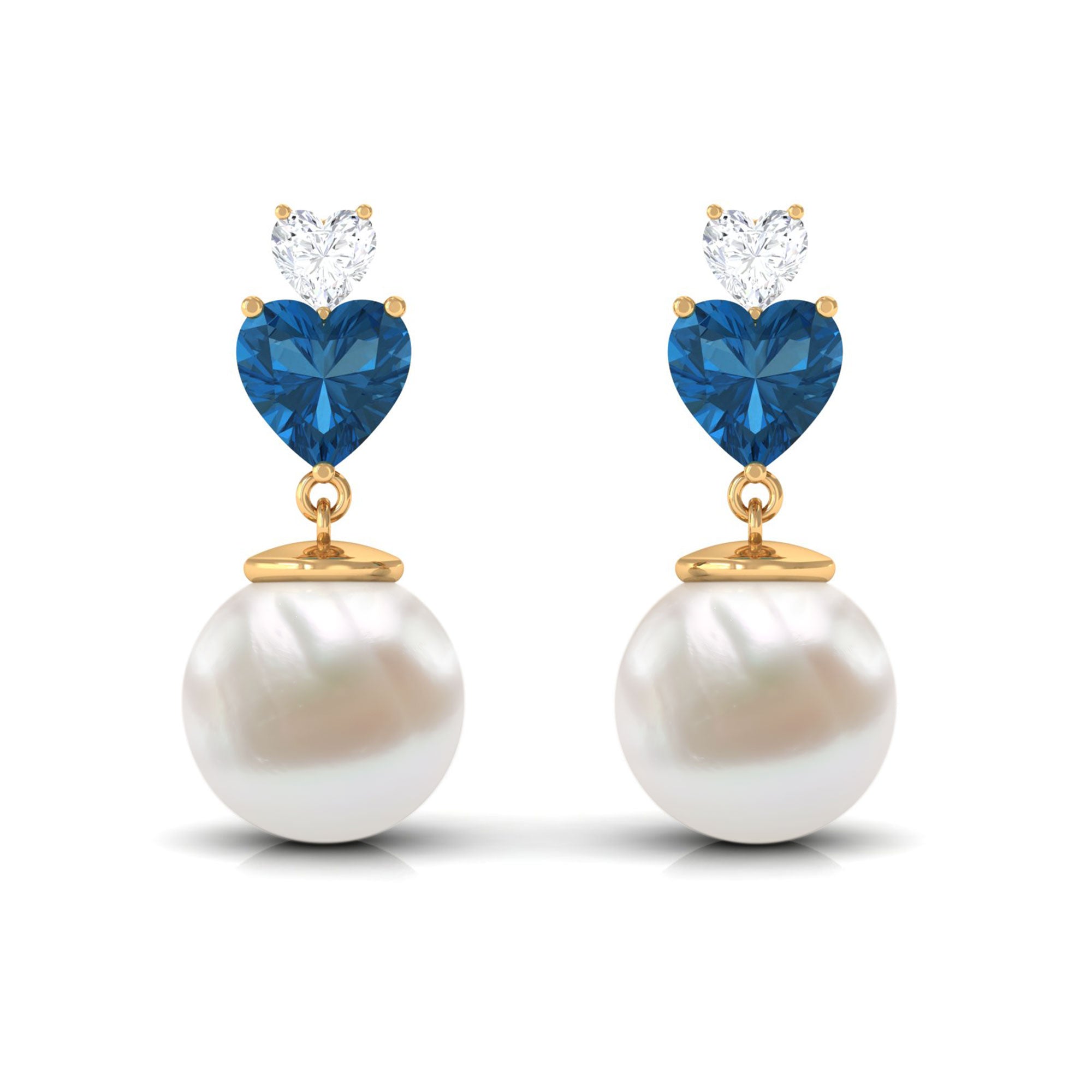 Strengthen the bond of your love by presenting these beautiful Freshwater Pearl Earrings. These Drop Earrings are embellished with Round Shape Freshwater Pearl and Heart Shape London Blue Topaz and Moissanite. These Pearl and Moissanite Earrings are crafted in Gold to make them a piece of women Fine jewelry. Buy These Classic Pearl Heart Drop Earring today and surprise your love.