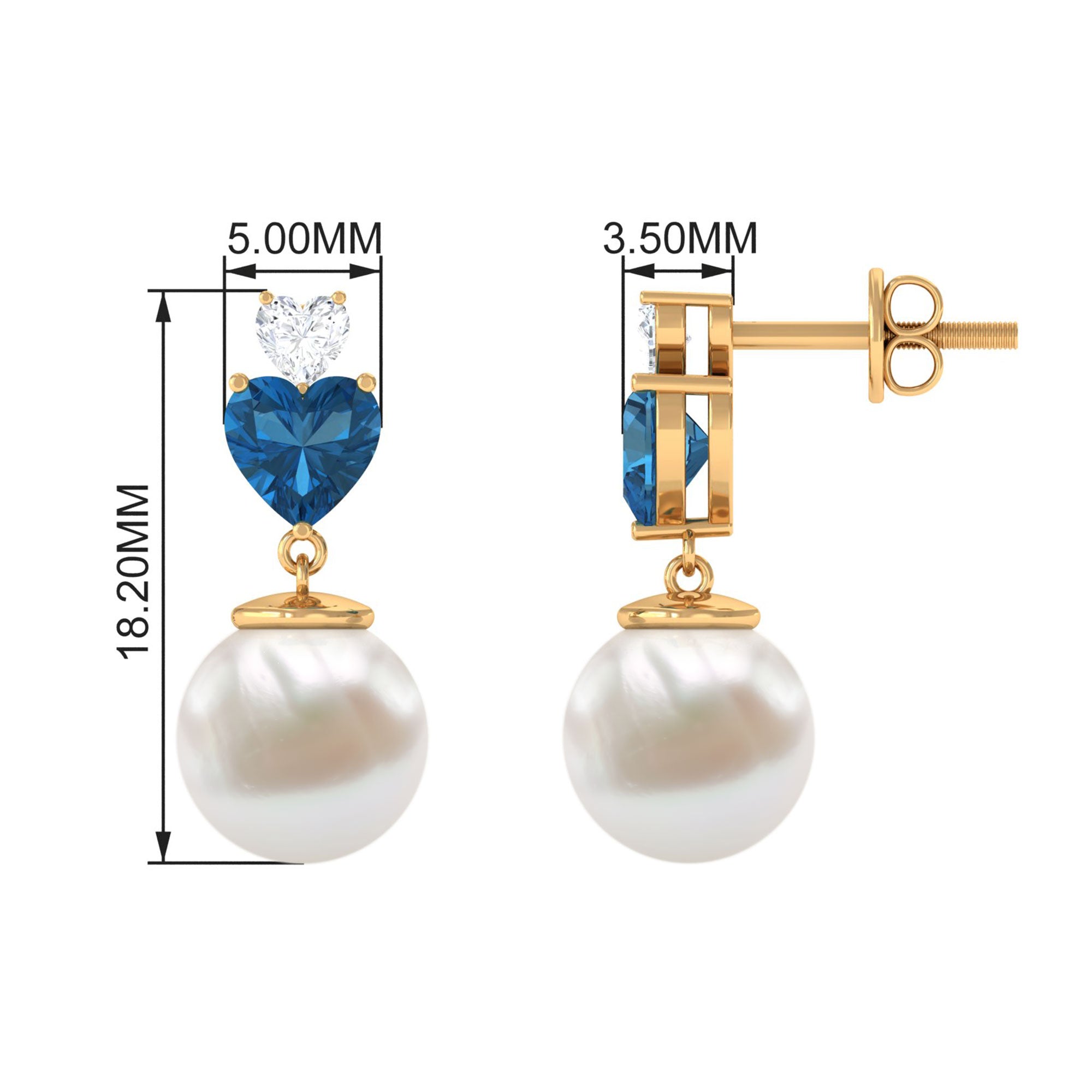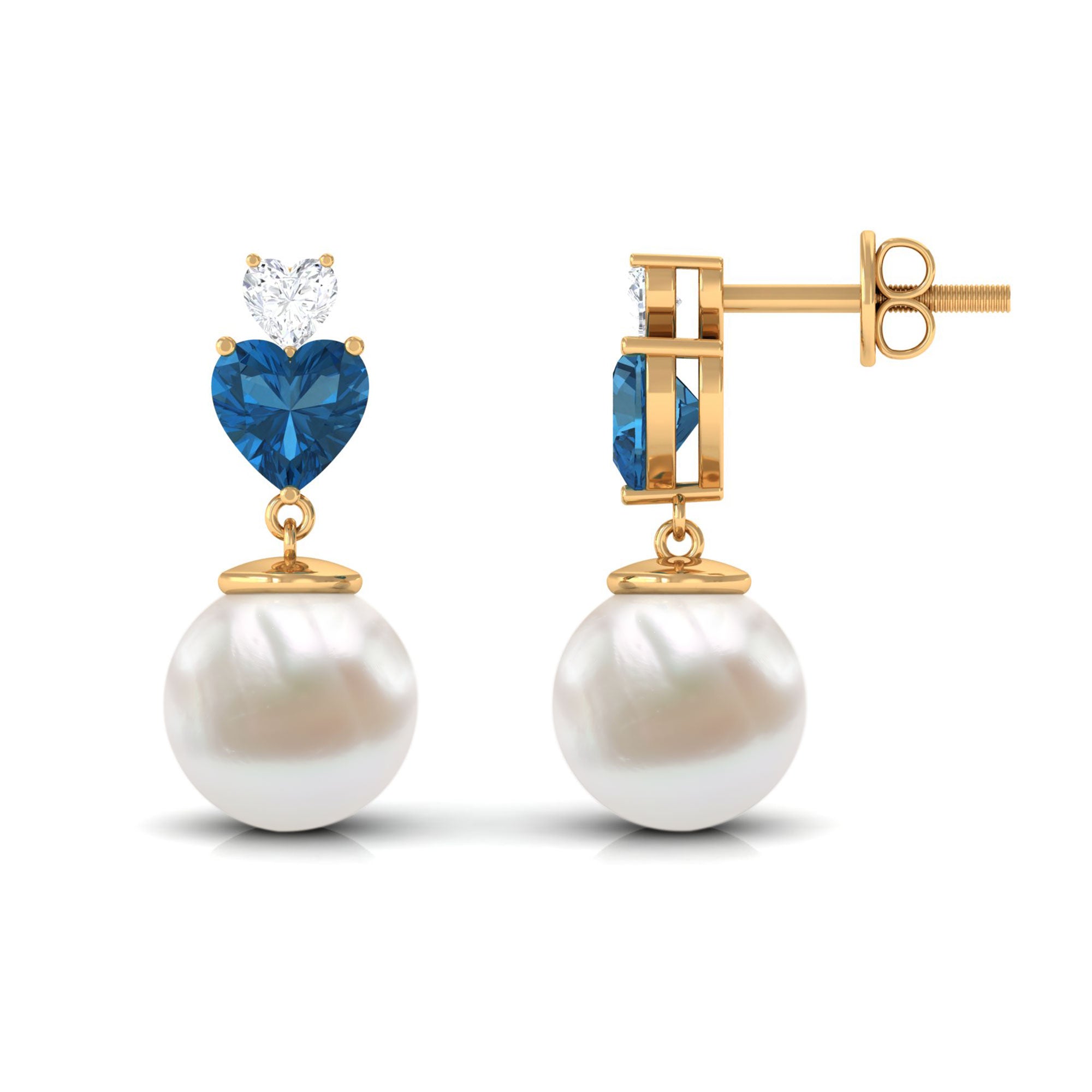Strengthen the bond of your love by presenting these beautiful Freshwater Pearl Earrings. These Drop Earrings are embellished with Round Shape Freshwater Pearl and Heart Shape London Blue Topaz and Moissanite. These Pearl and Moissanite Earrings are crafted in Gold to make them a piece of women Fine jewelry. Buy These Classic Pearl Heart Drop Earring today and surprise your love.