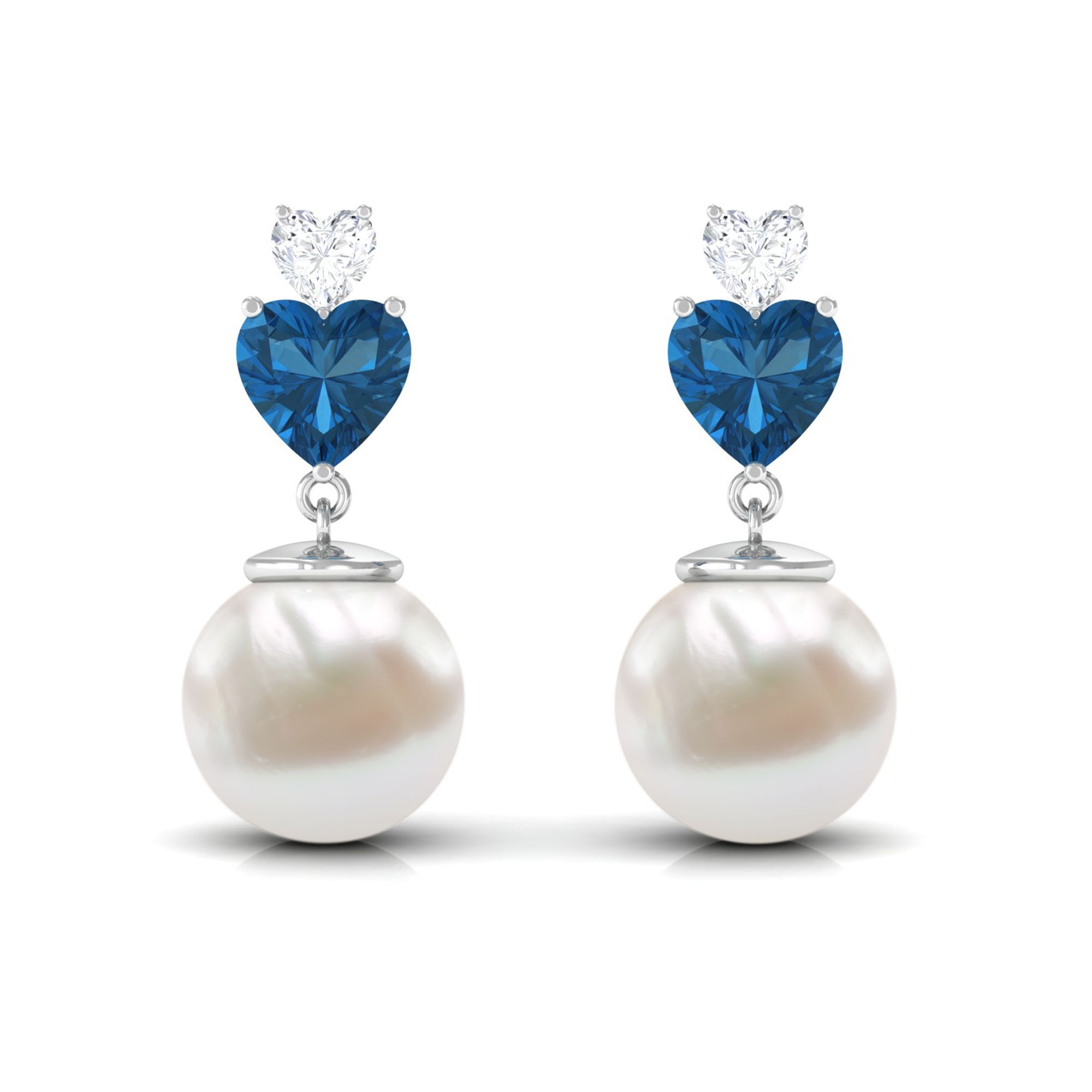 Freshwater Pearl Heart Stud Drop Earrings with London Blue Topaz and Moissanite